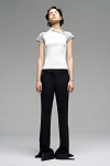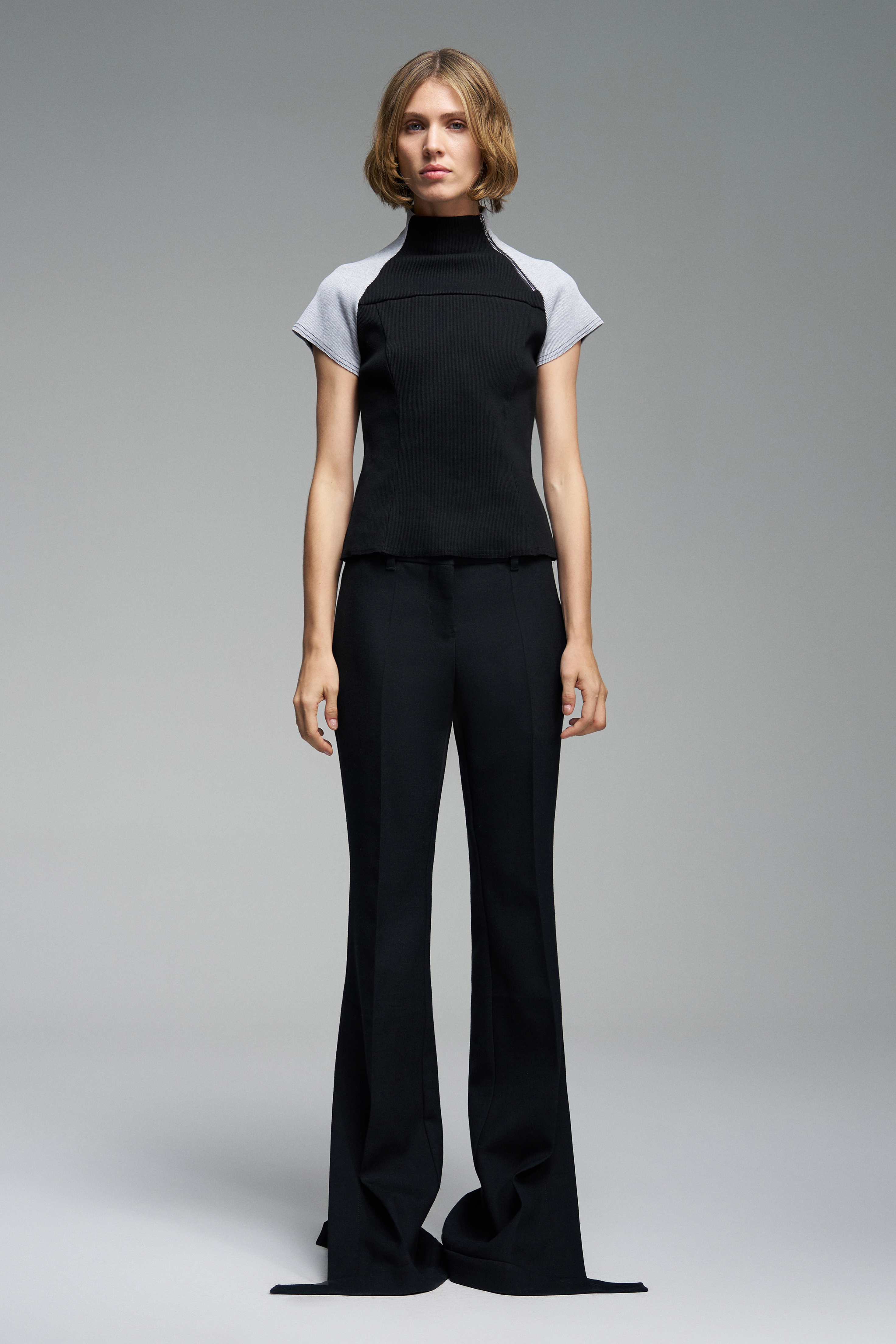 Эластичный топ с приталенным силуэтом и высоким воротником. Функциональная деталь — декоративный замок на верхней части.