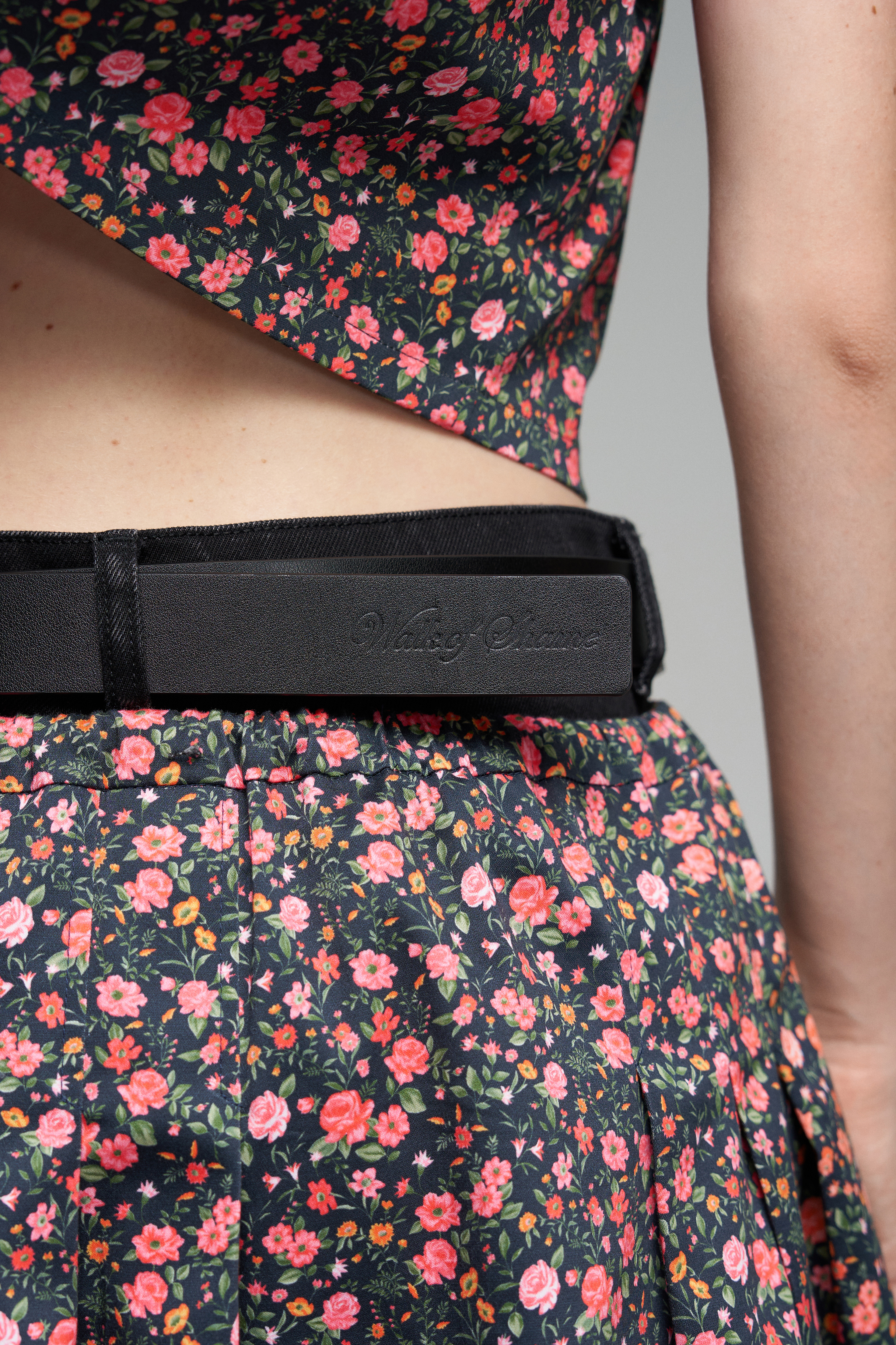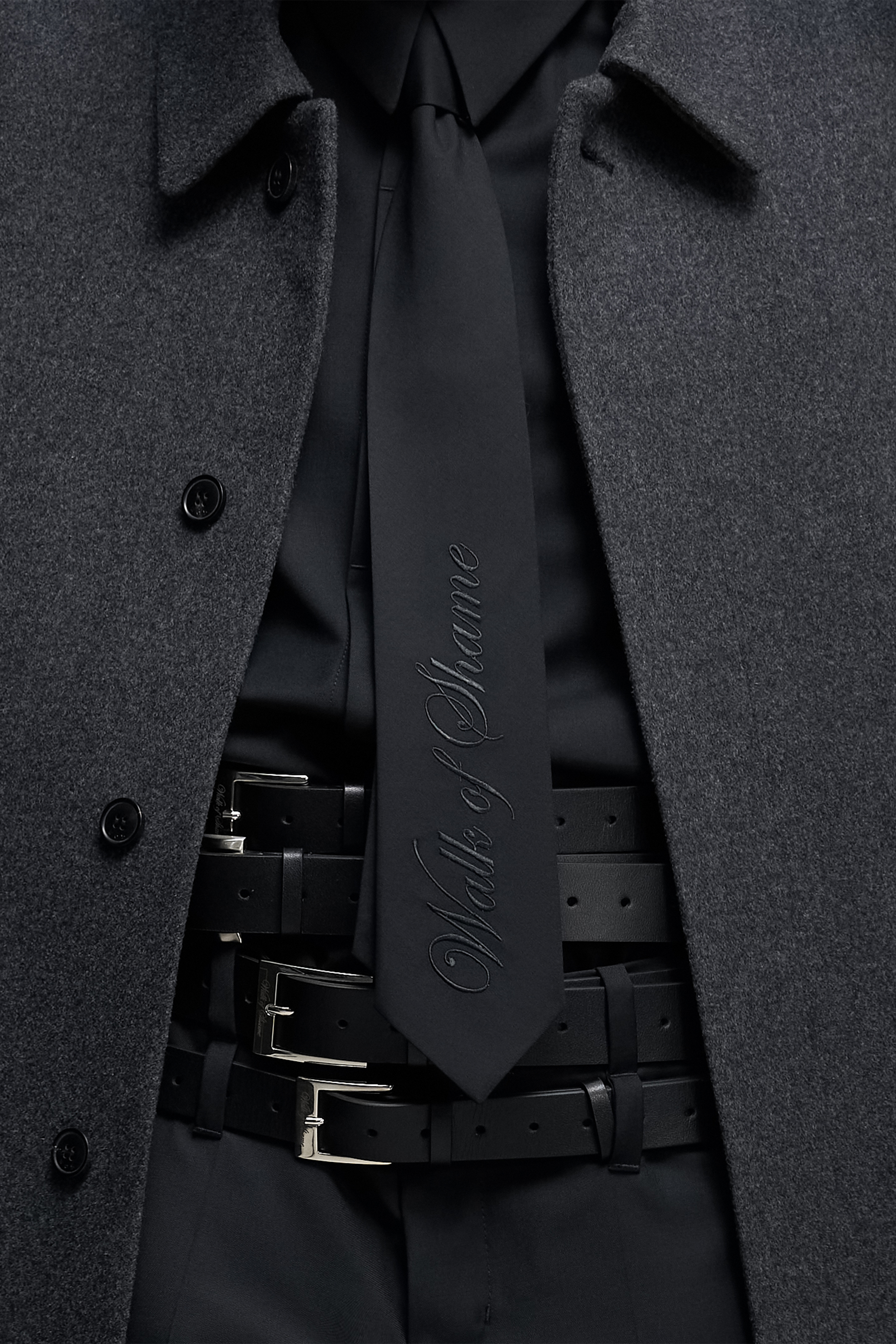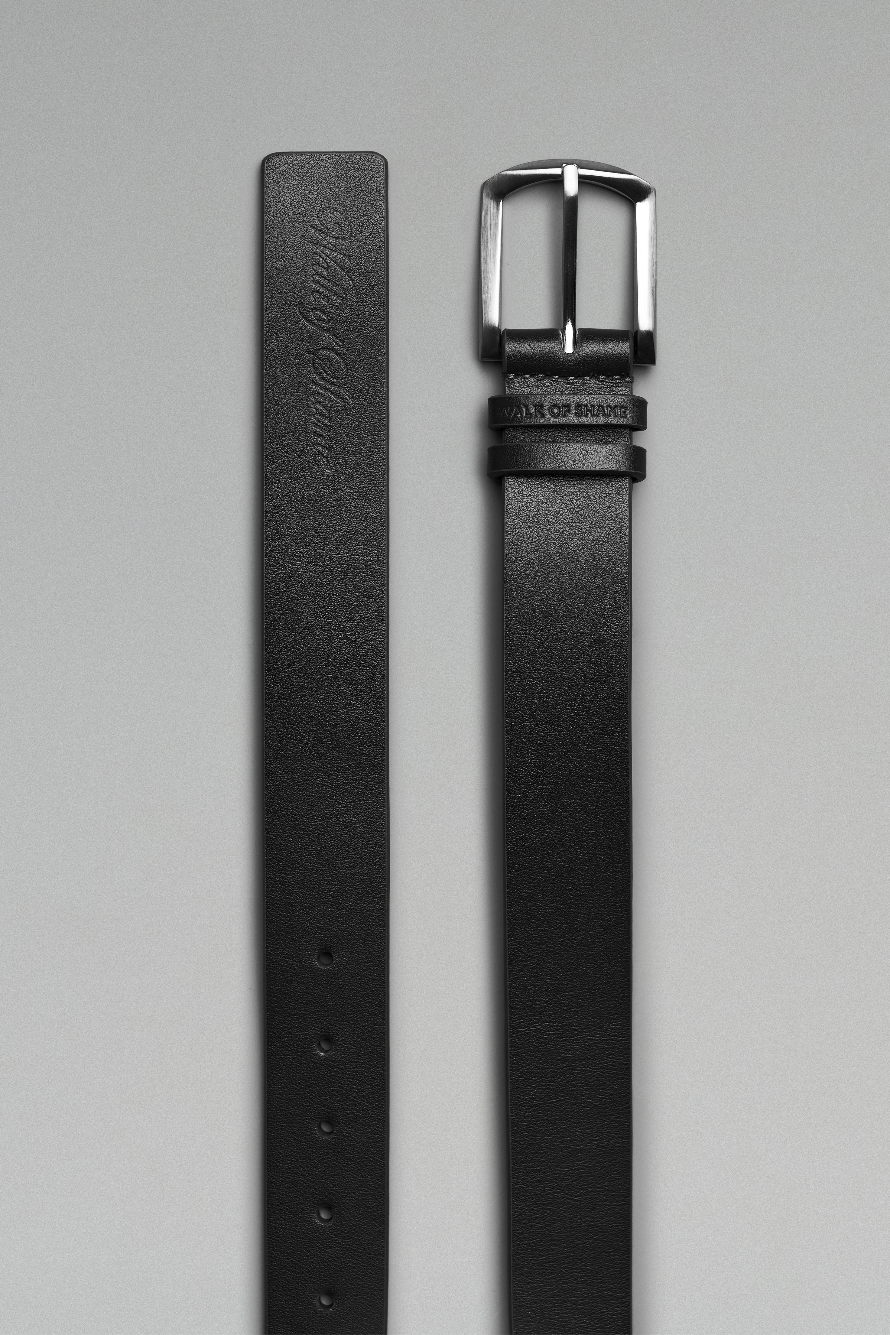 Черный кожаный ремень длиной 140 см с квадратной металлической пряжкой серебристого цвета.