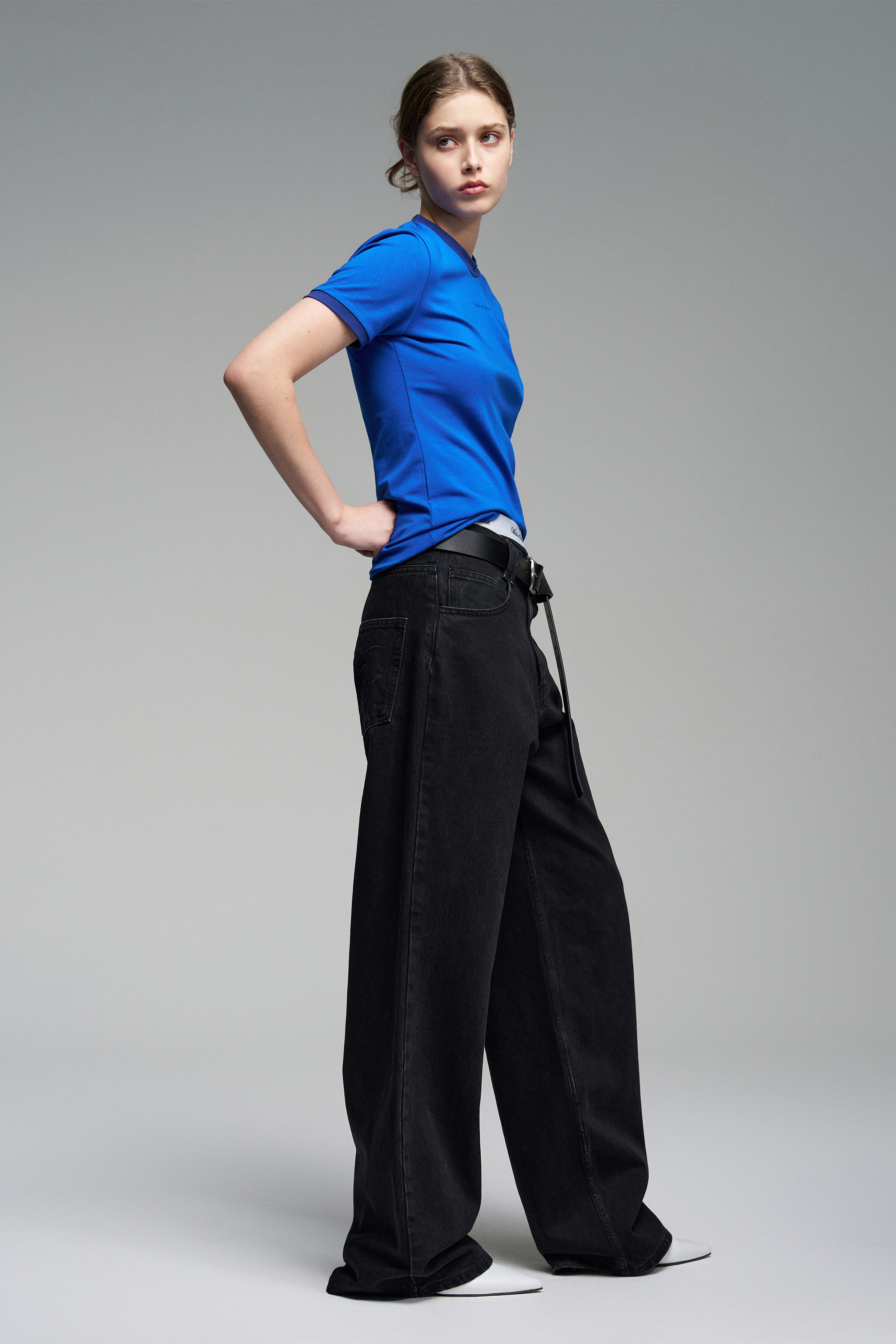 Футболка с кантами и шелкографией бренда на груди в тон изделия. Модель приталенного силуэта.