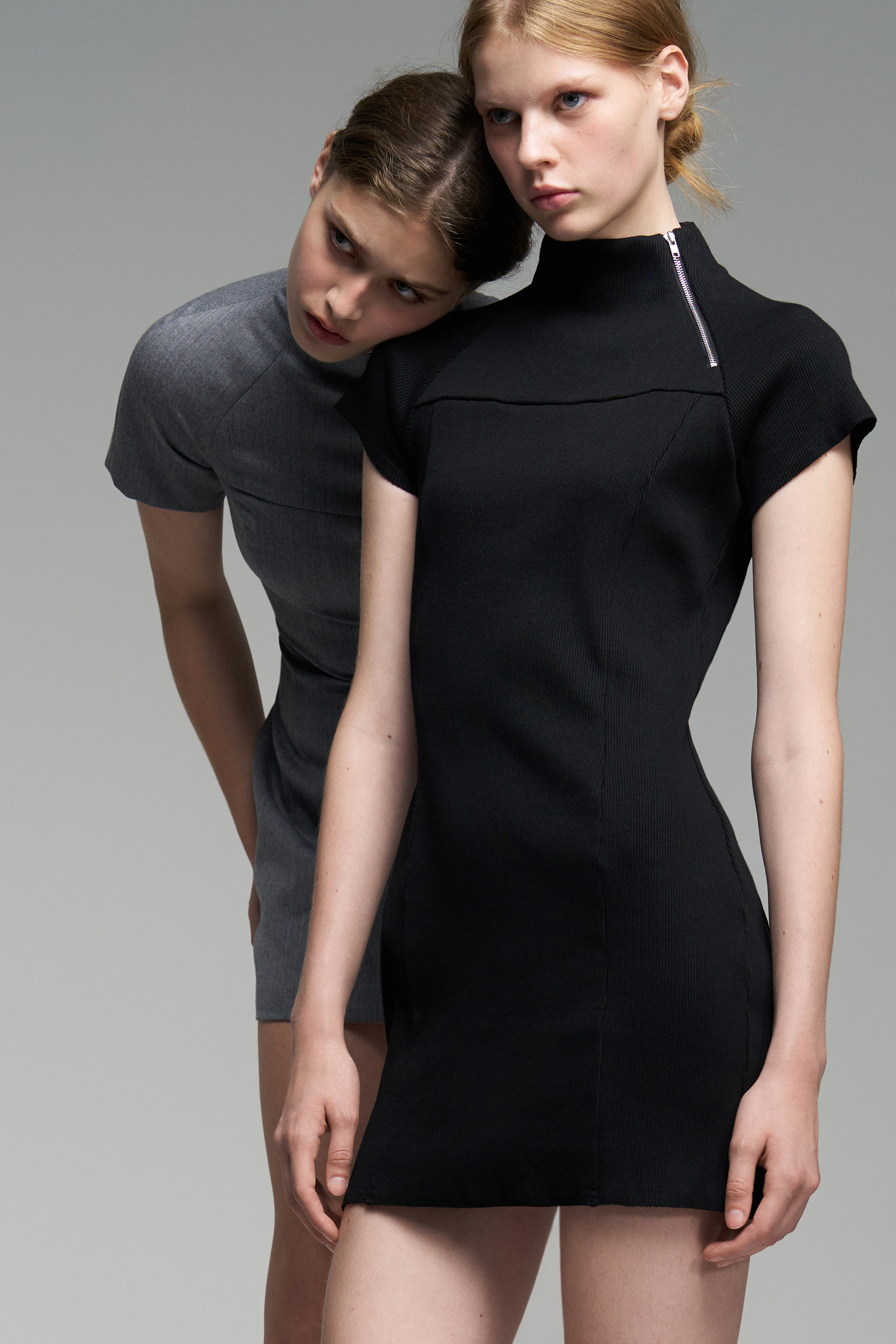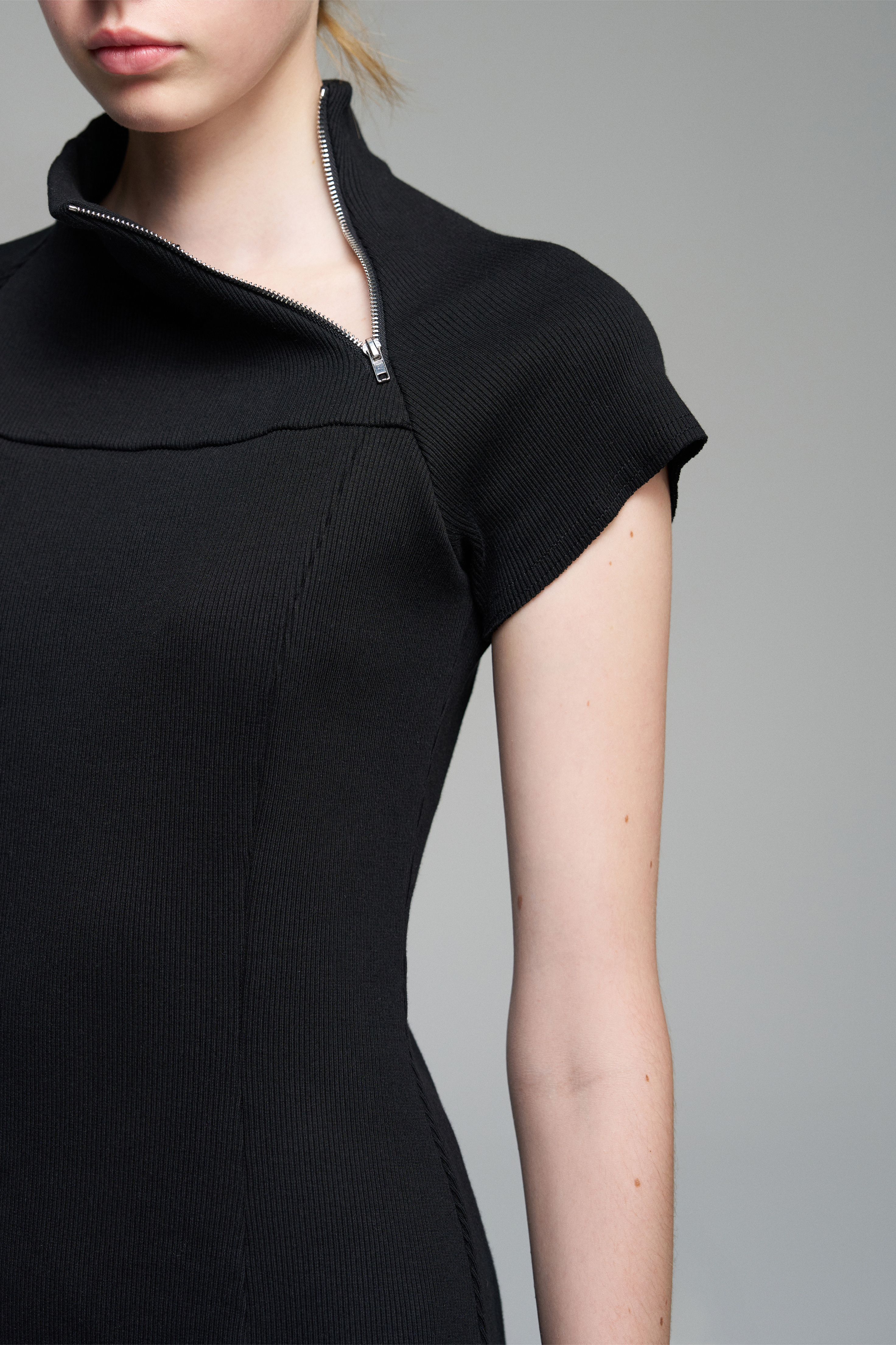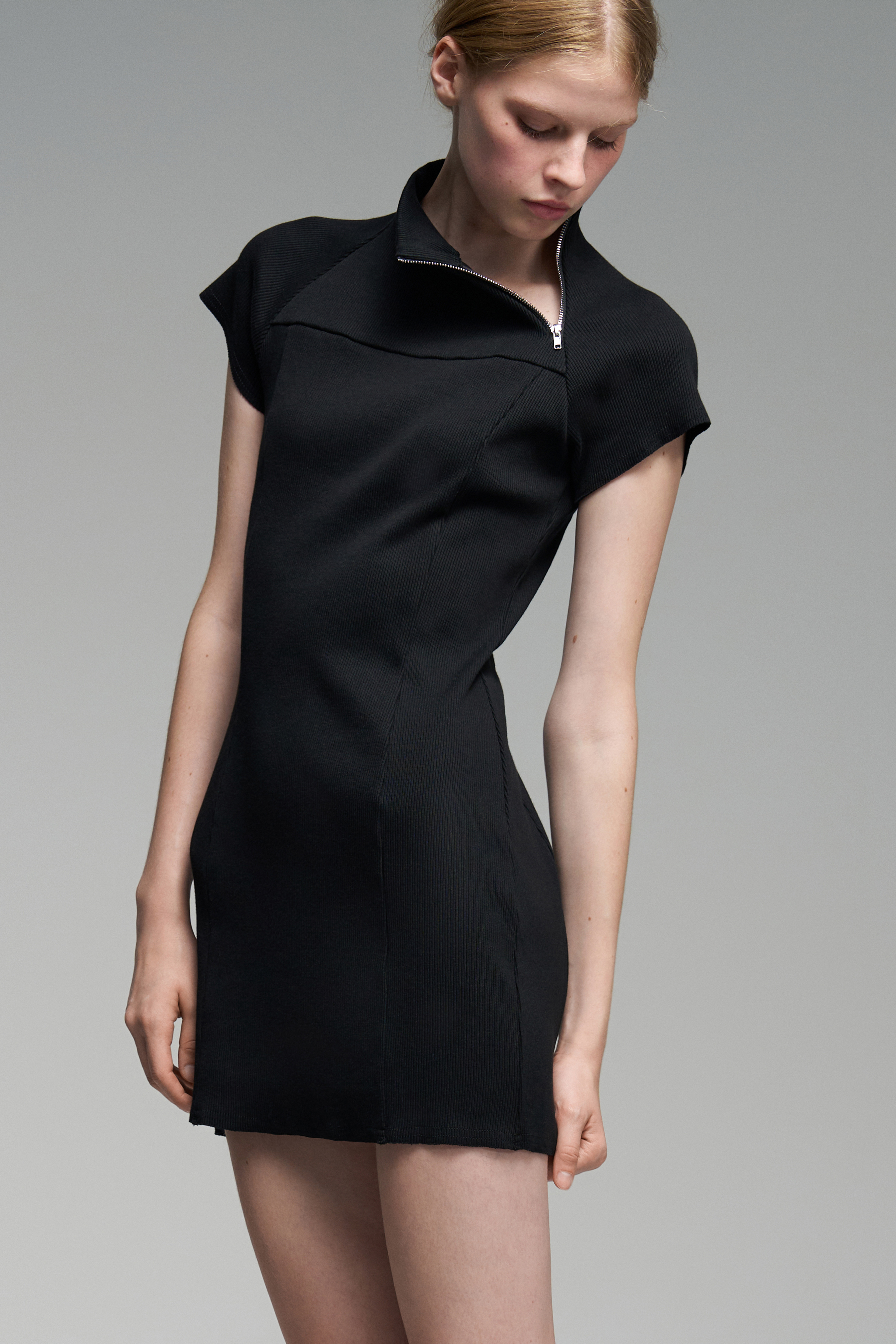 Платье мини из эластичной ткани — кашкорсе. Приталенный силуэт, скрытая застёжка сбоку. На верхней части изделия — функциональная молния.