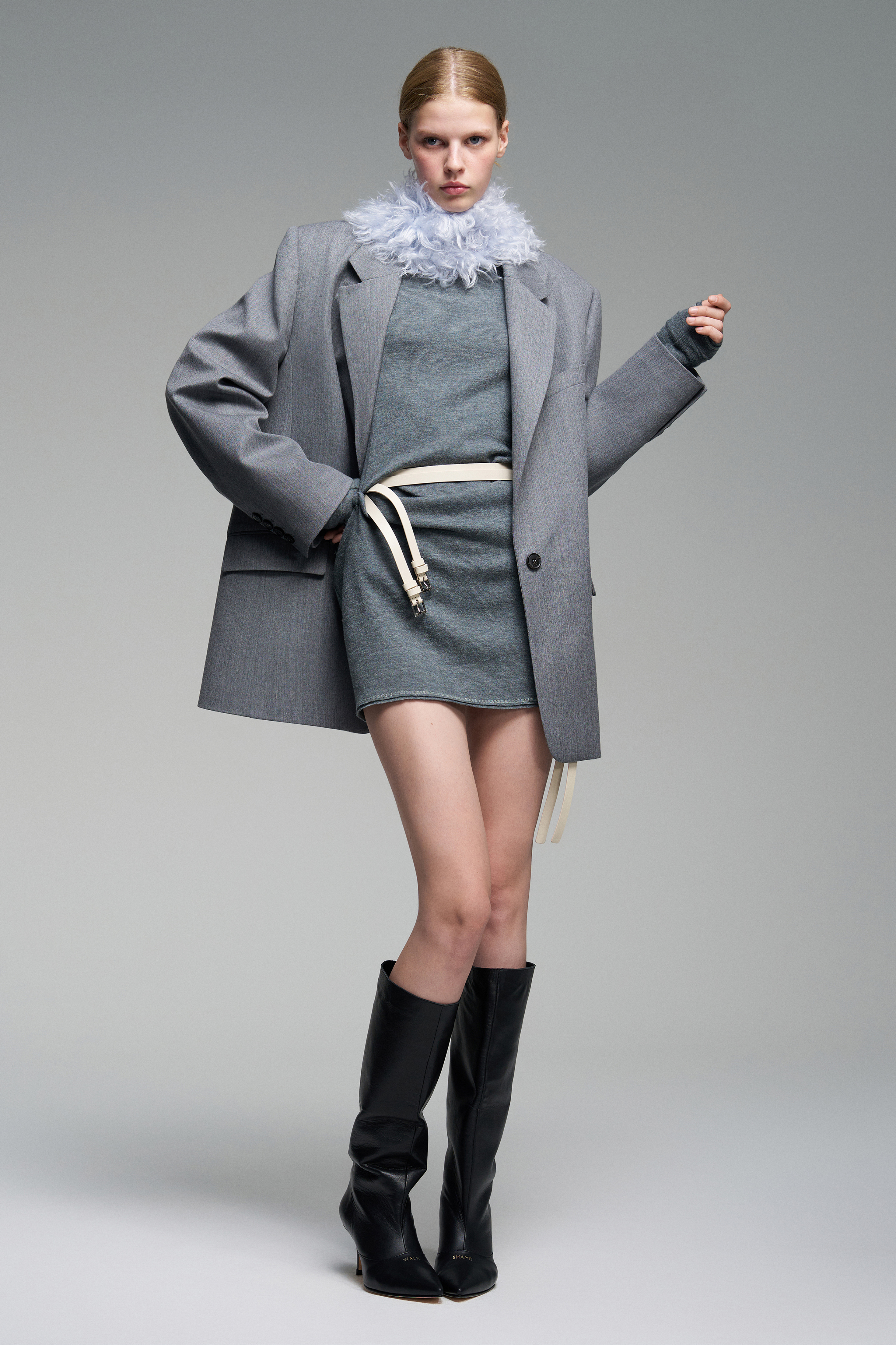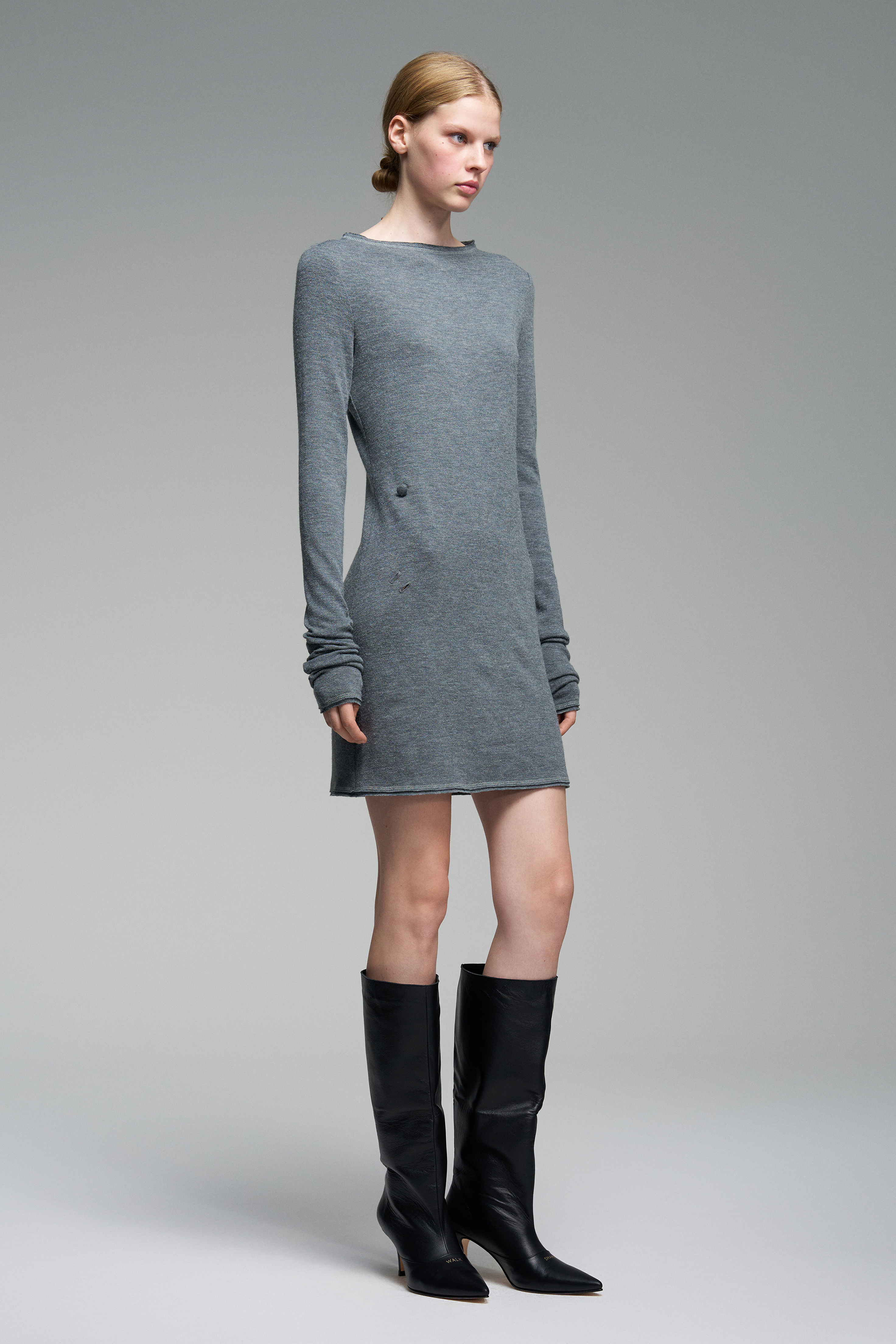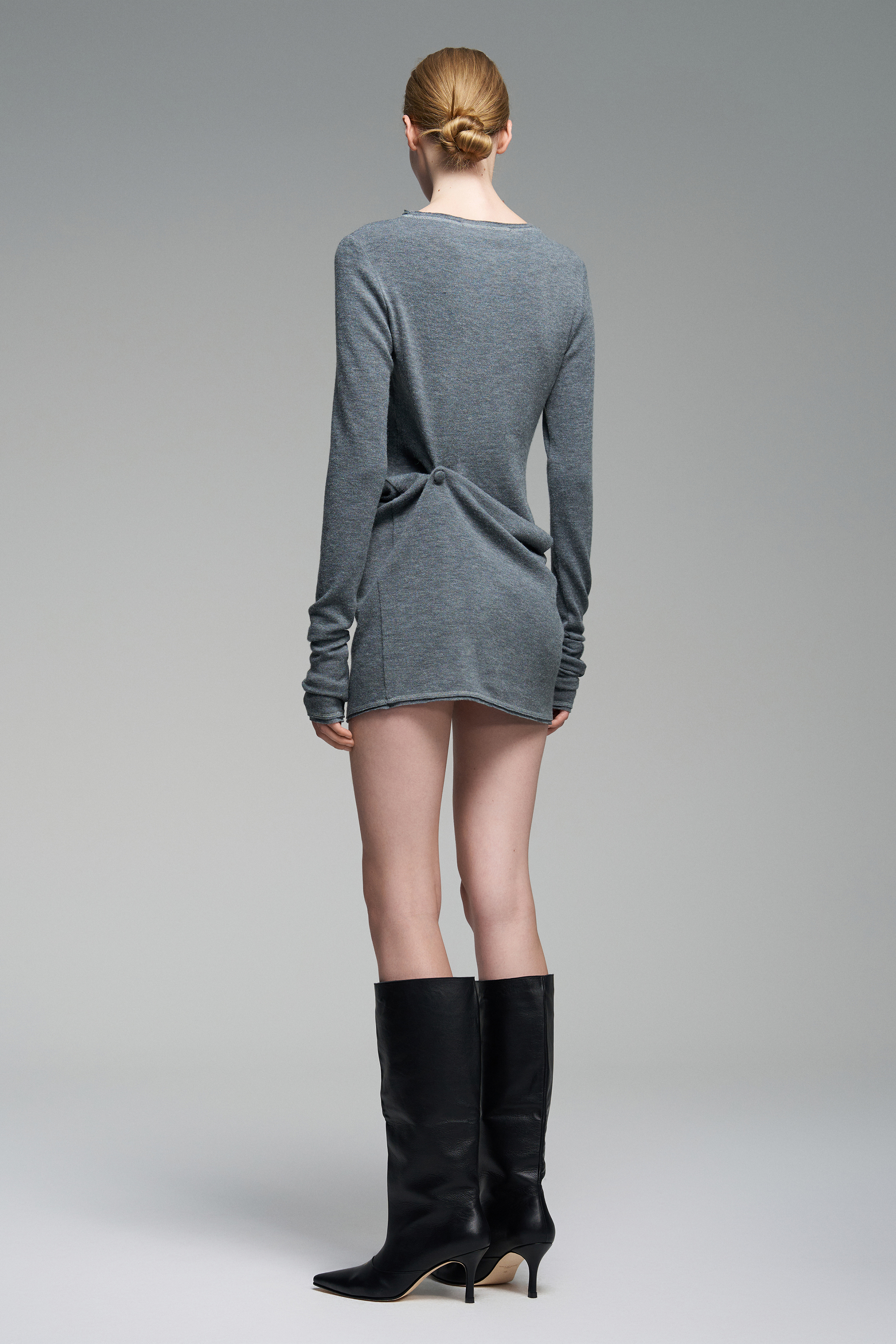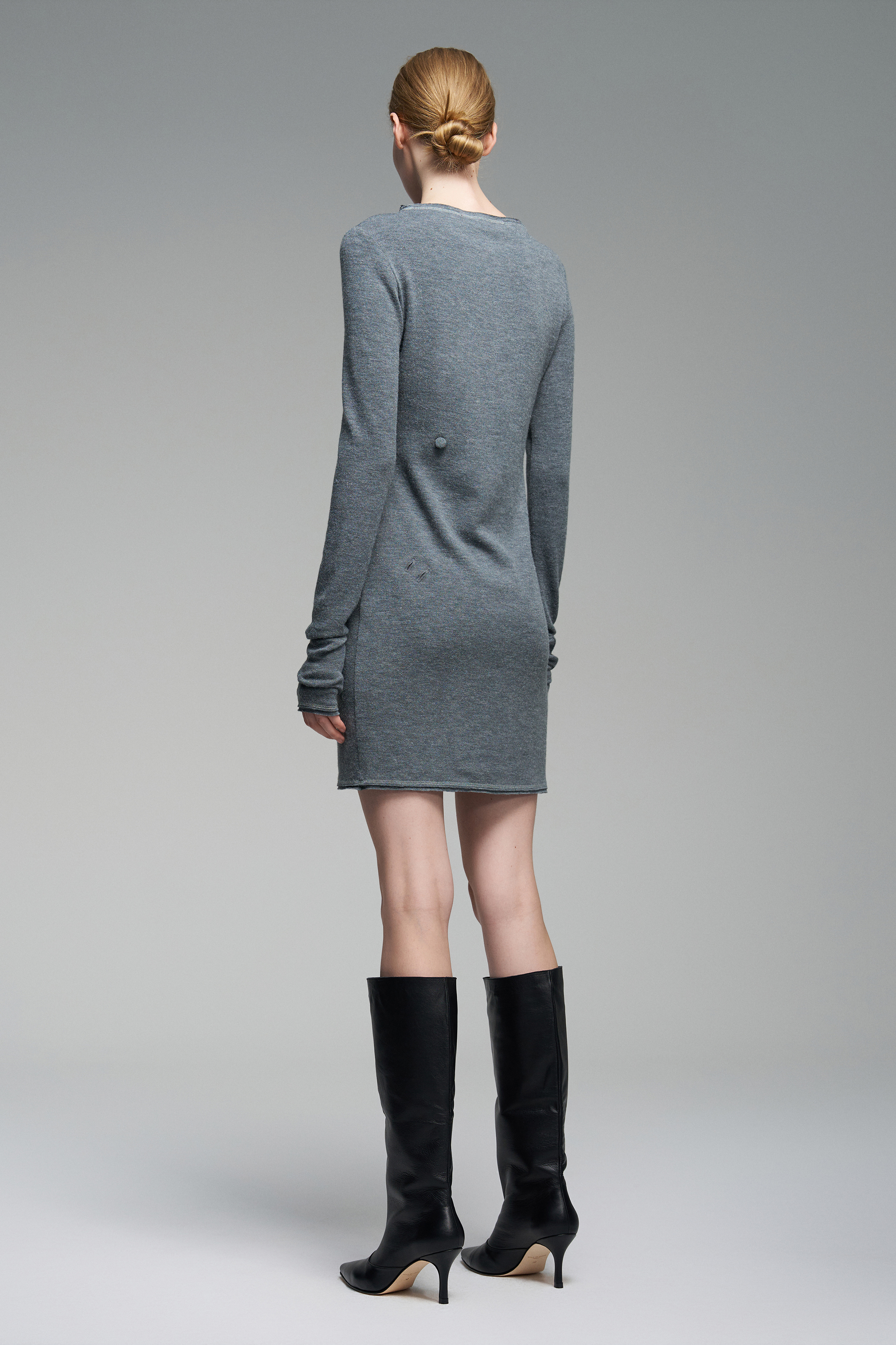 Платье из серого трикотажа с обработанным сырым срезом по краям. Спереди и сзади — обтянутые тканью пуговицы и две петли для формирования драпировки. Вырез лодочка, изделие эластичное и может носиться со спущенными на плечами.