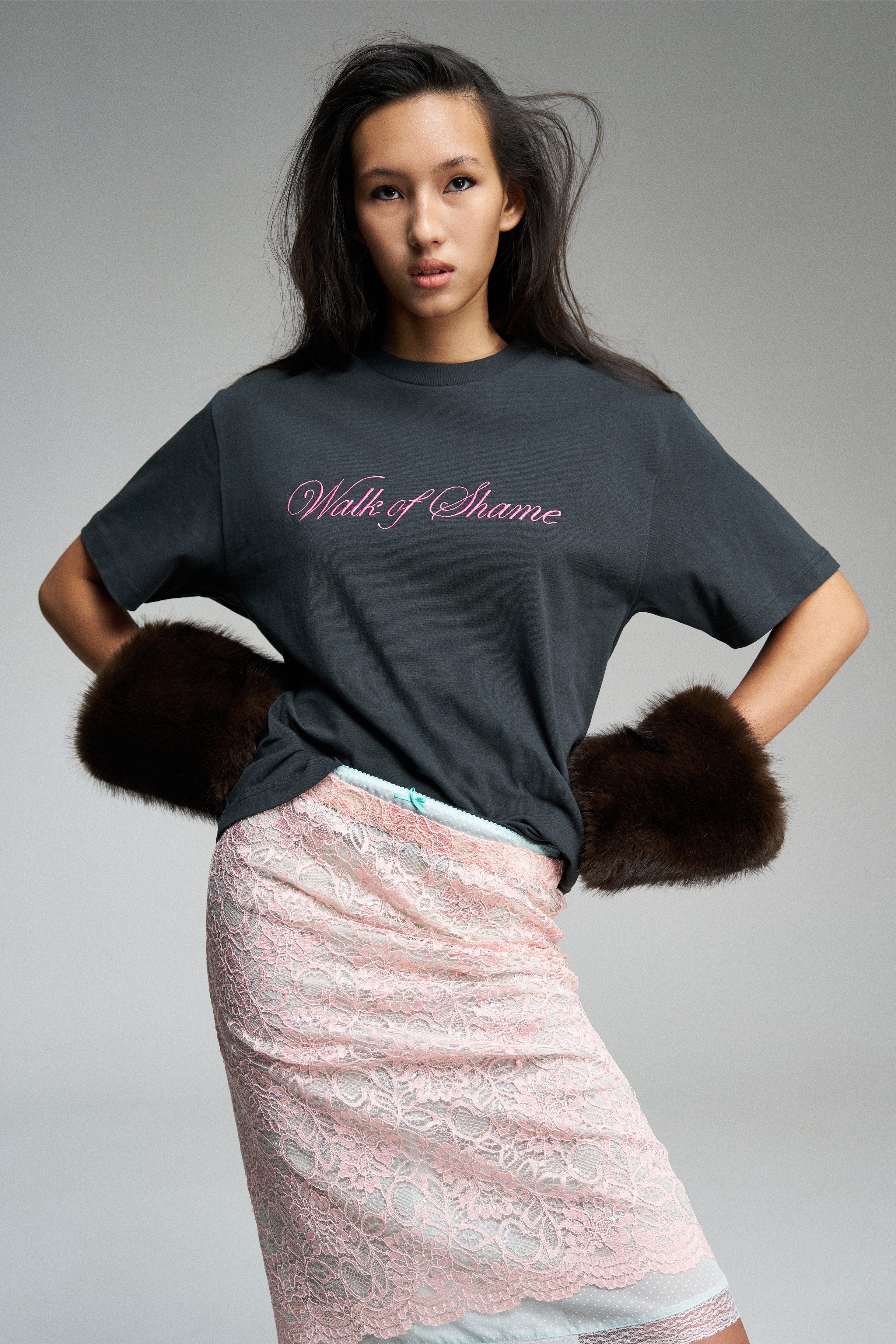 Футболка произведена в Португалии. Вышивка бренда Walk of Shame на груди. Футболка свободного кроя с круглым вырезом горловины.