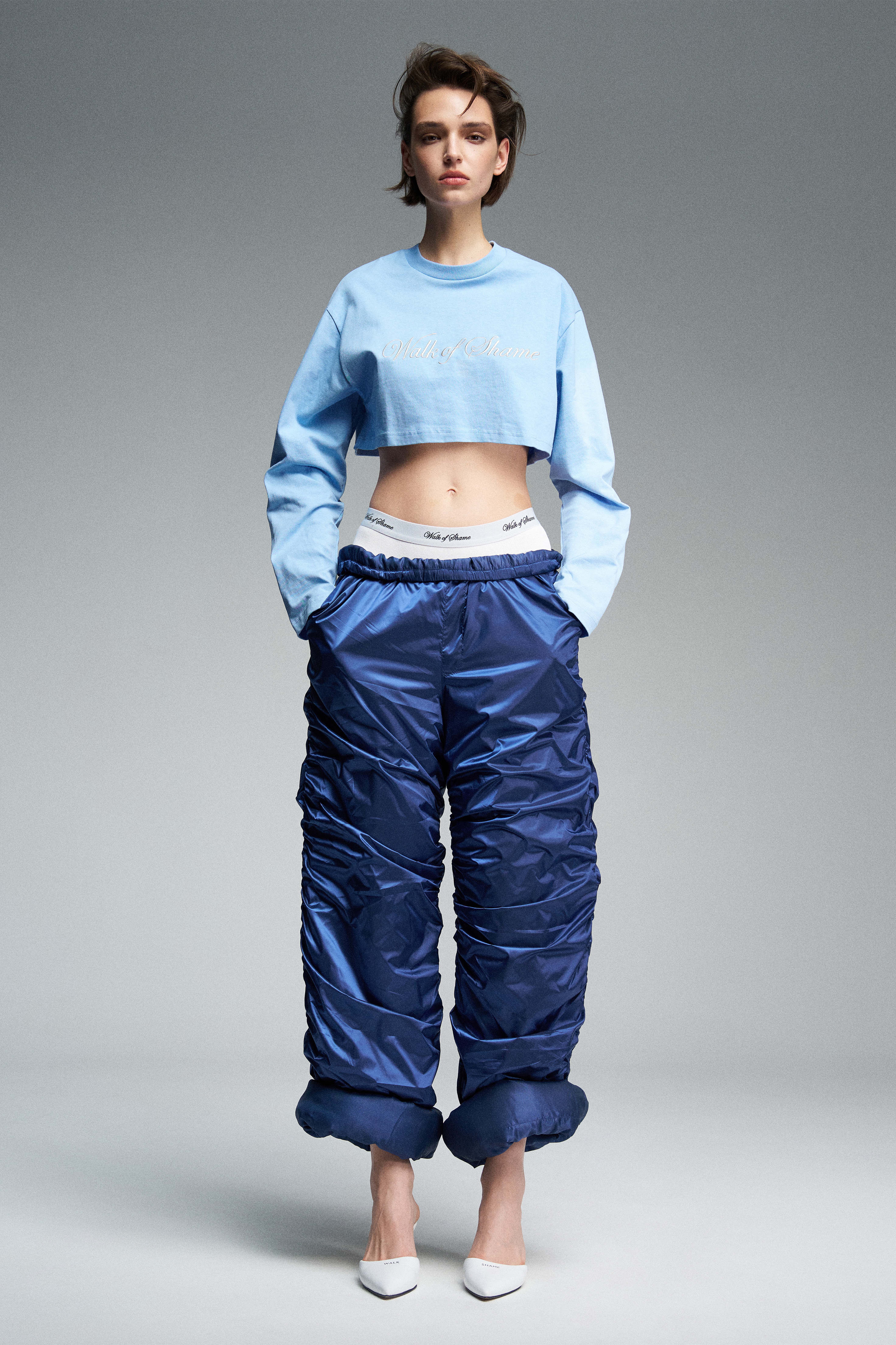 Кроп-лонгслив из португальской ткани с вышивкой логотипа бренда. Мягкий материал приятен к телу и хорошо держит форму, создавая чистый силуэт.