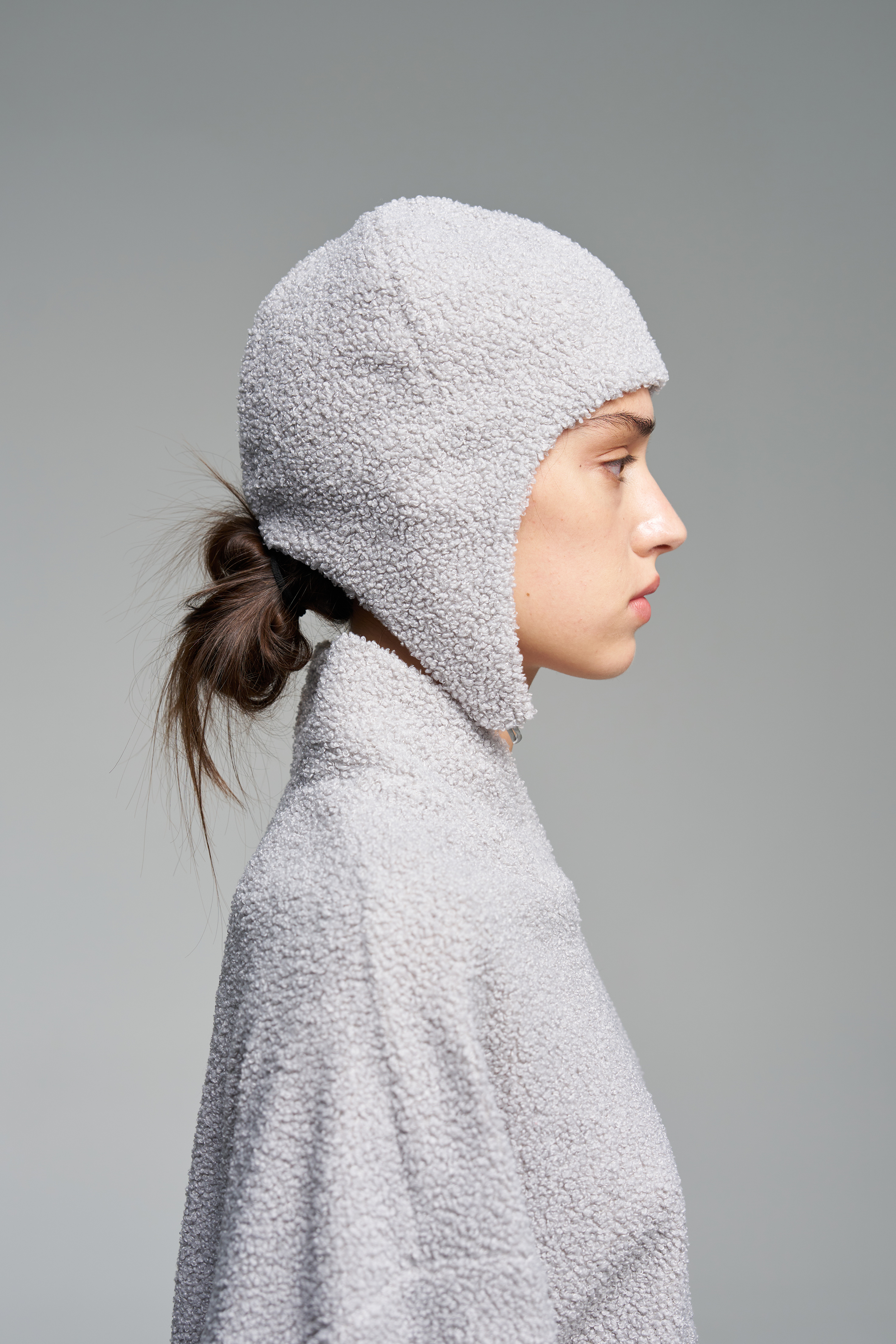 Шапка-шлем, плотно прилегающая по форме головы. Модель застёгивается на пуговицу под подбородком. Изделие из мягкой ткани с шелковой подкладкой.