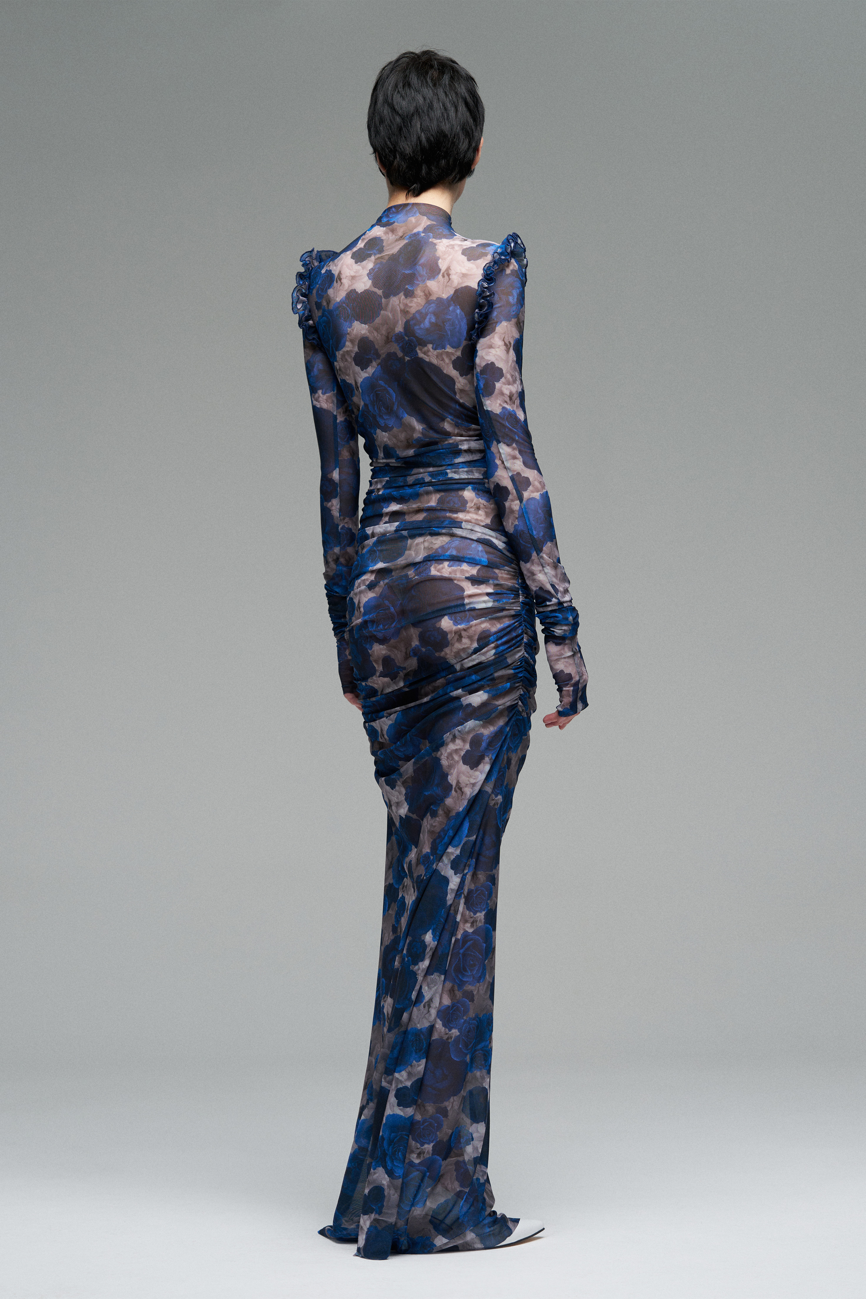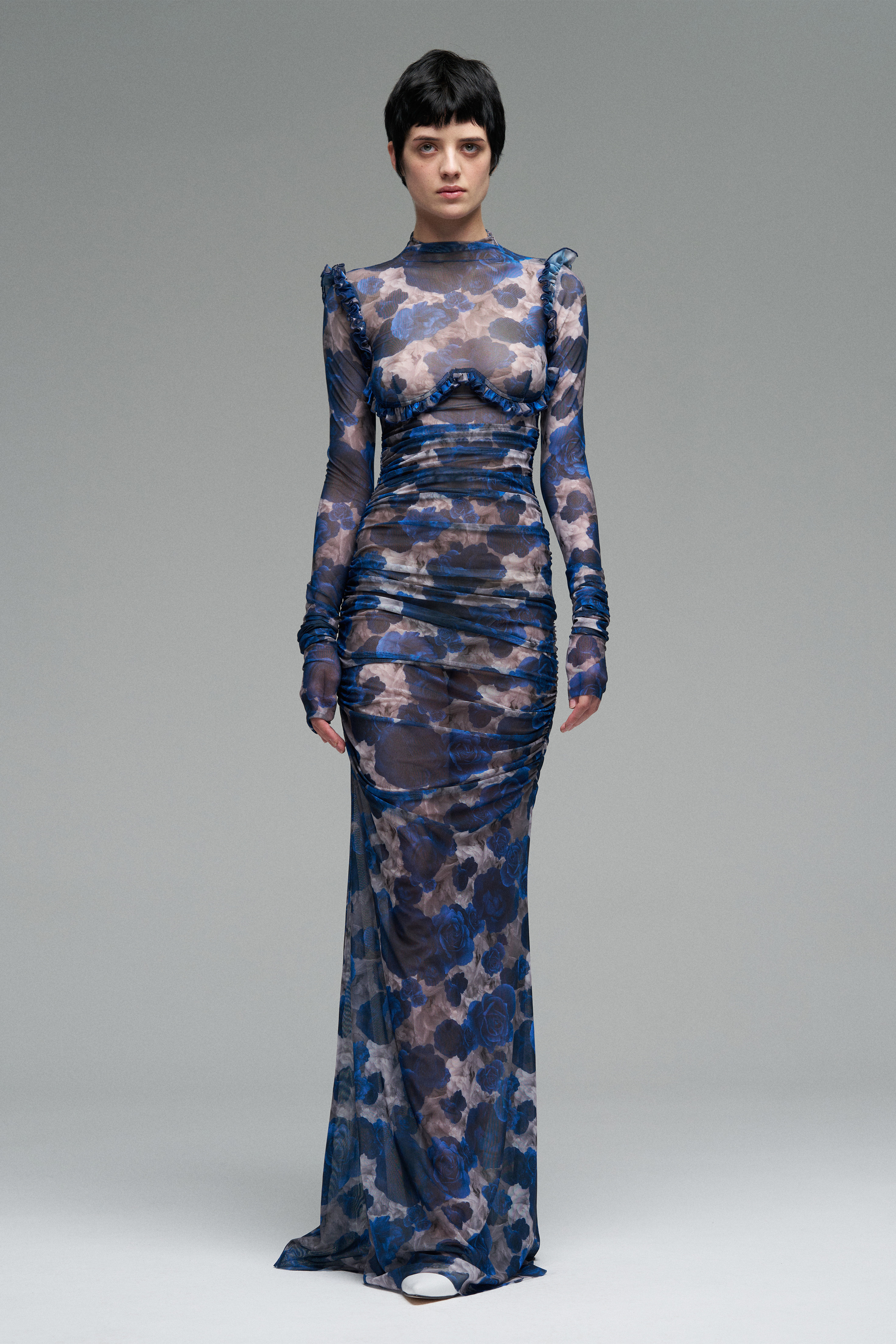 Платье из эластичной сетки с принтом роз. Полупрозрачная ткань мягко драпируется по телу, создавая акцент на силуэте. В конструкции — имитация косточек под грудью и рюши.