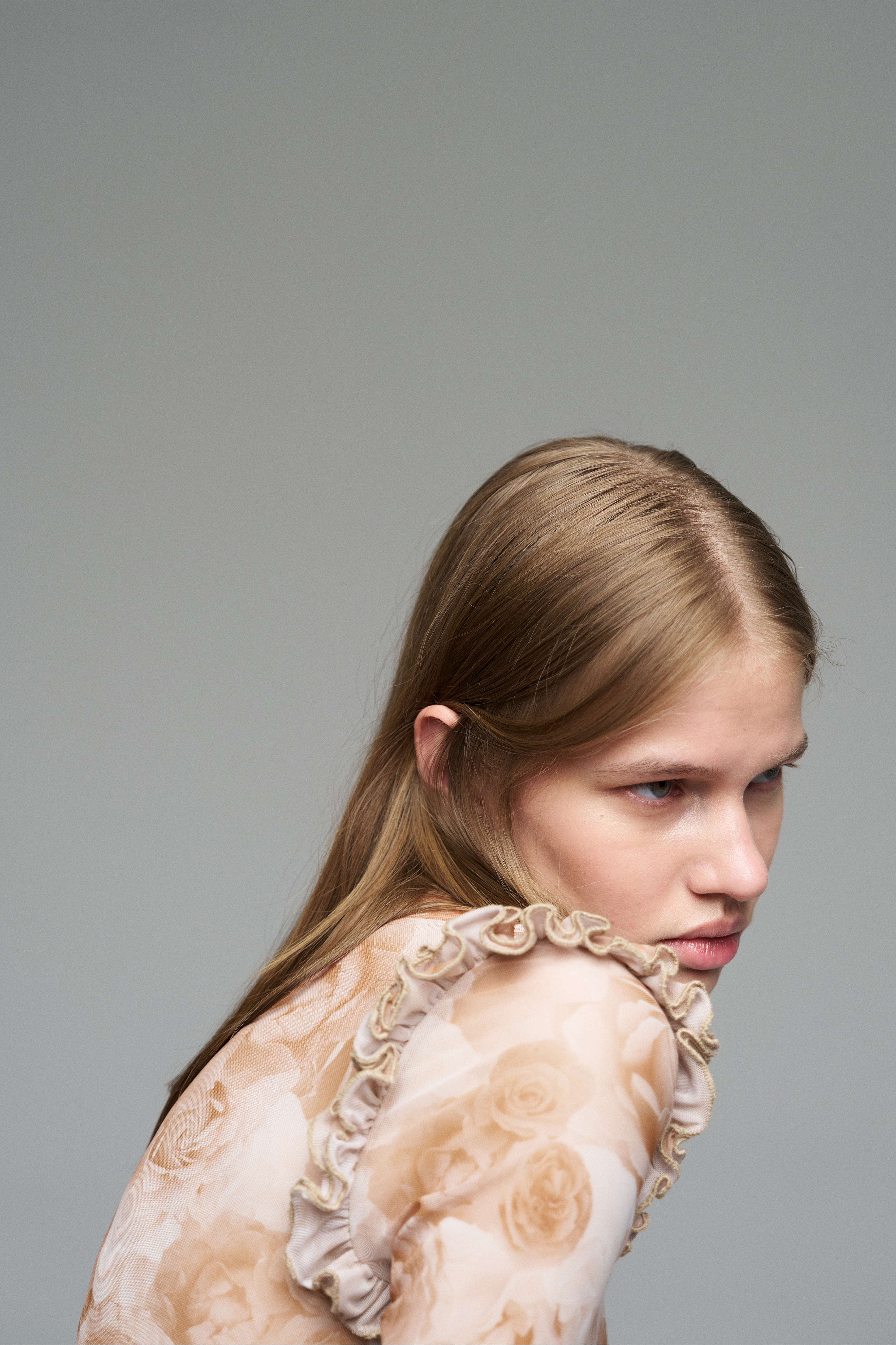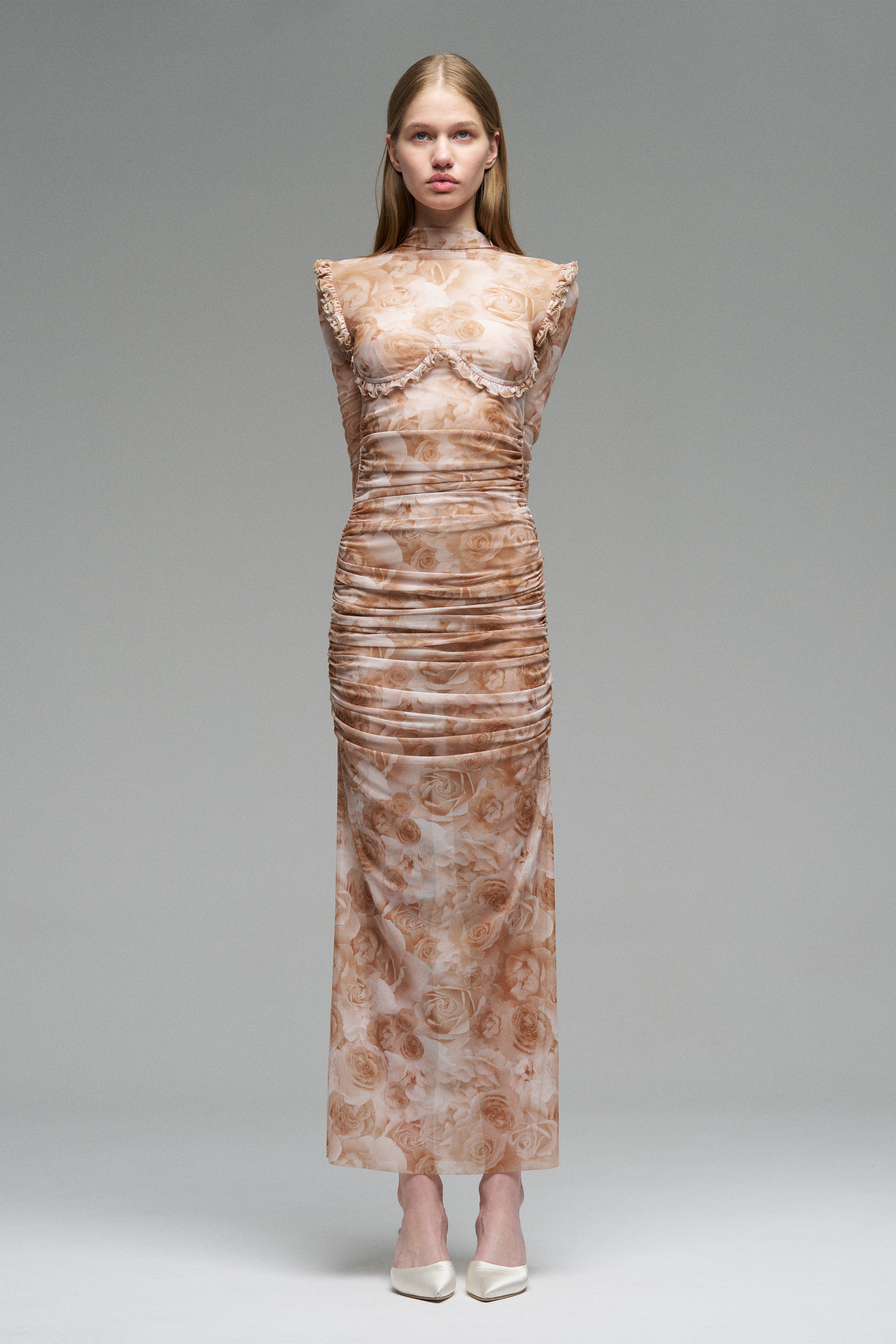 Платье из эластичной сетки с принтом роз. Полупрозрачная ткань мягко драпируется по телу, создавая акцент на силуэте. В конструкции — имитация косточек под грудью и рюши.