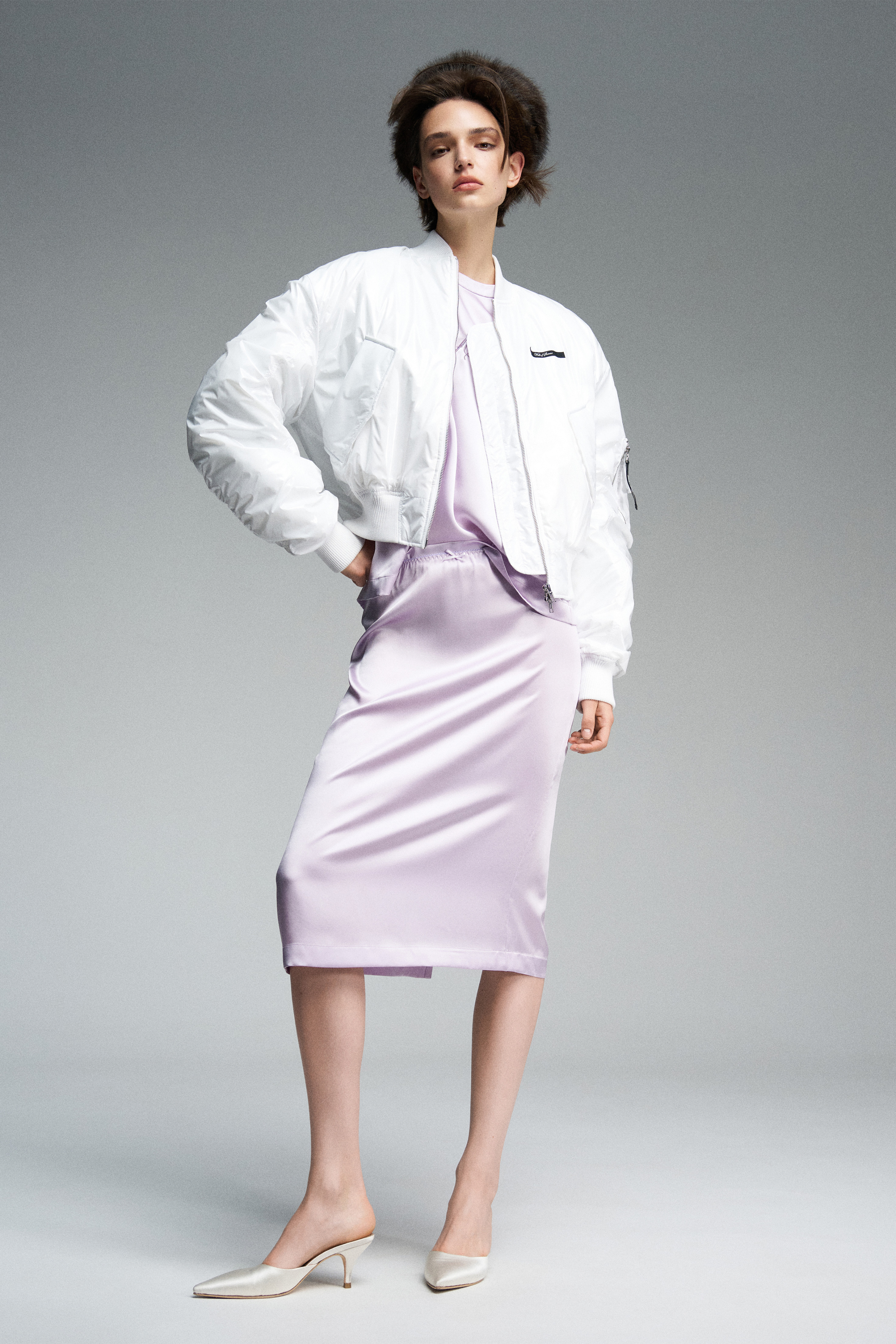 Юбка миди из натурального английского шёлка нежно-розового цвета. Изделие на бельевой резинке, украшенной спереди декоративным бантиком. Сзади — шлица и скрытая застёжка на молнию. Можно носить как самостоятельно, так и в качестве второго слоя под платье или юбку.