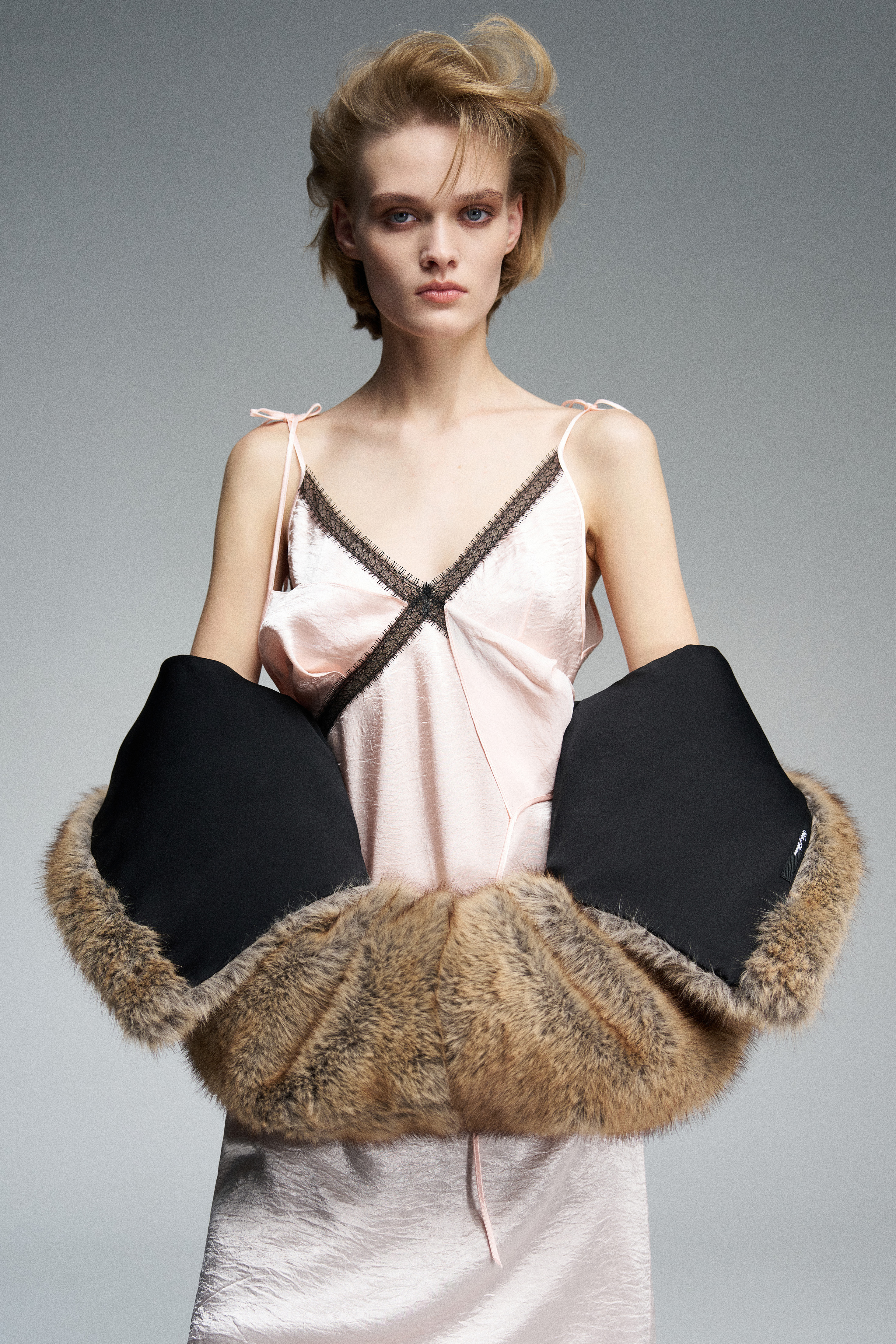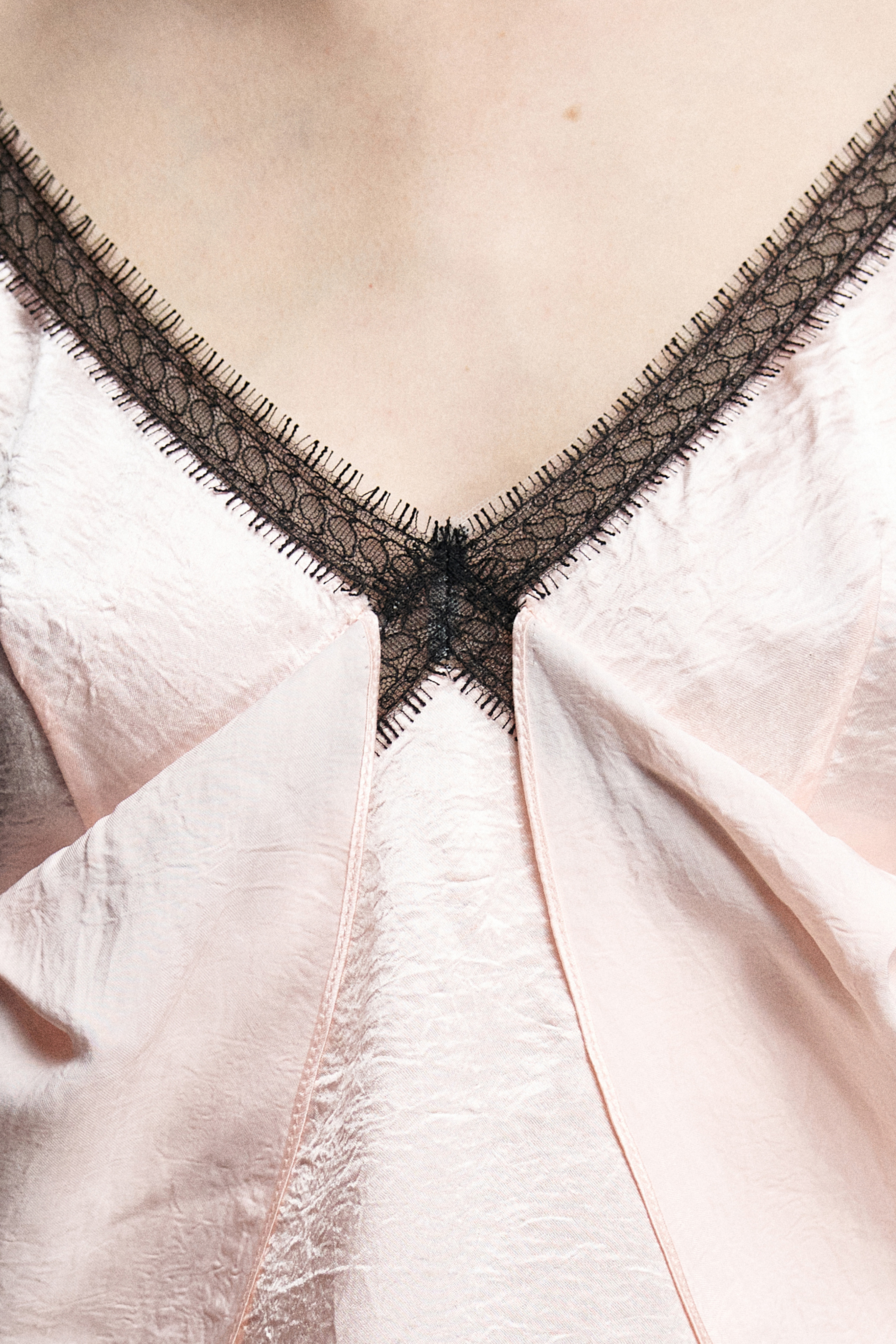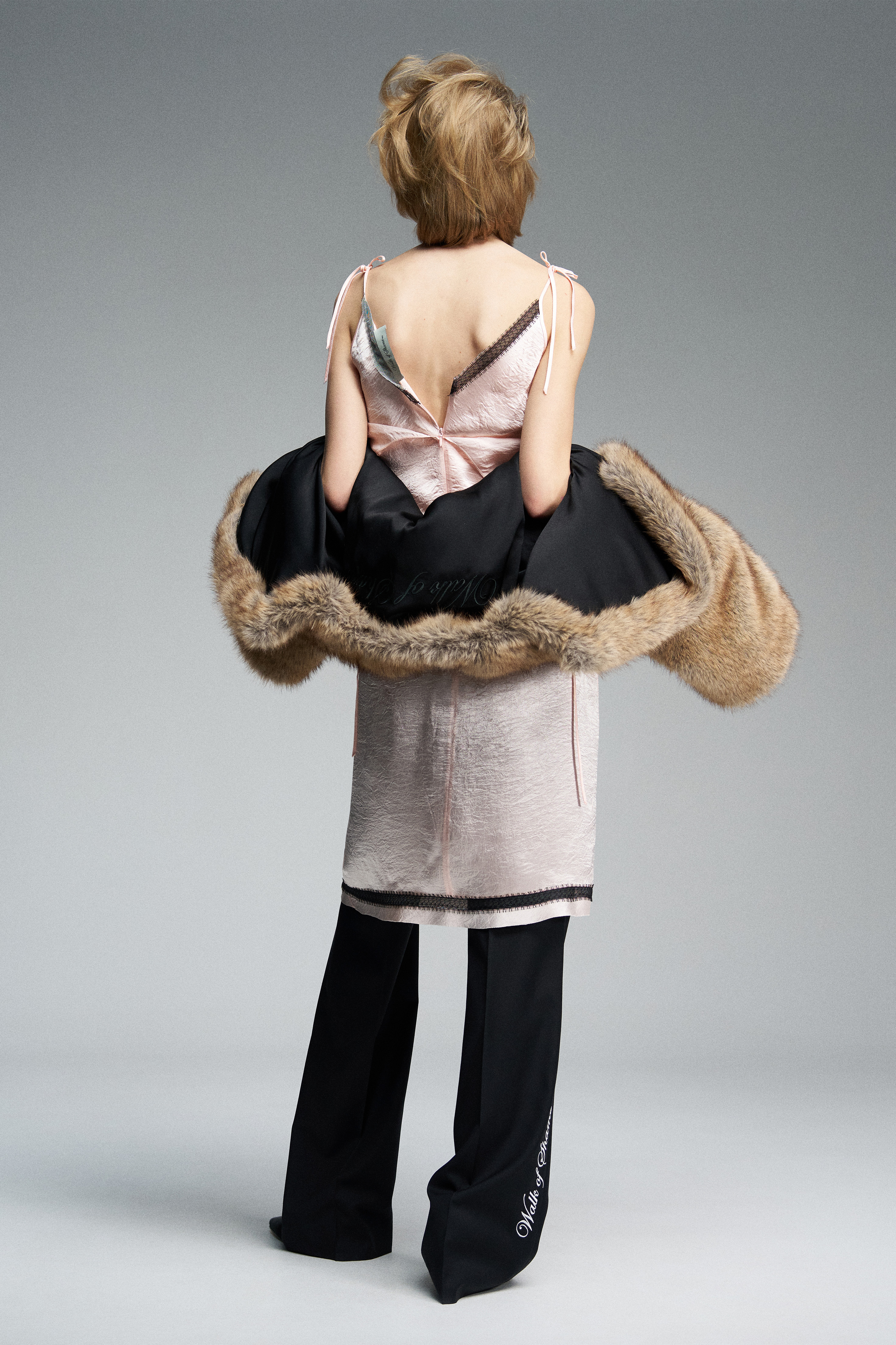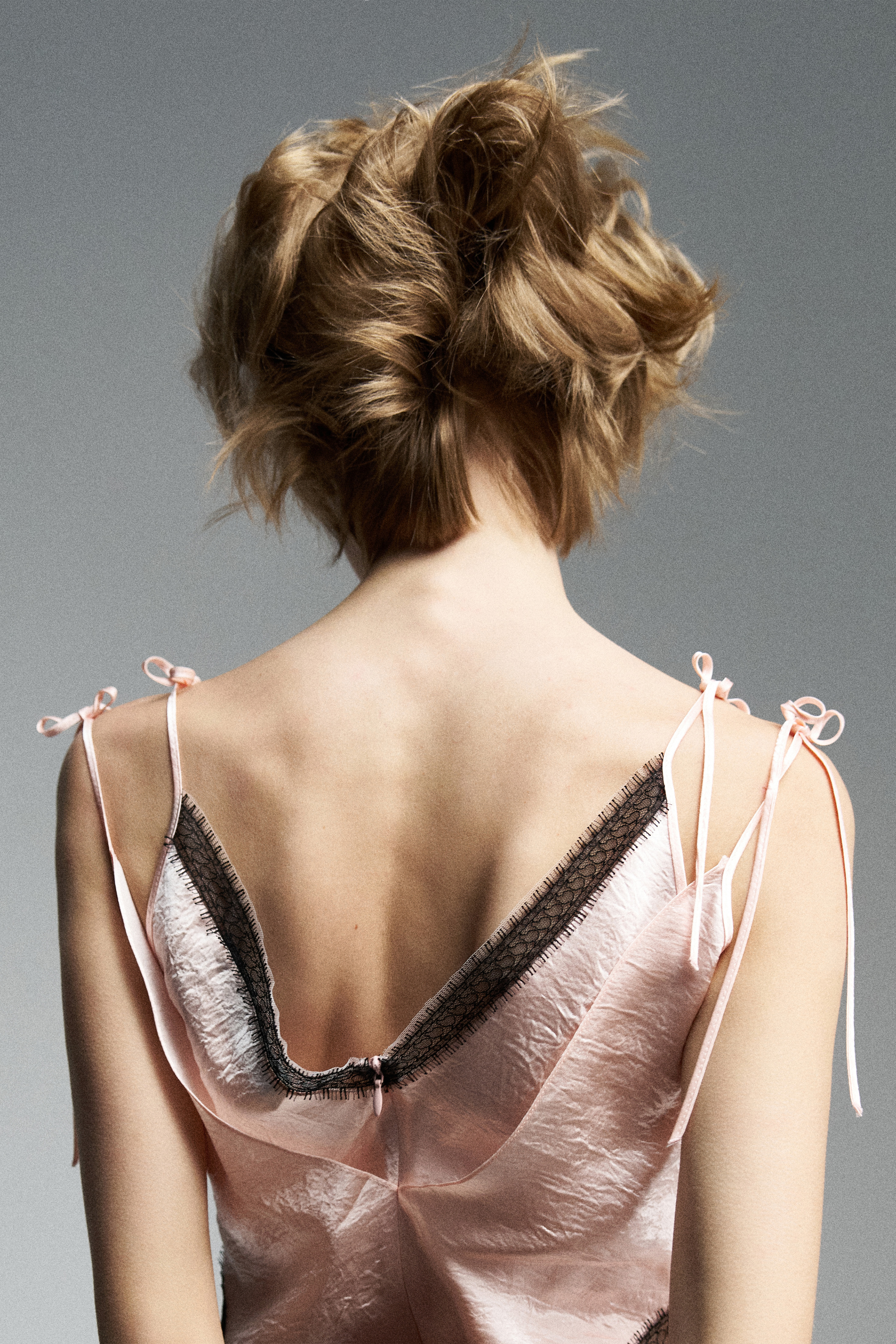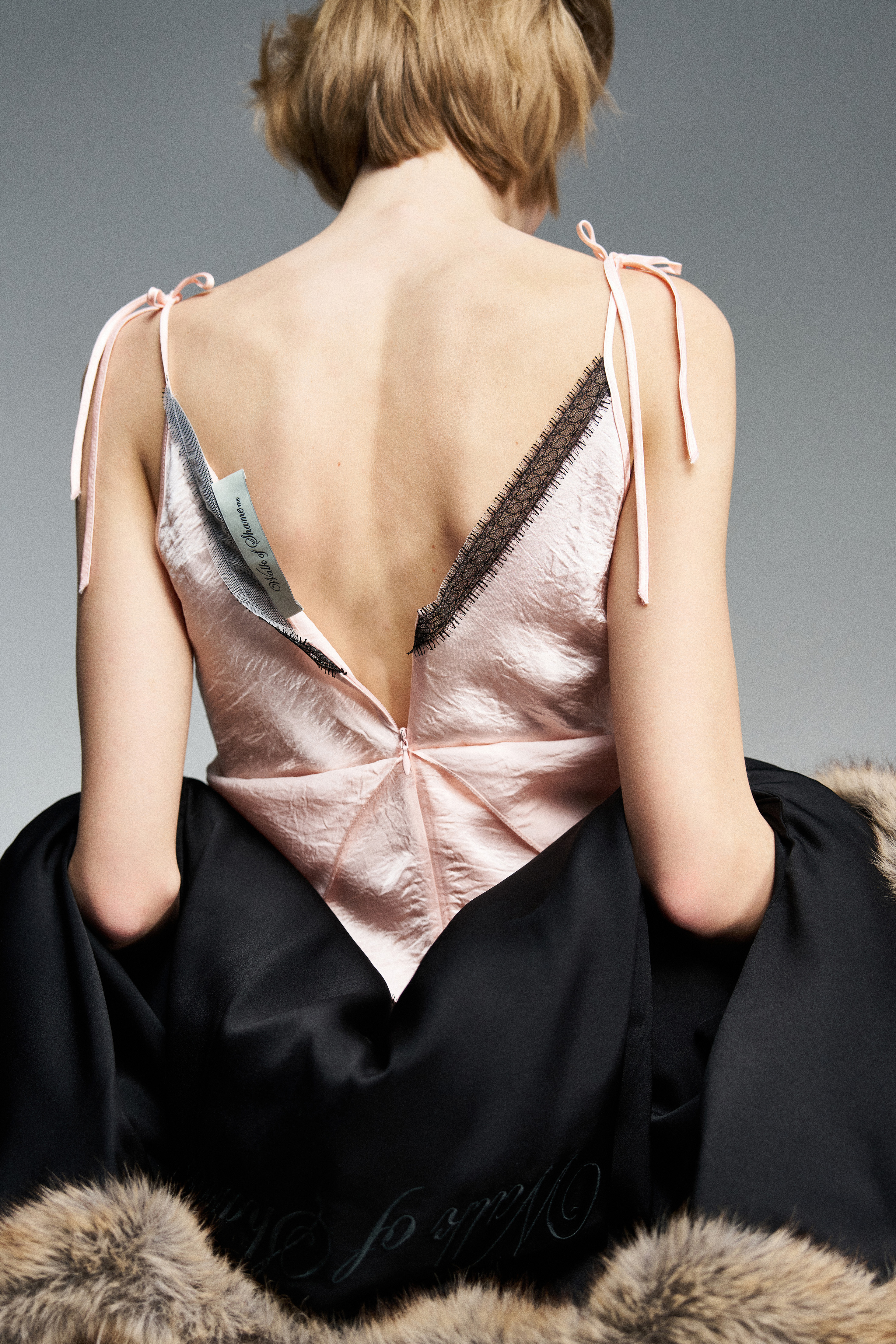 Платье-комбинация из струящейся ткани, украшенное вставками из французских шёлковых кружевных тесьм. Верхняя часть изделия выполнена в виде сложной конструкции двойного лифа: его вторую часть можно носить как декоративную деталь, ниспадающую вниз, или поднять наверх, завязав ленты в бантики. Вся шёлковая отделка вручную накалывалась мастером, чтобы подчеркнуть изгибы тела.