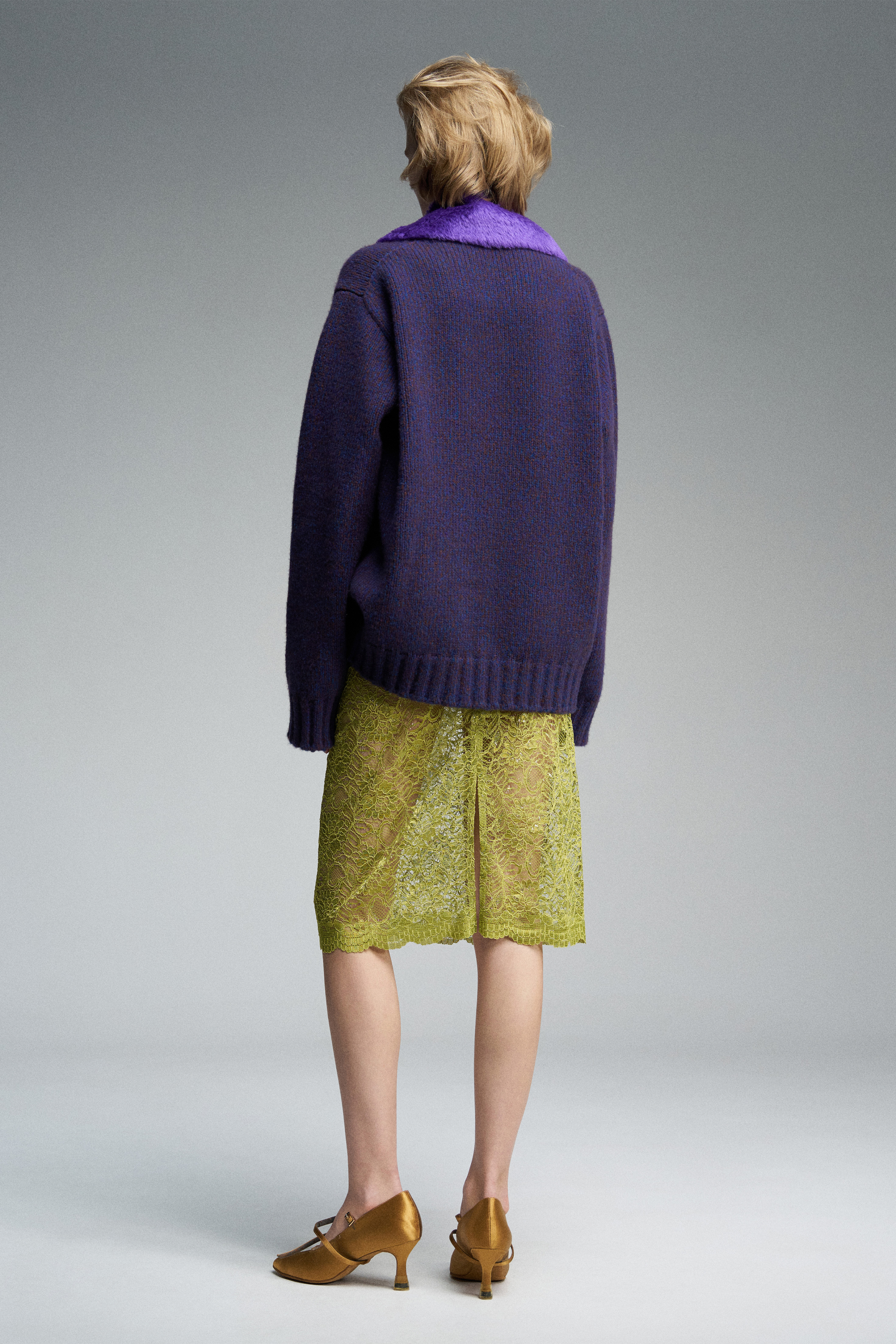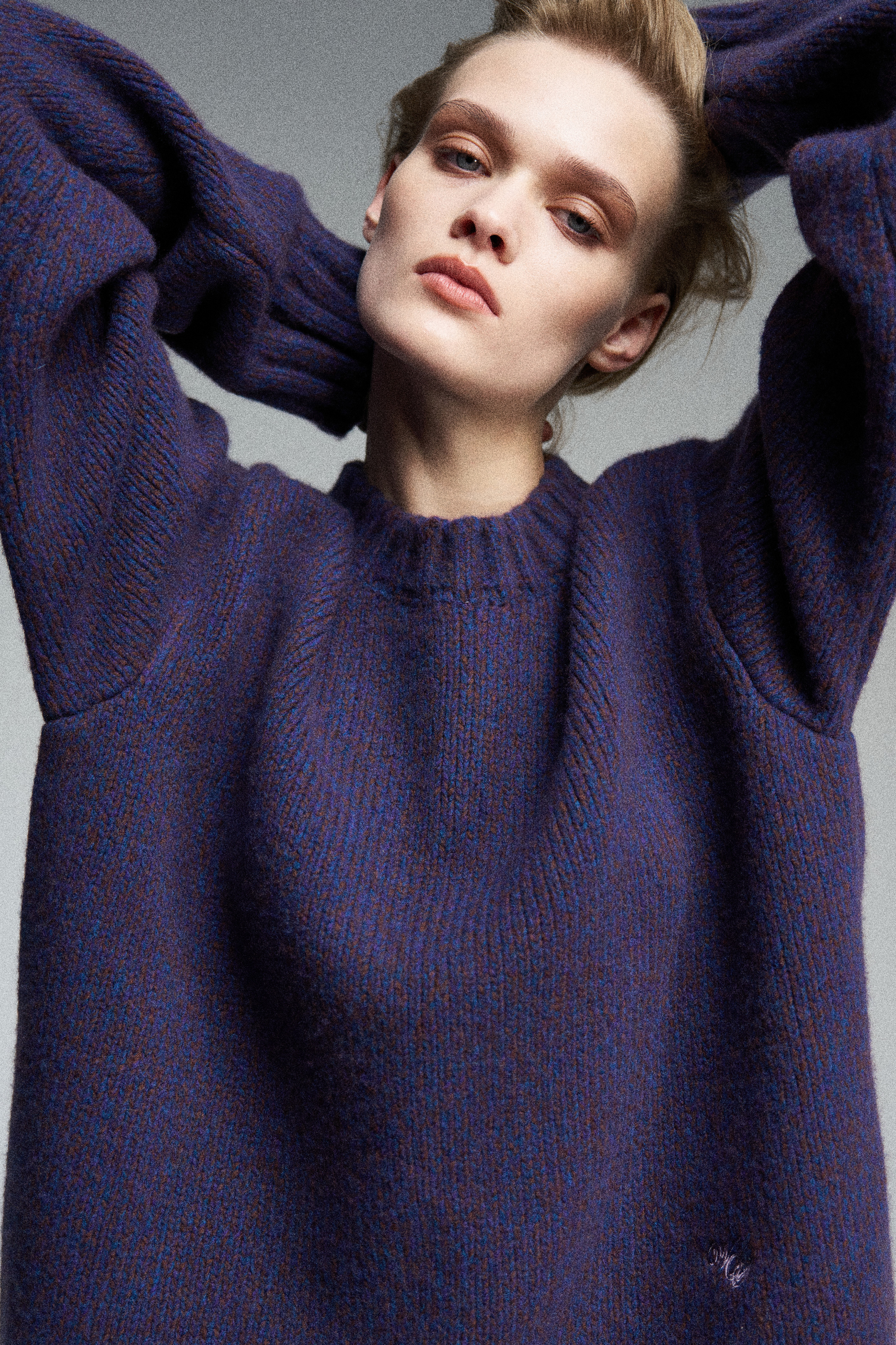 Объёмный вязаный свитер с круглой горловиной crew neck, плотно прилегающей к шее. Выполнен из смеси кашемира и мериноса, что обеспечивает мягкость, тепло и гипоаллергенность. Однотонная вышивка, цвет — меланж, придающий изделию текстурность.