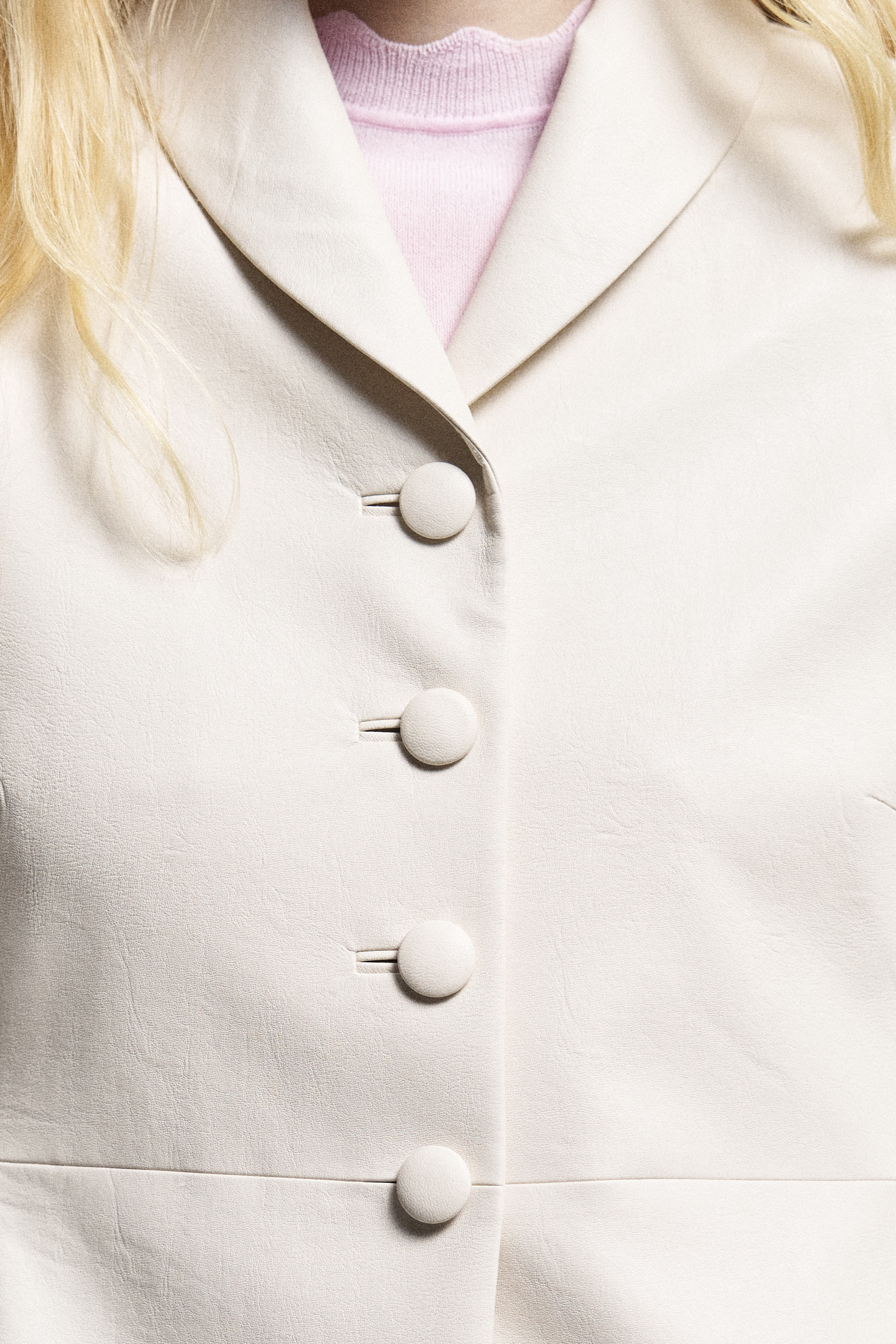 Удлиненный приталенный жакет из экокожи. Модель с шалевым воротником и обтянутыми пуговицами в тон. Горизонтальный шов на линии пояса проходит через петлю, подчеркивая талию.