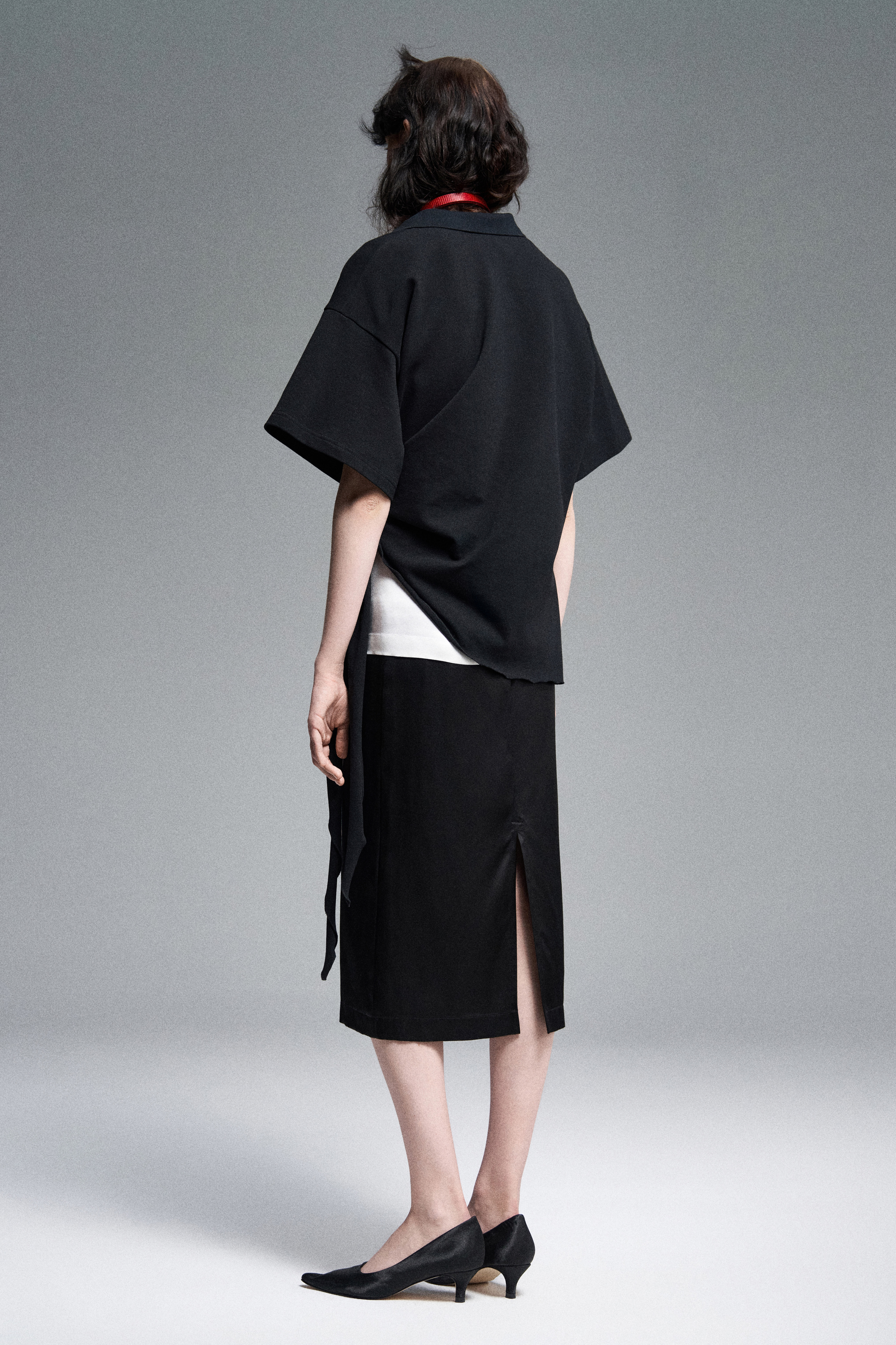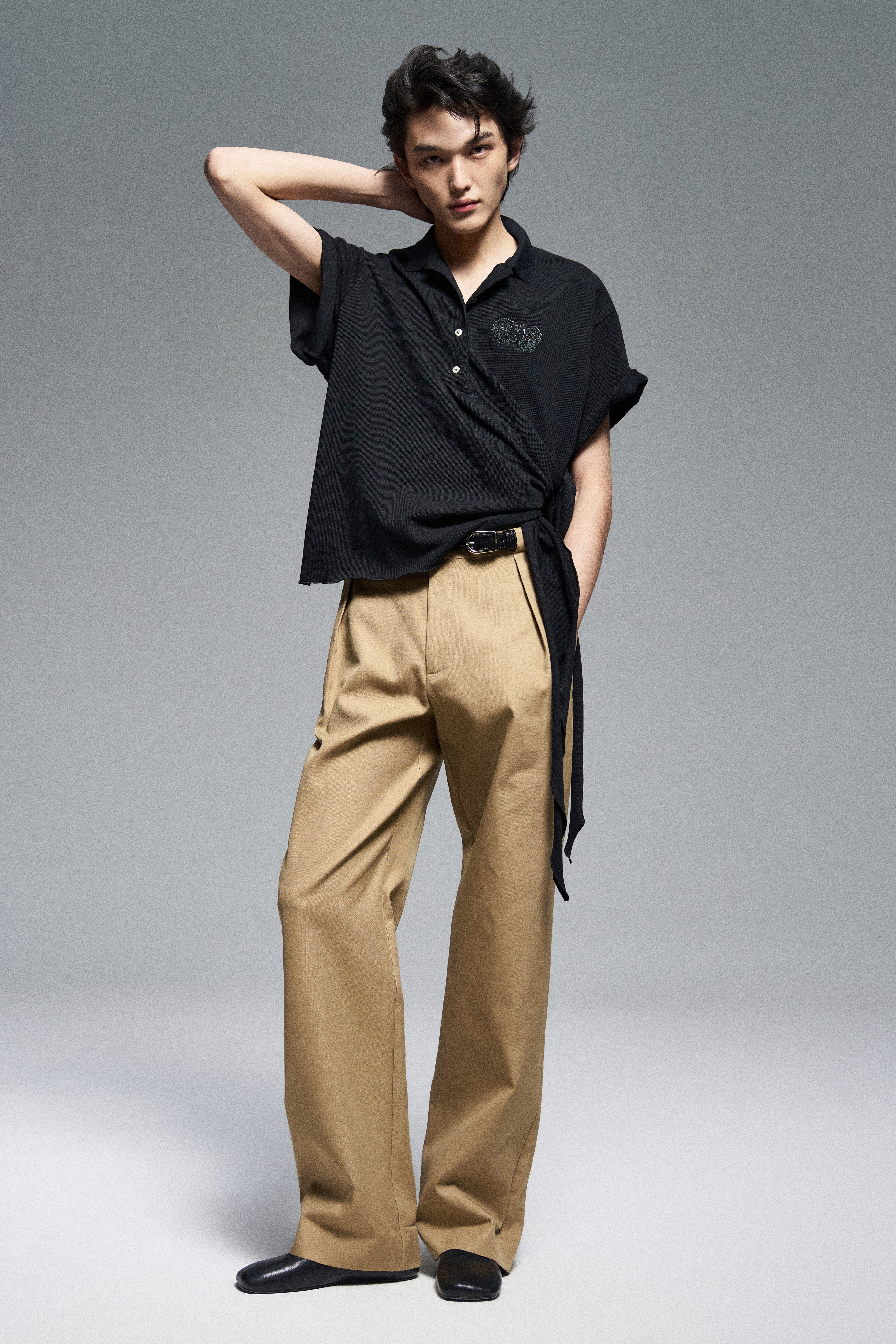 Объёмное поло свободного силуэта с завязками, дополненное вышивкой герба Walk of Shame. Модель имеет шлевки для ремня. Отложной воротник. Короткие рукава. Застежка пуговицами на планке.