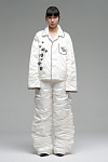 Дутая рубашка в пижамном стиле с лёгким объёмом за счёт шелкового наполнителя, поддерживающего комфортную температуру тела. Прямой крой, классический воротник. Модель украшена вышивкой на грудном кармане и розами на боку.