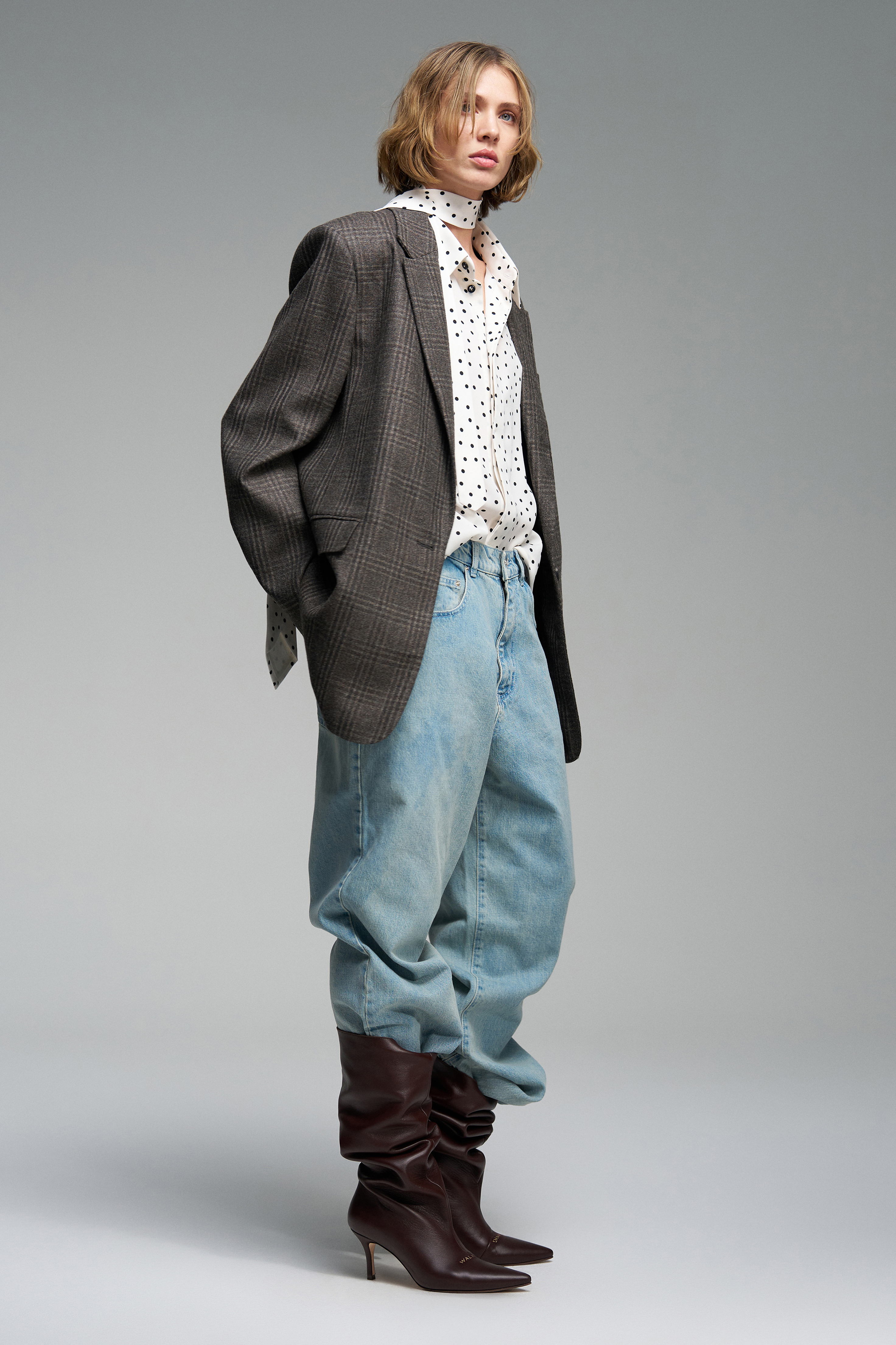 Джинсы широкого кроя голубого цвета из 100% хлопка с низкой посадкой. Модель с двумя карманами сзади и спереди и молнией застежкой.