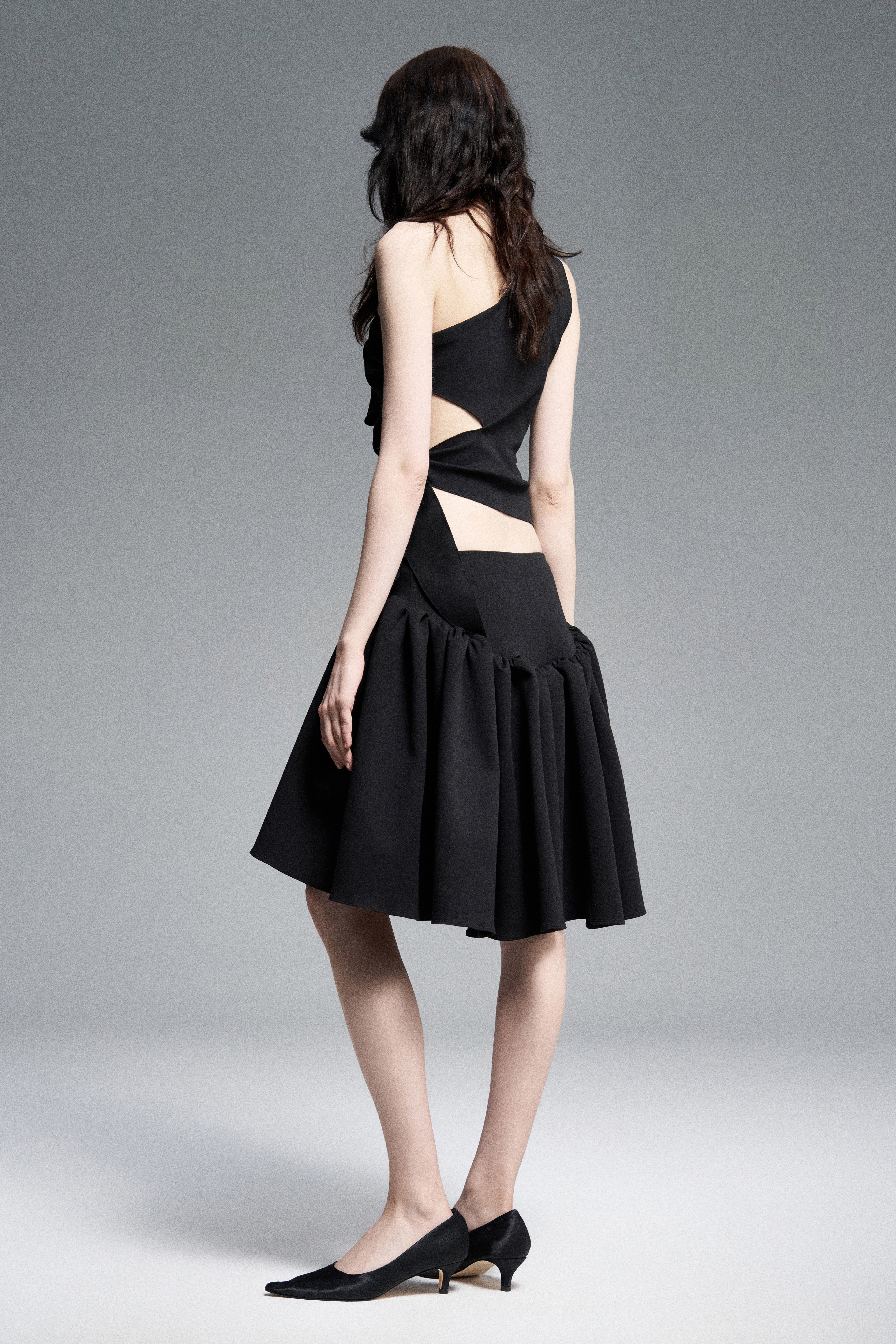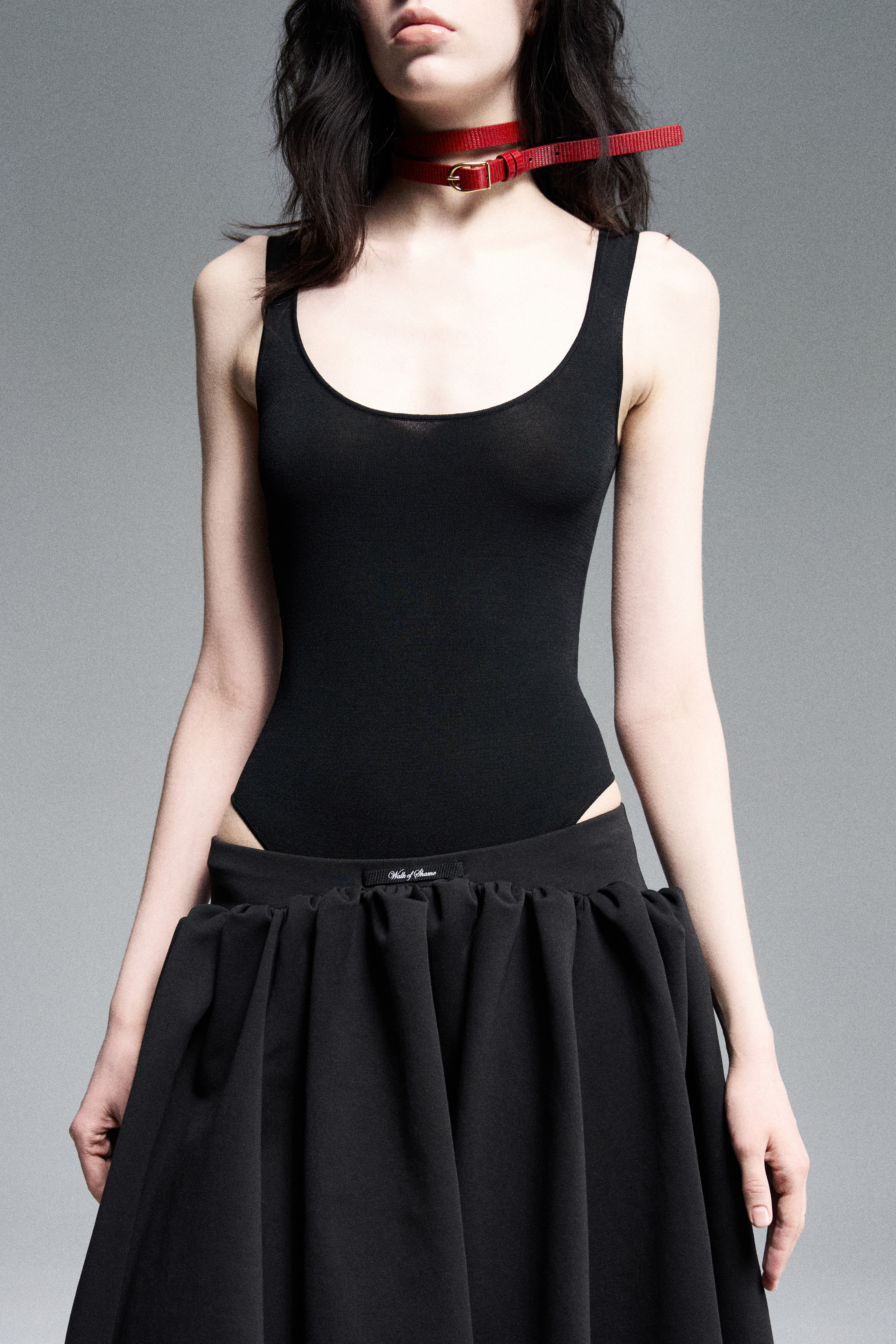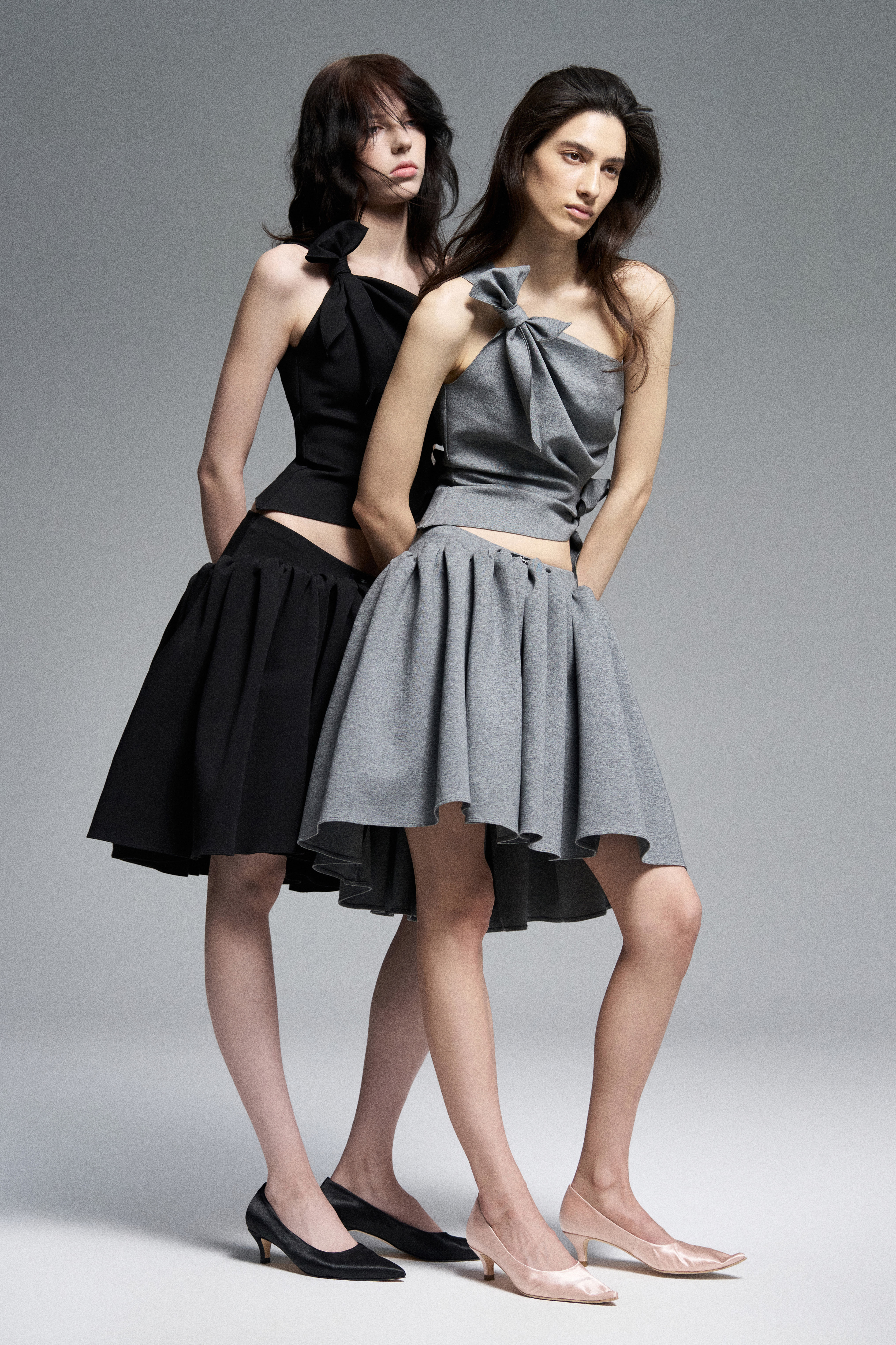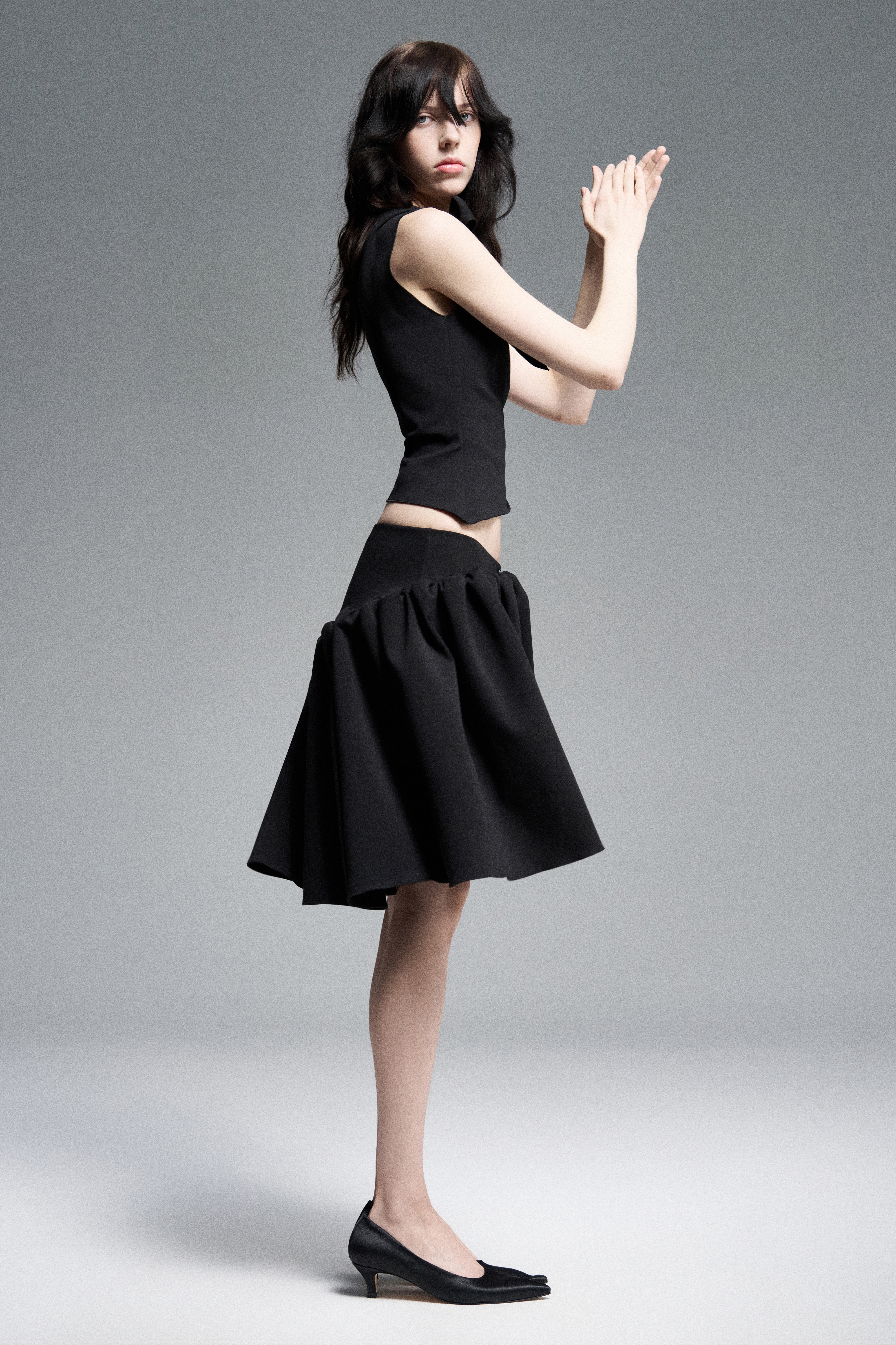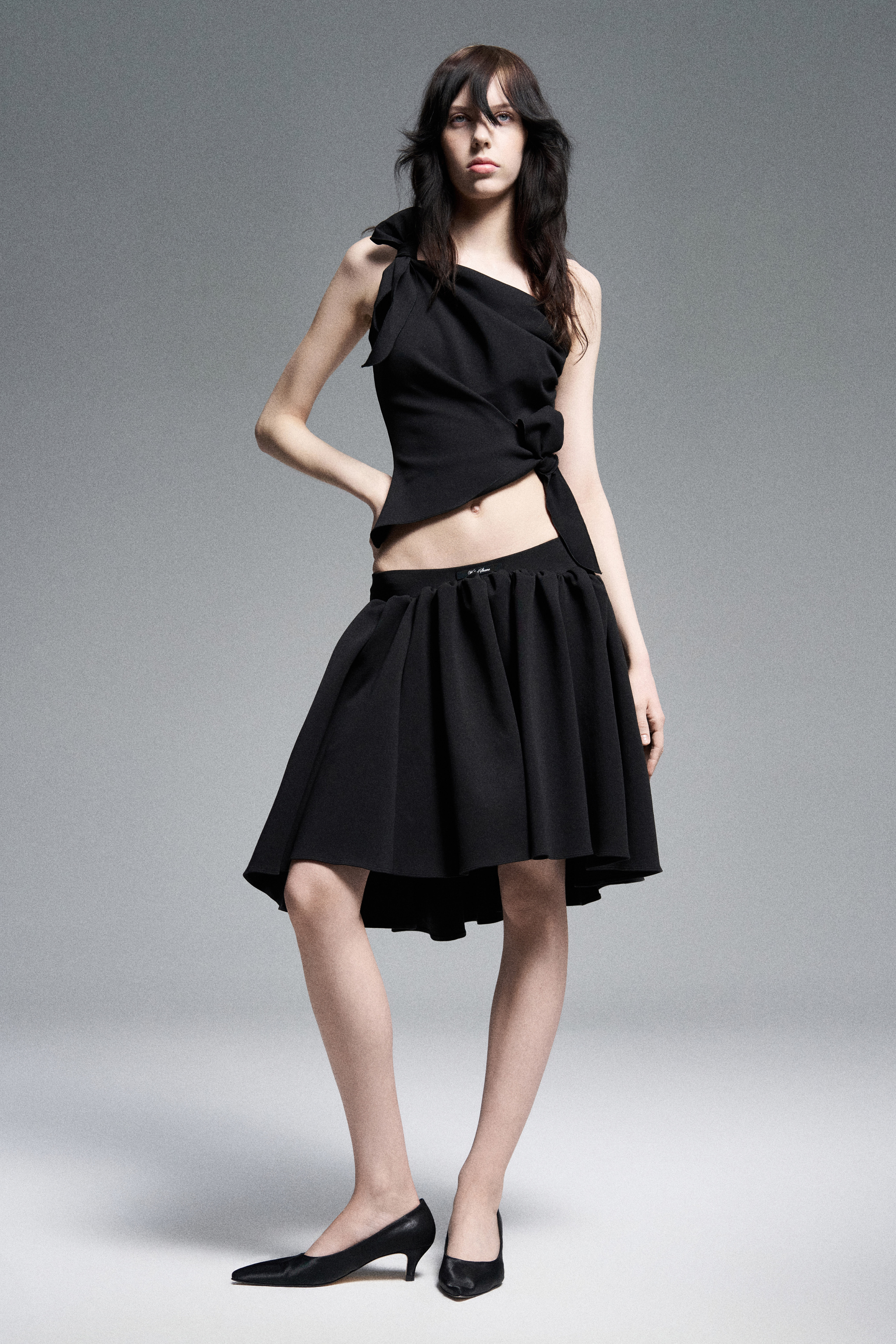 Объемная юбка в сборку из джерси на низкой посадке. Эффект кринолина создается сборками на поясе.
