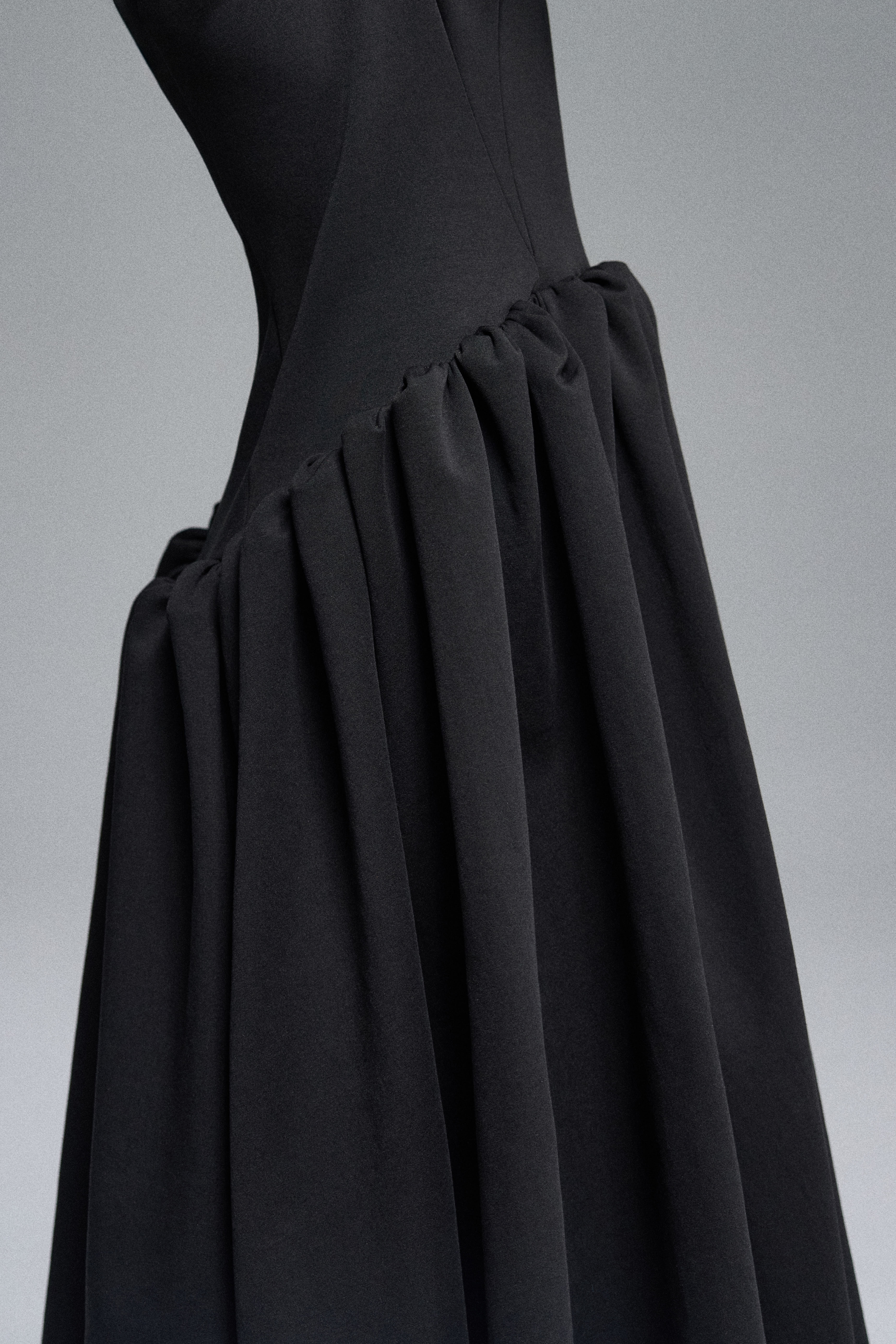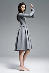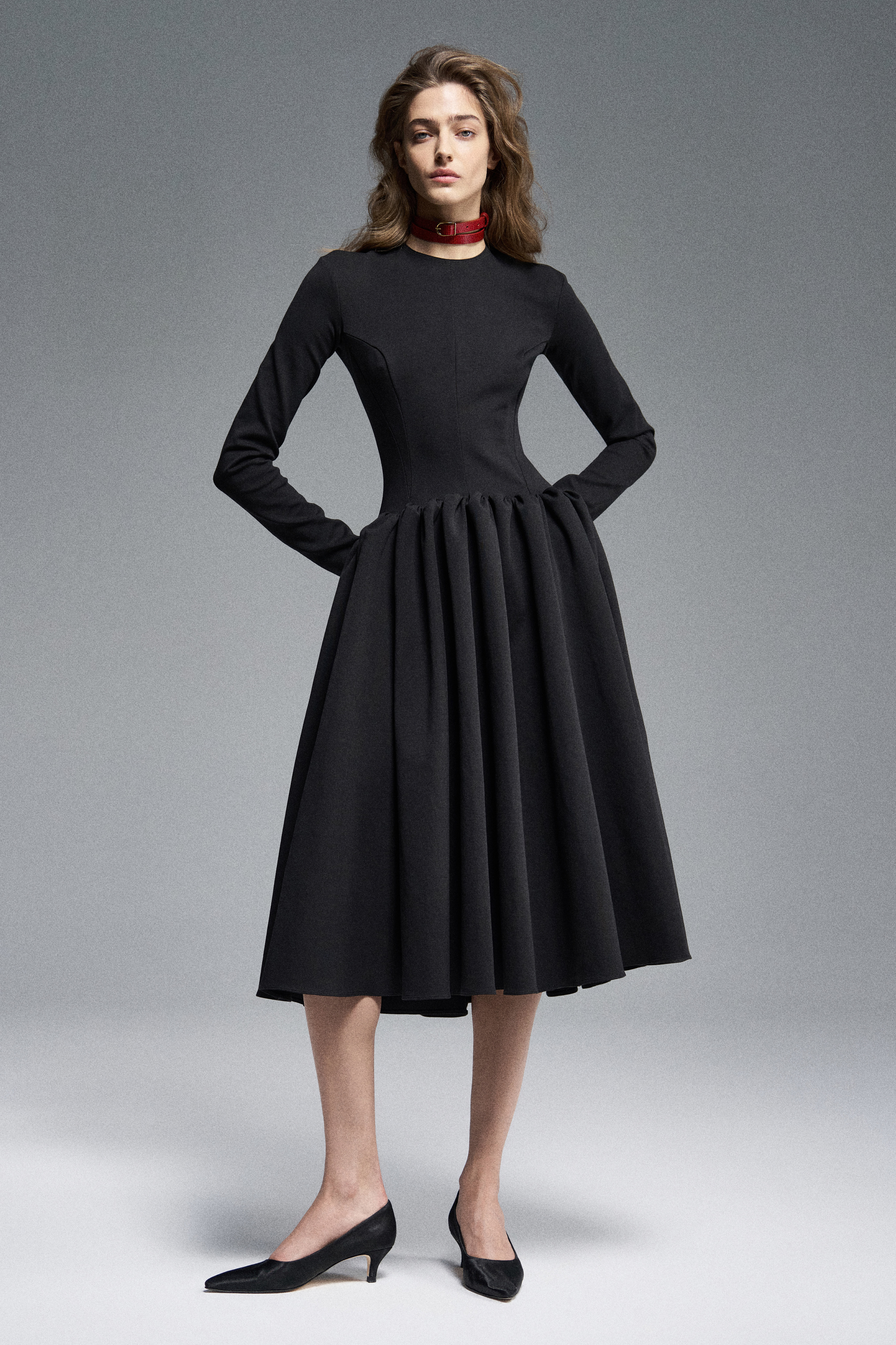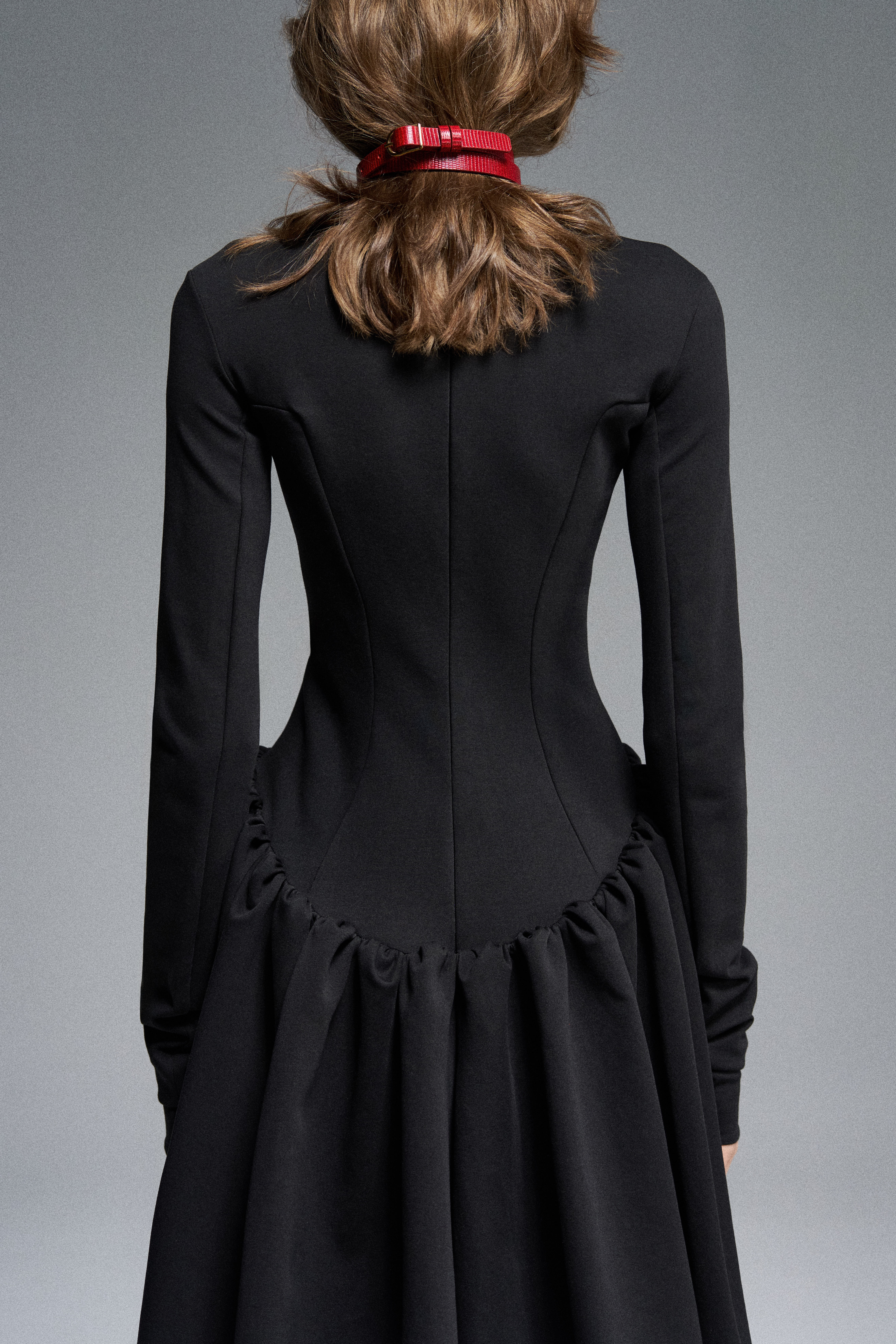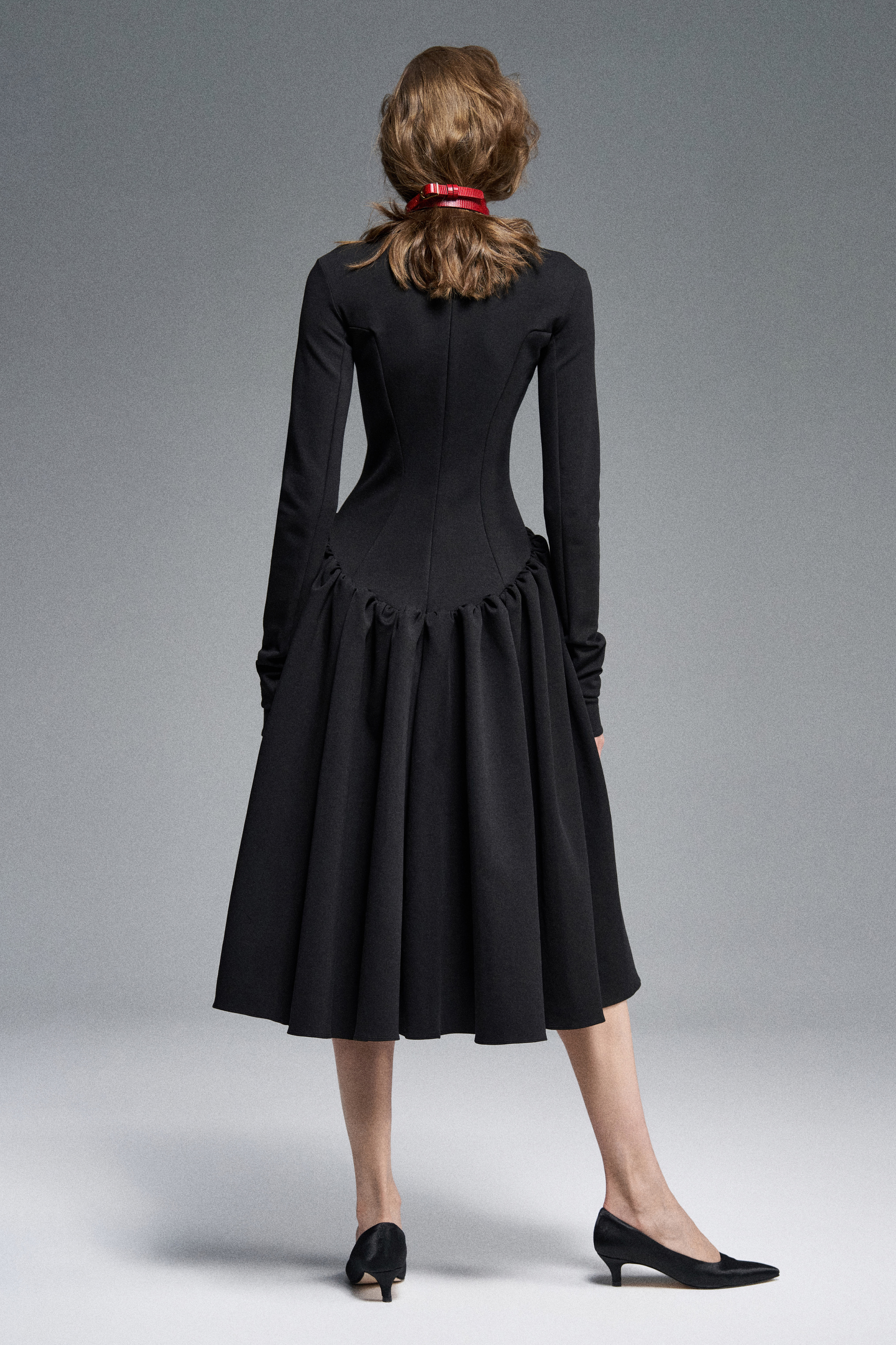 Платье приталенного кроя с объемной юбкой из джерси. Эффект кринолина создается сборками на линии талии. Круглый вырез. Застежка на молнию на спинке.
