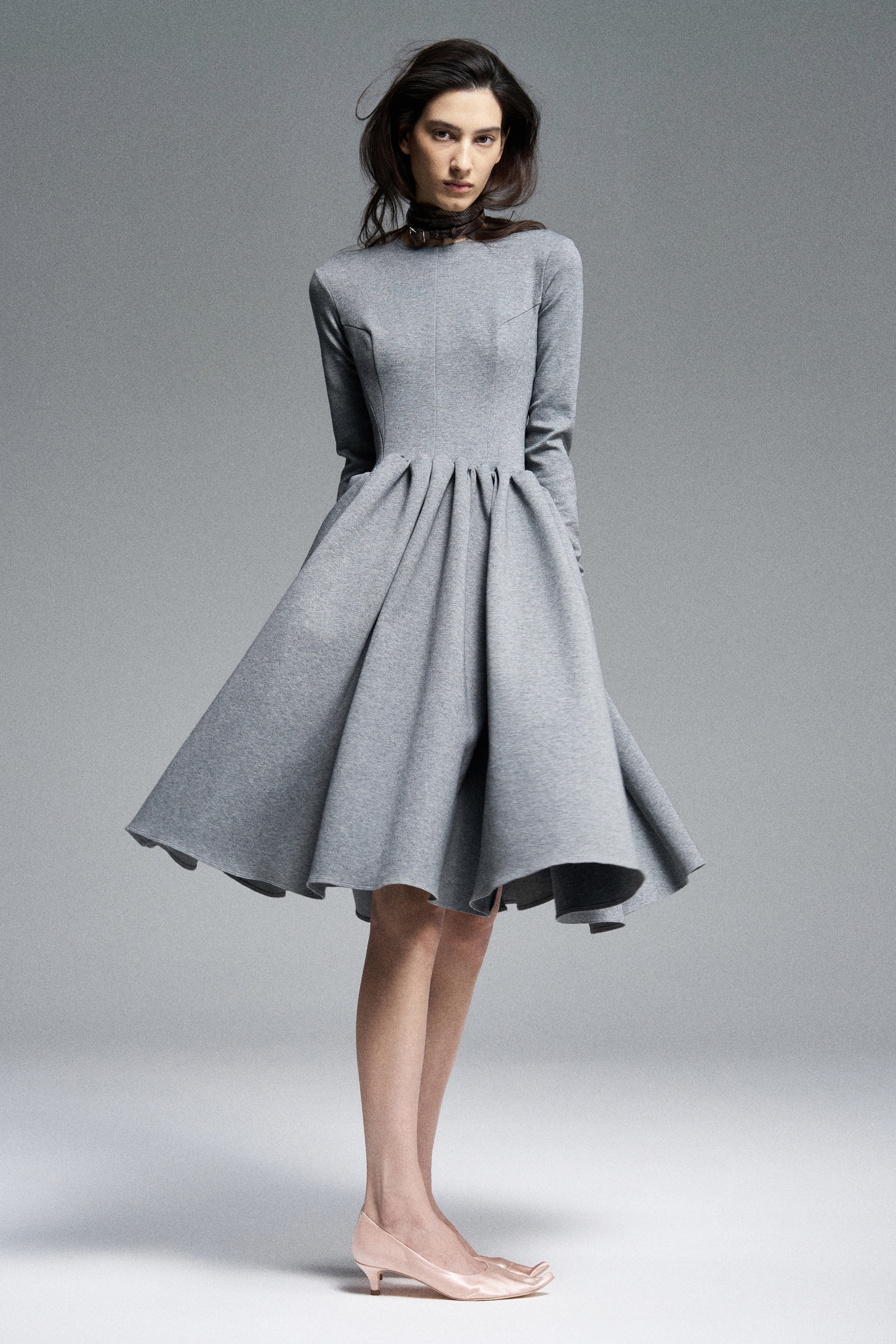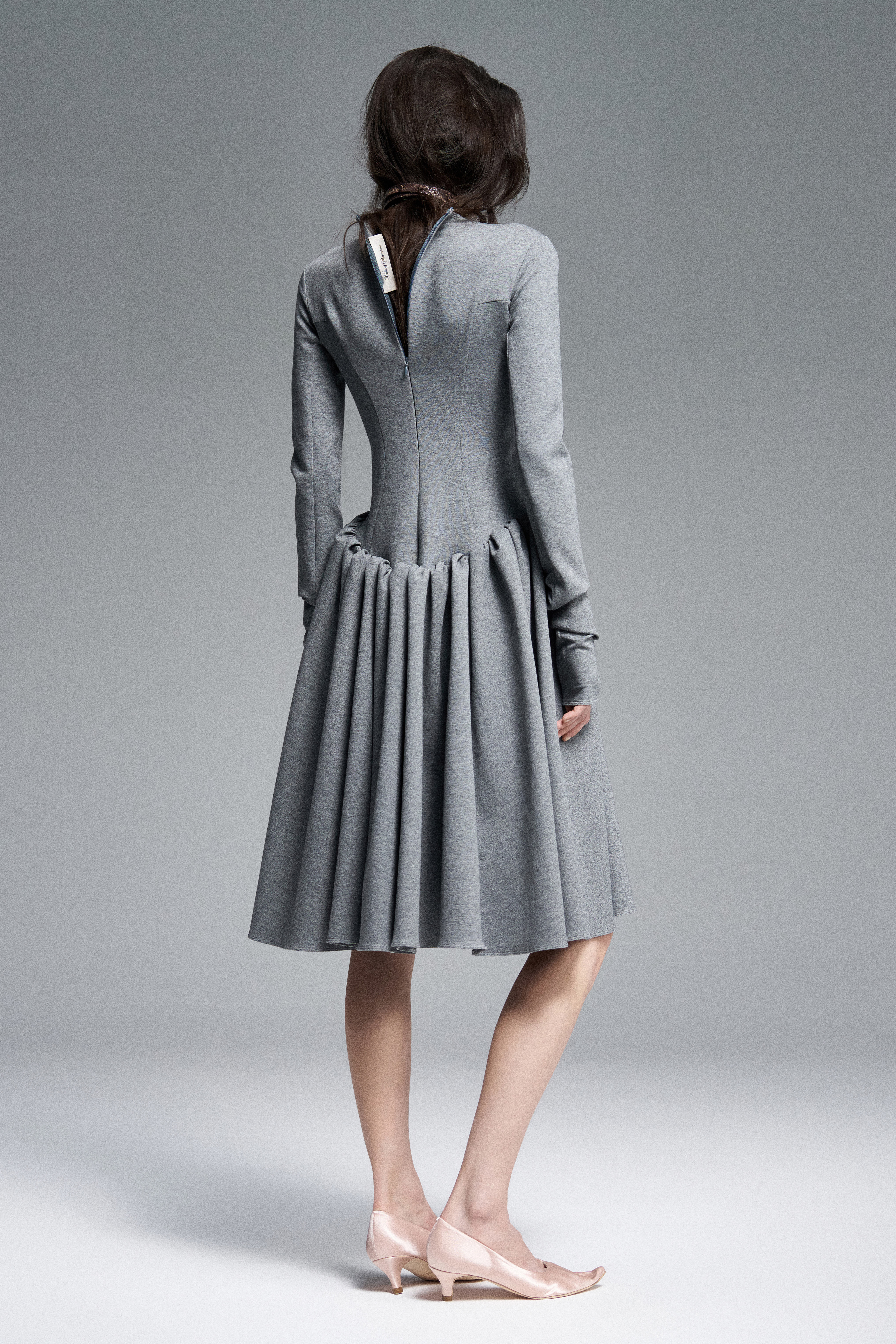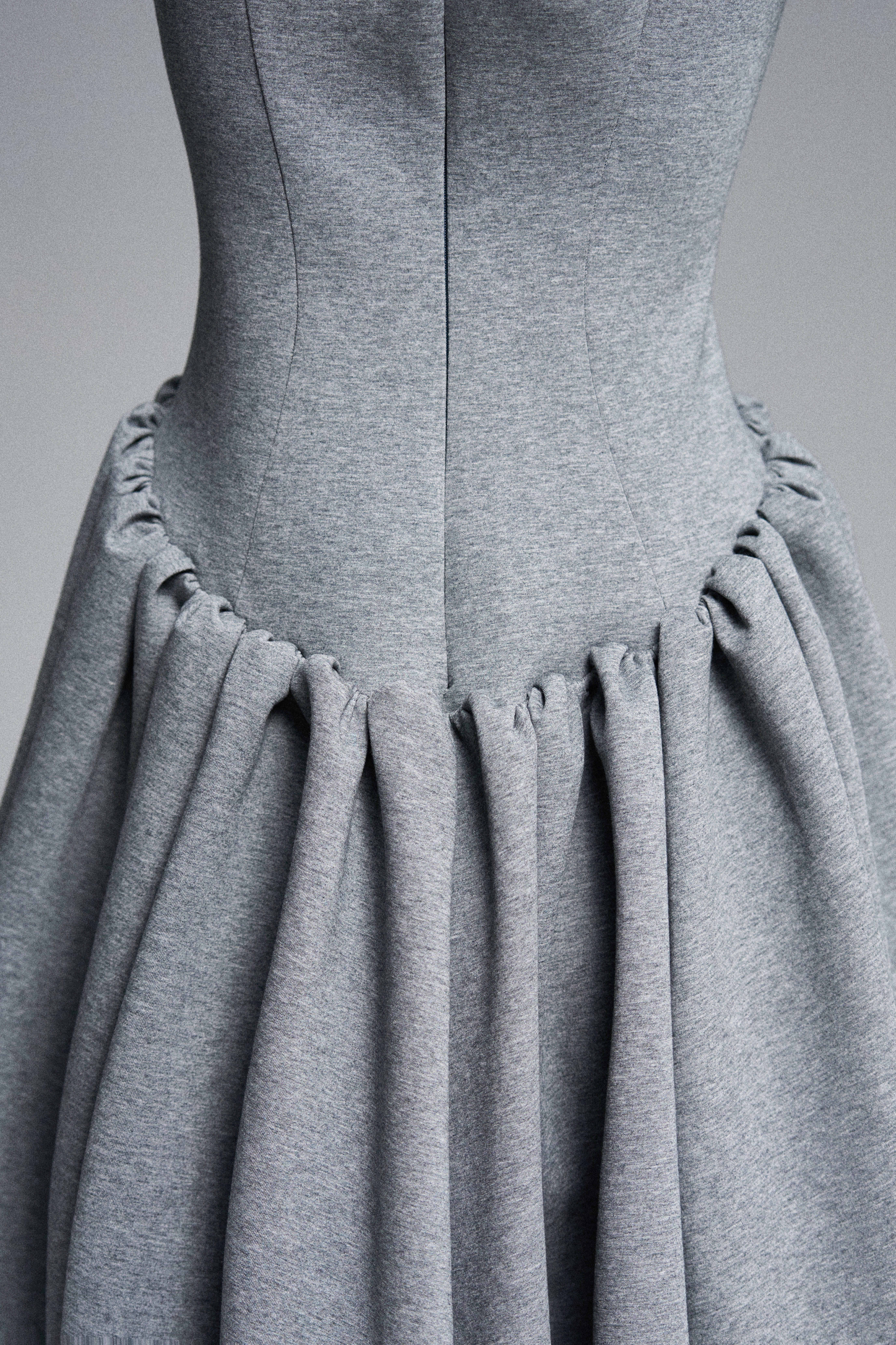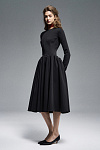 Платье приталенного кроя с объемной юбкой из джерси. Эффект кринолина создается сборками на линии талии. Круглый вырез. Застежка на молнию на спинке.