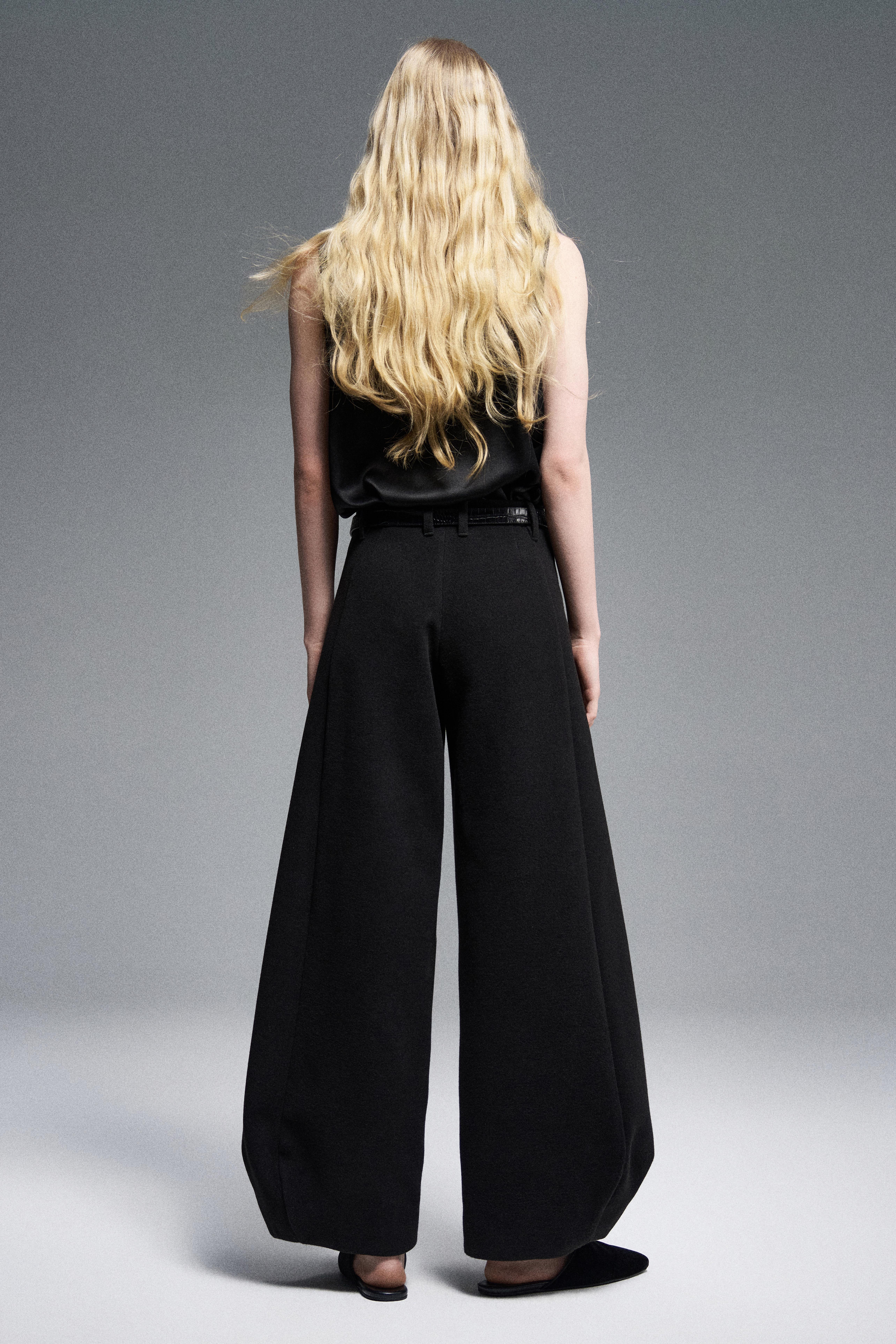 Объемные брюки из мягкого флиса силуэта «bubble», резко сужающиеся к низу. Пояс брюк обработан корсажной лентой, застежка на молнию и обтянутую кнопку. Акцентированы диагональными швами спереди. Шлейки для ремня.