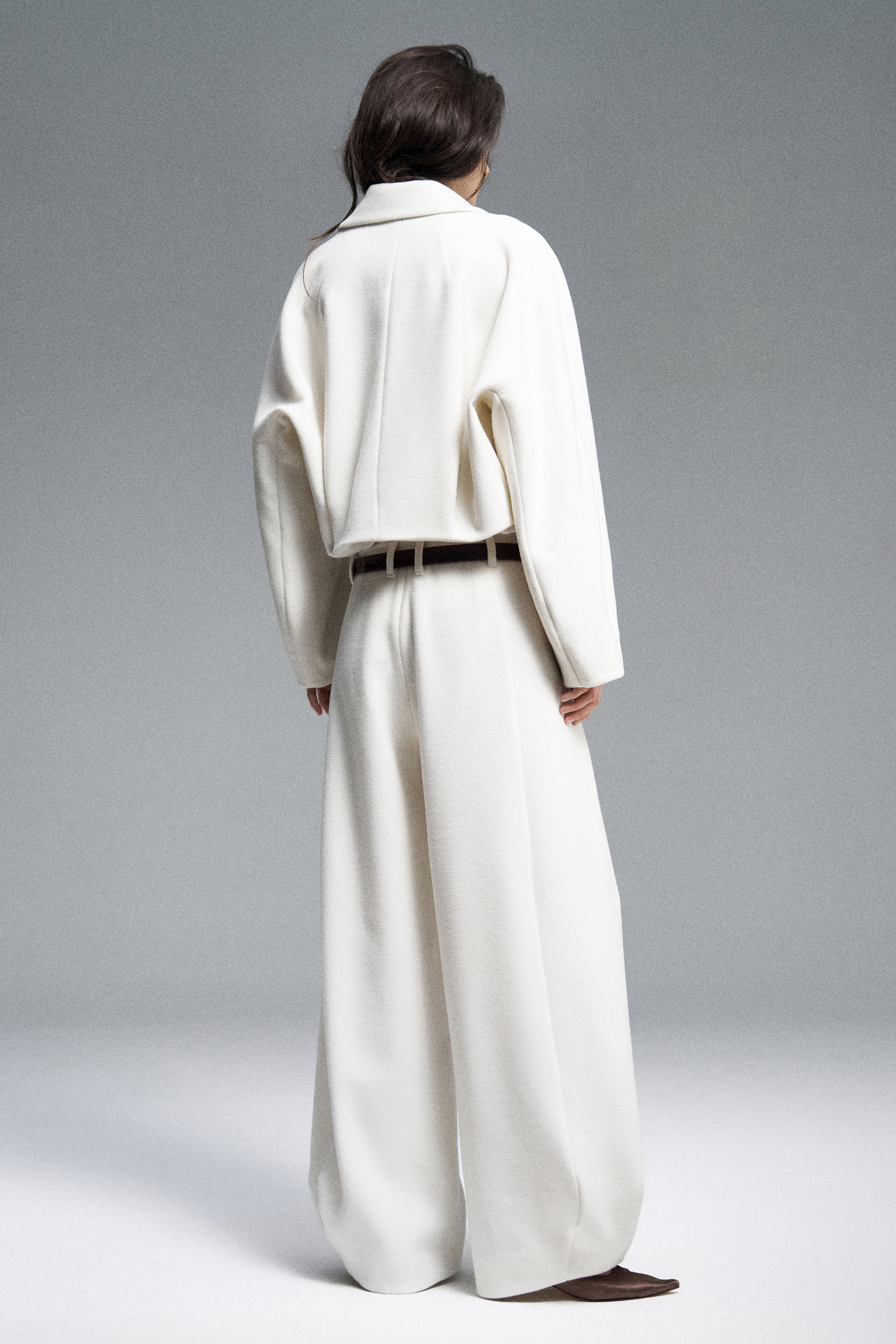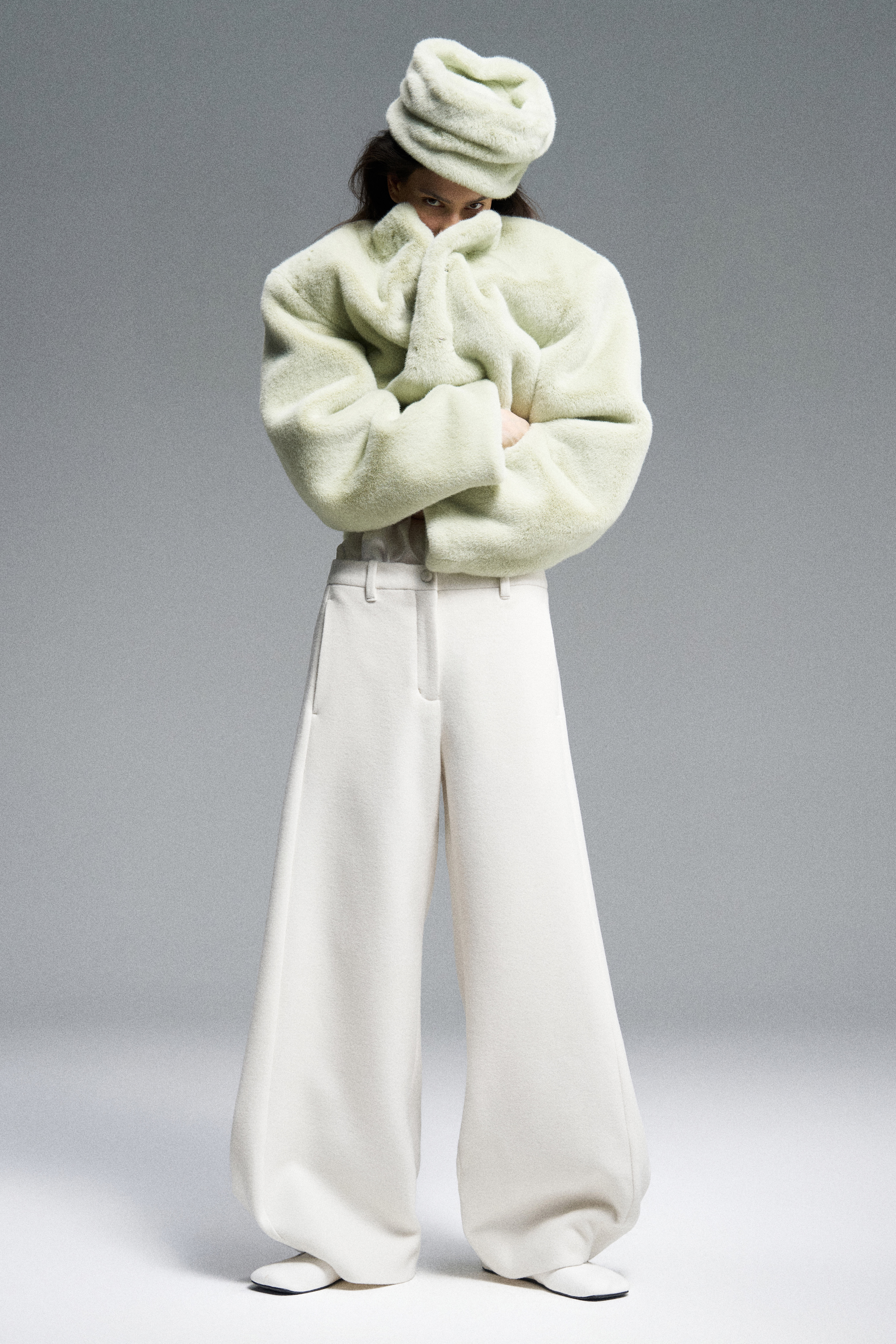 Объемные брюки из мягкого флиса силуэта «bubble», резко сужающиеся к низу. Пояс брюк обработан корсажной лентой, застежка на молнию и обтянутую кнопку. Акцентированы диагональными швами спереди. Шлейки для ремня.