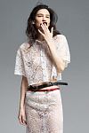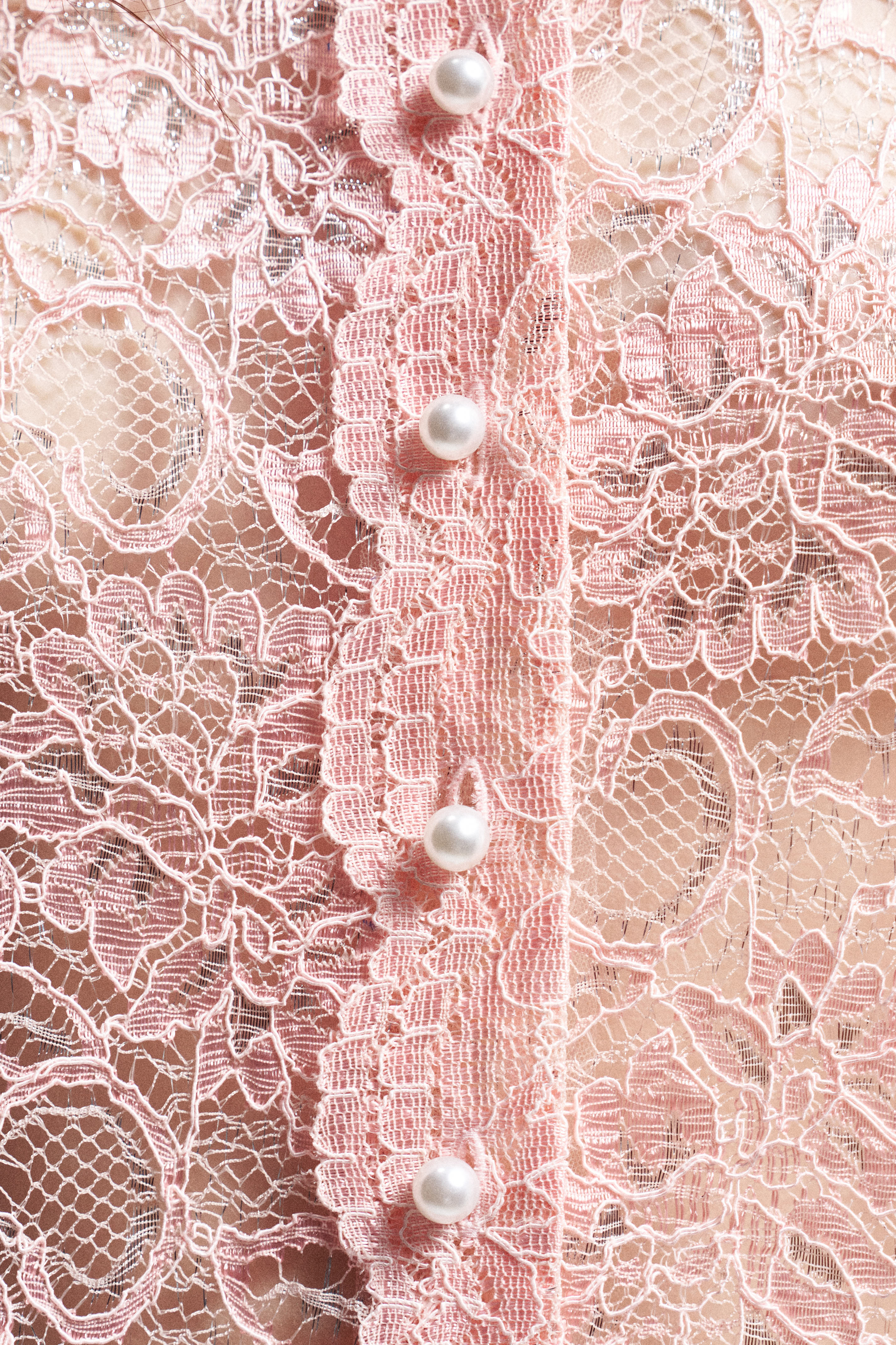 Укороченная блуза из японского кружева. При создании полотна используются нити разной толщины, что придает рисунку объем и фактурно подчеркивает орнамент. Модель с классическими лацканами. Планка декорирована тесьмой из кружева и жемчужными пуговицами.