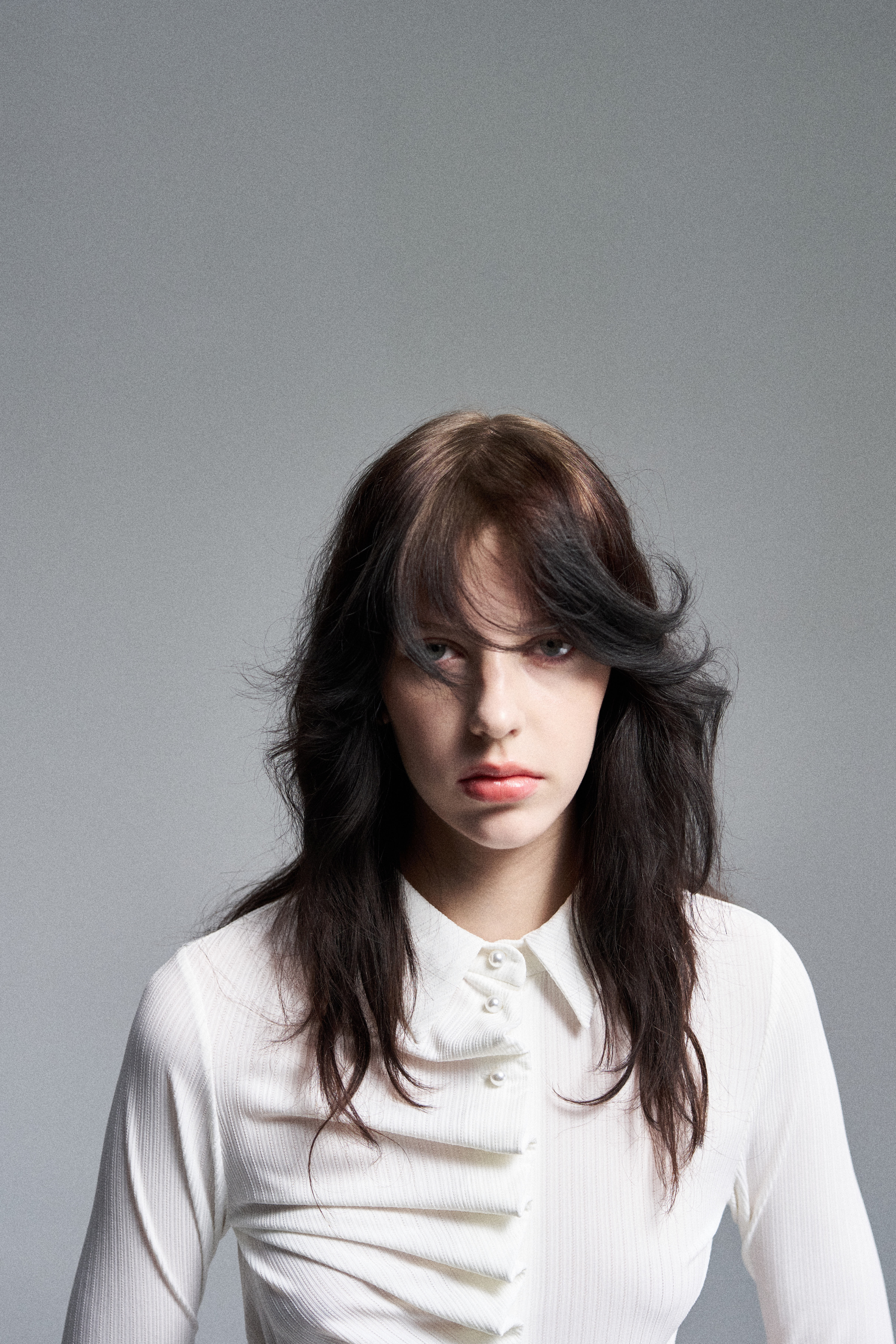 Блуза приталенного силуэта из полупрозрачного фактурного трикотажа. Асимметричная полочка с жемчужными пуговицами создает эффект мягкой драпировки при застегивании.