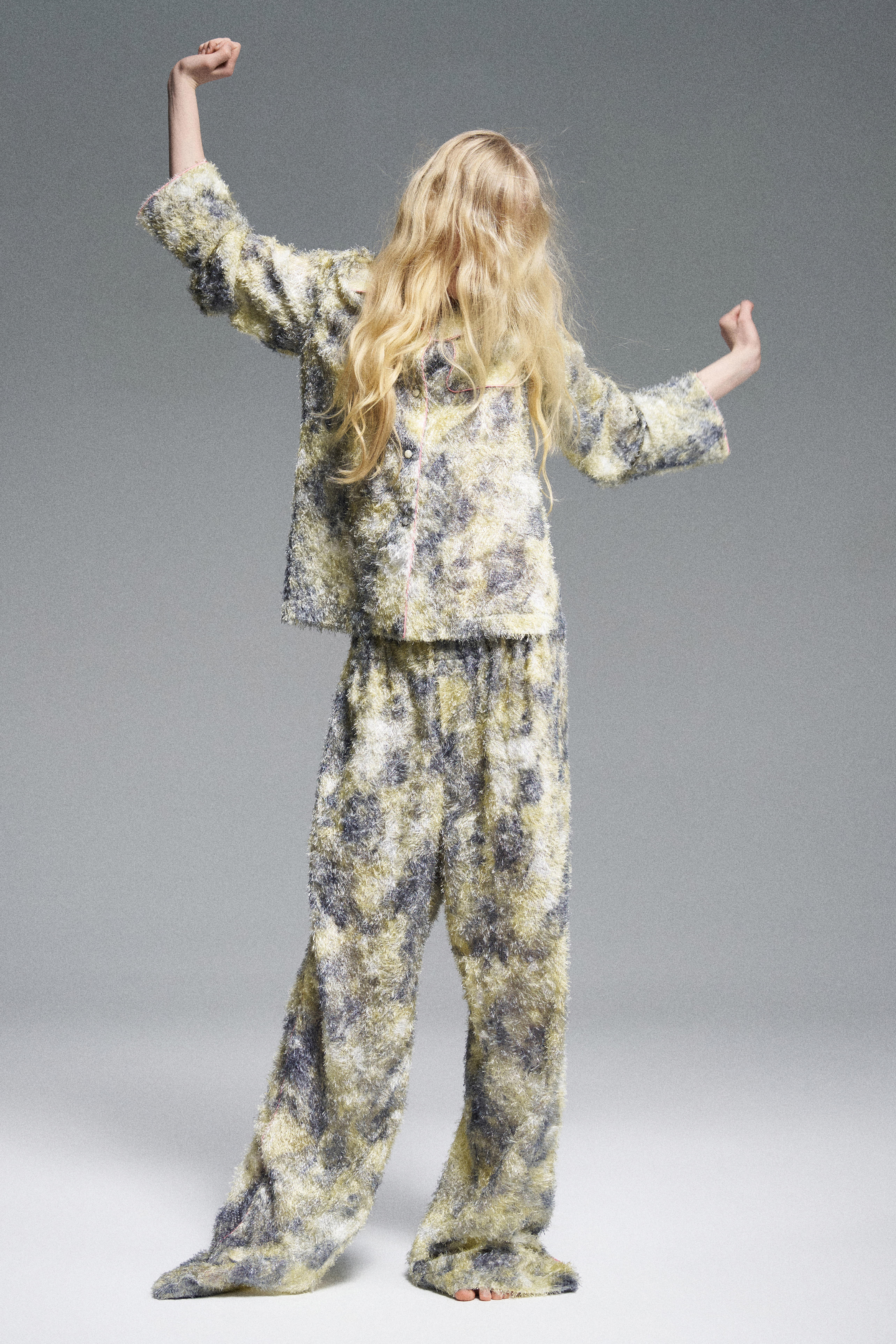 Пижамные брюки прямого силуэта. Выполнены из шифона с жаккардовым переплетением нитей, создающим эффект «травы». Модель с регулируемым поясом, боковыми карманами на шелковой подкладке и контрастными лампасами вдоль боковых швов.