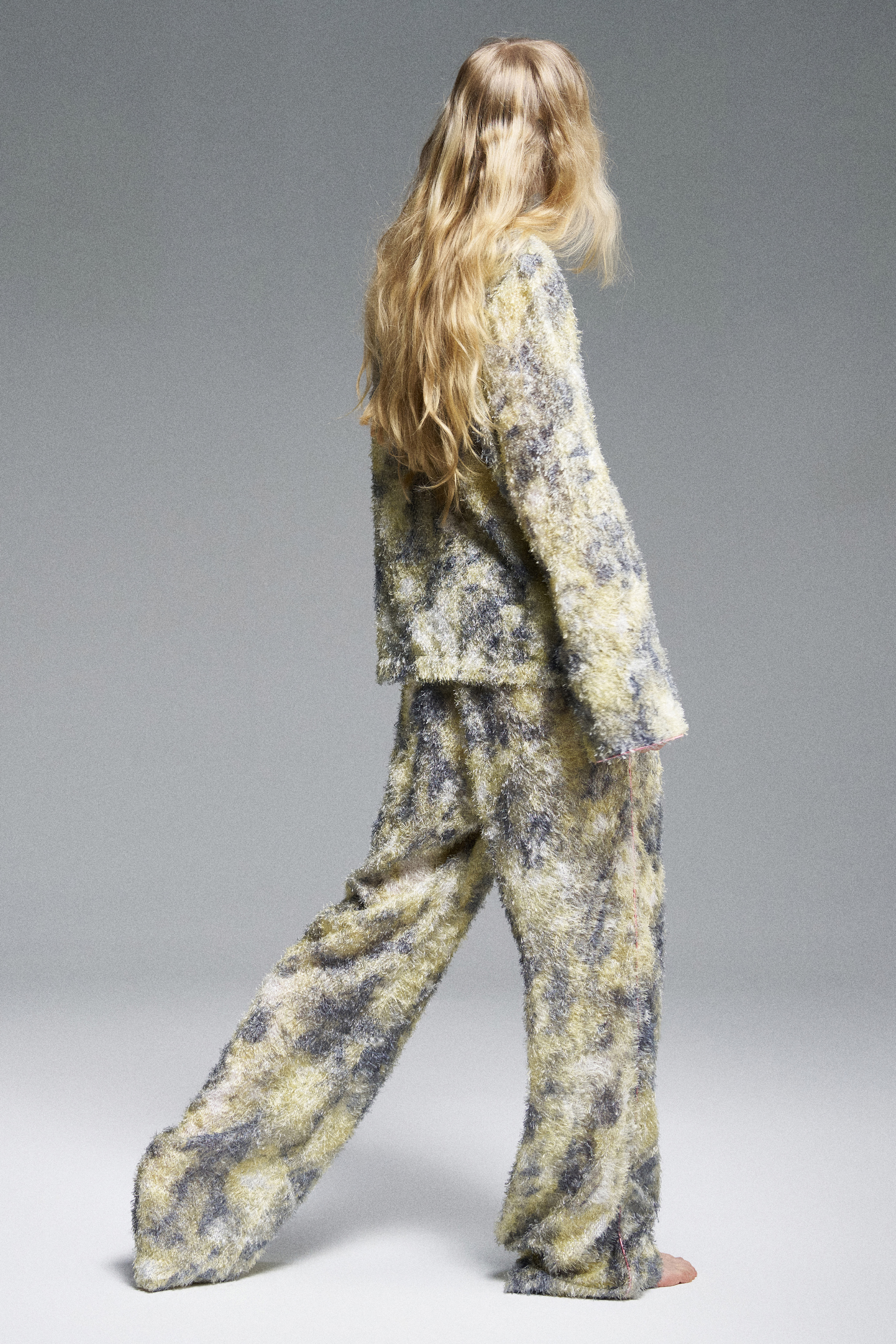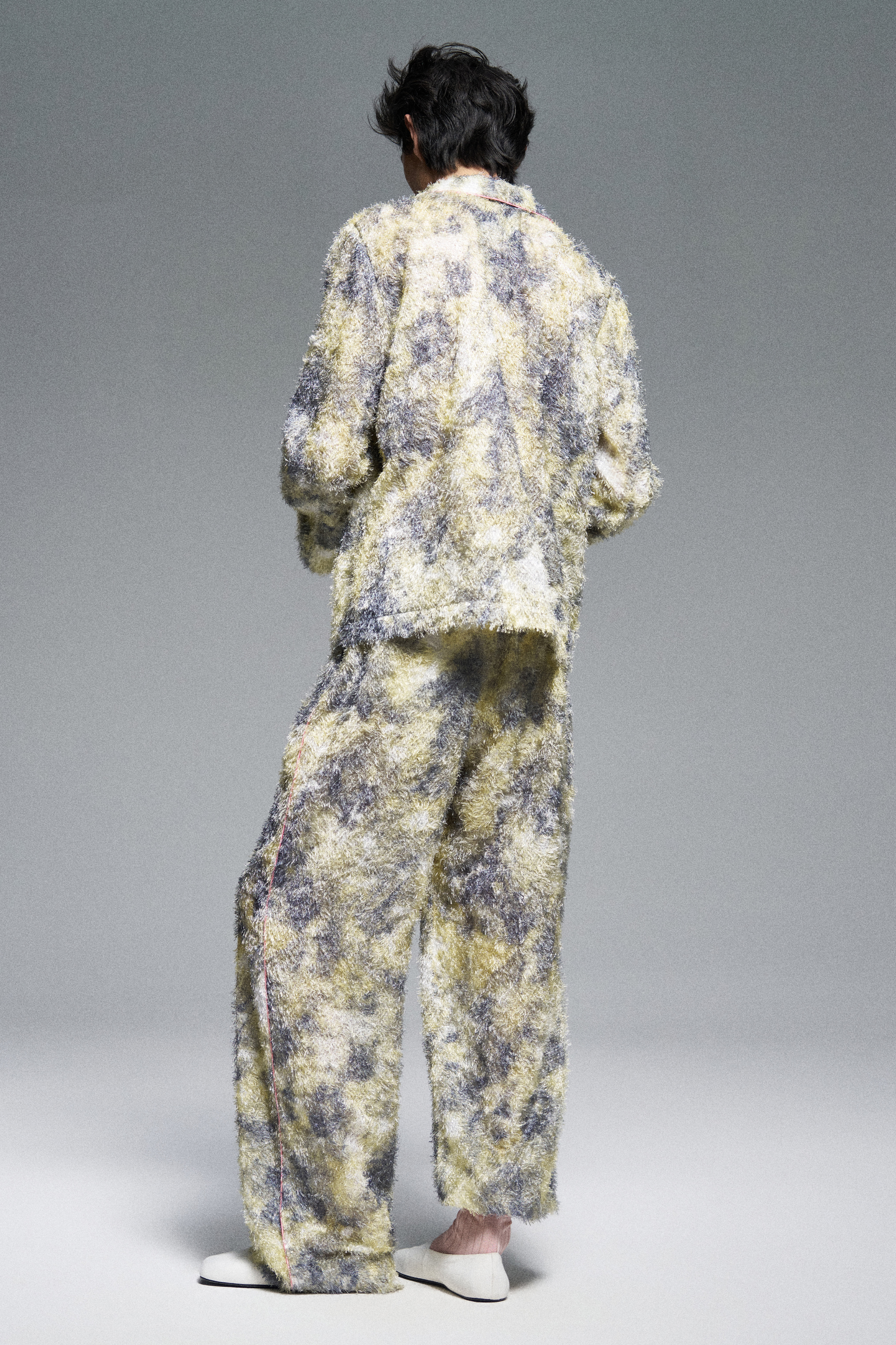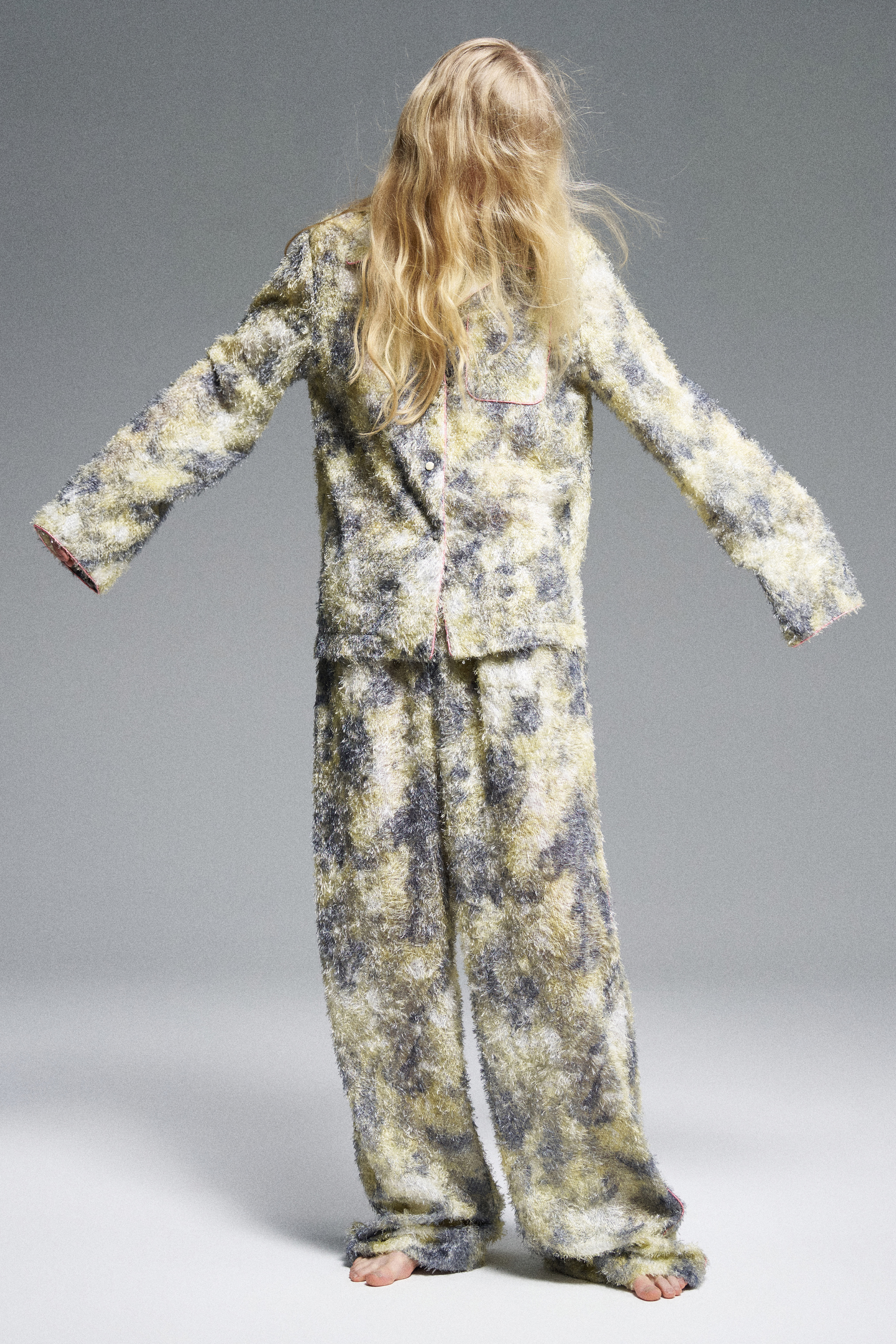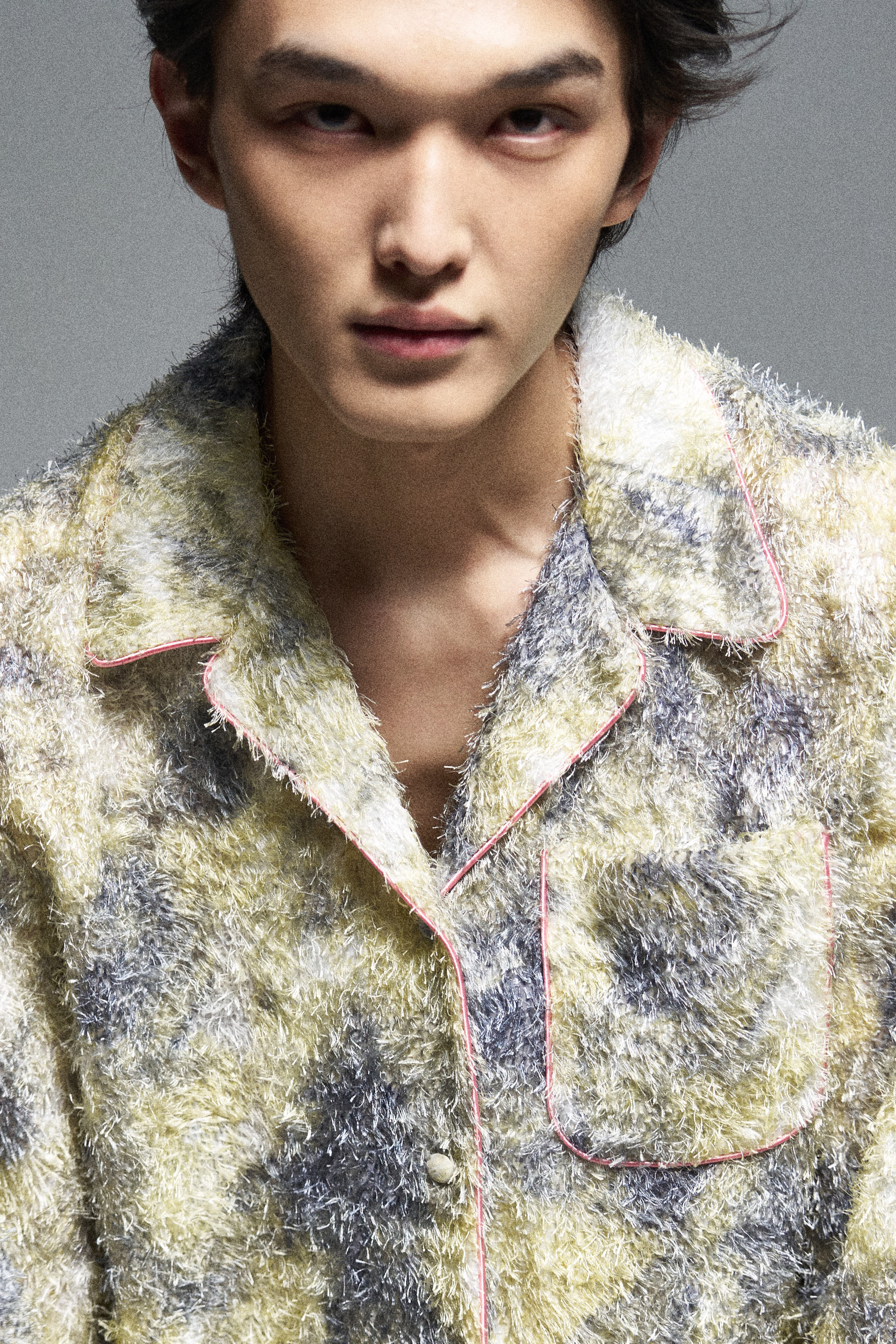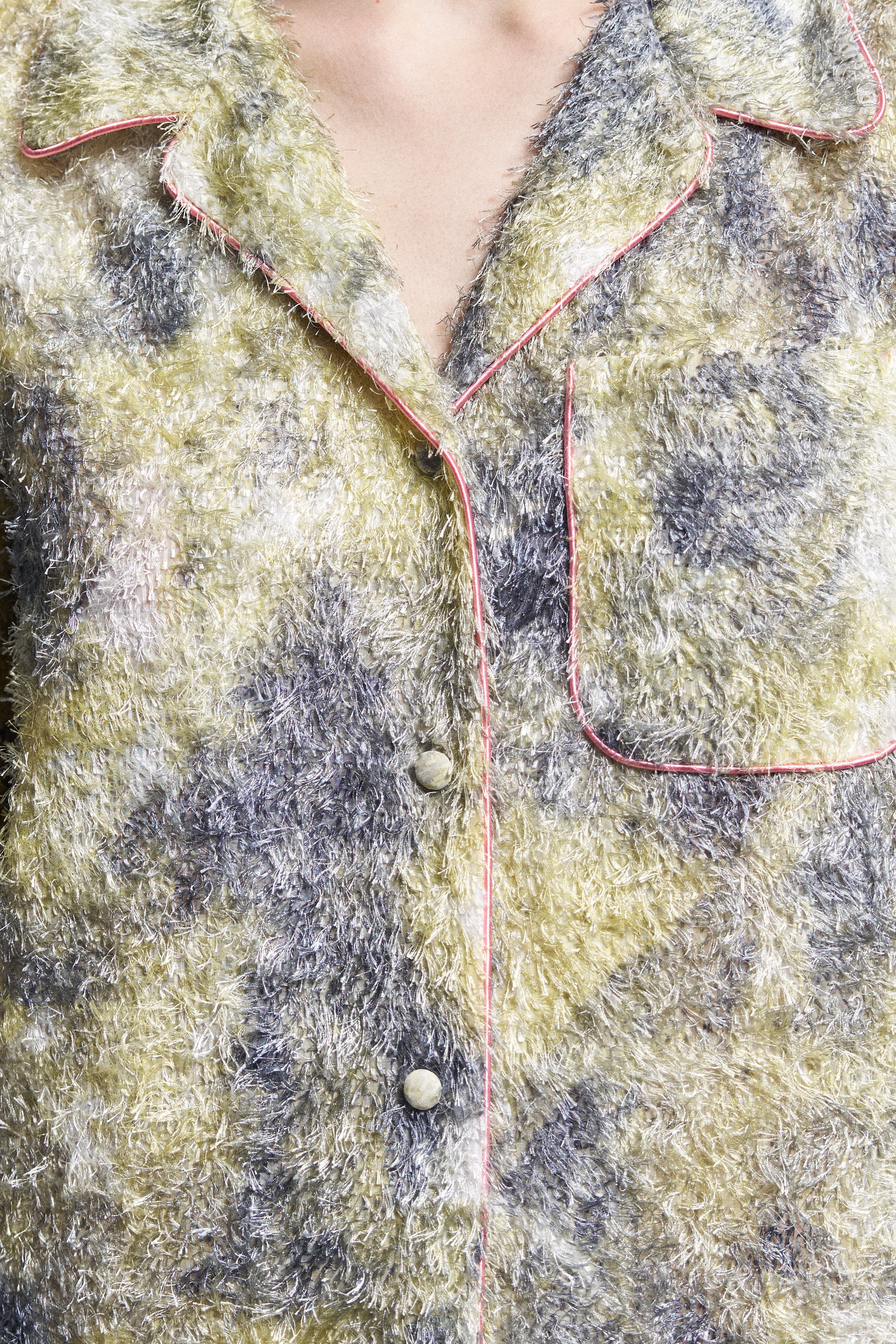 Пижамная рубашка свободного кроя. Выполнена из шифона с жаккардовым переплетением нитей, создающим эффект «травы». Модель с контрастными шелковыми кантами и нагрудным карманом. Отложной воротник.