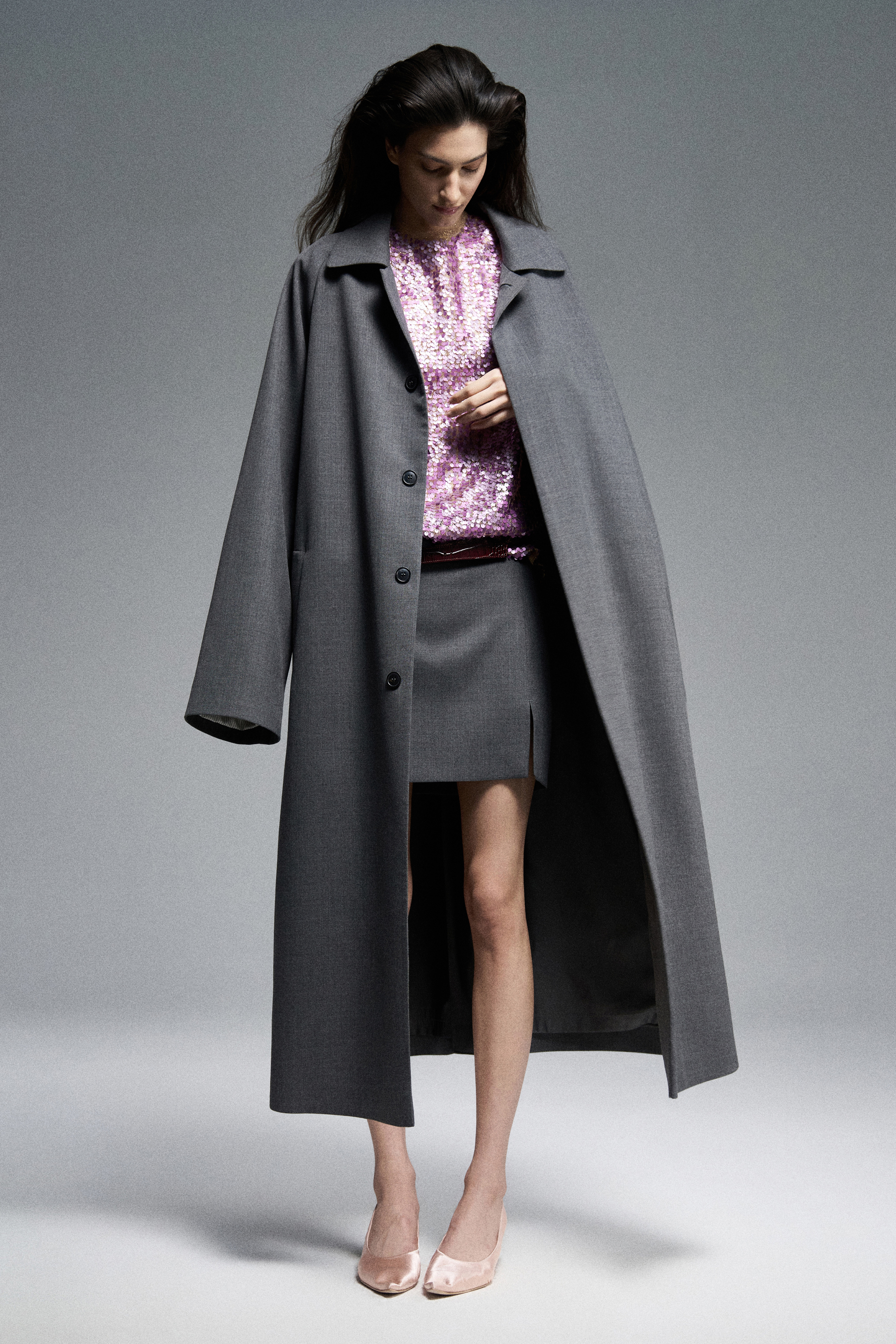 Мини-юбка из костюмной ткани с асимметричными разрезами. Особенность модели — в один из размеров интегрирована вставка из легкого шелкового шифона, контрастирующая с текстурой основной ткани. Застегивается на потайную молнию.