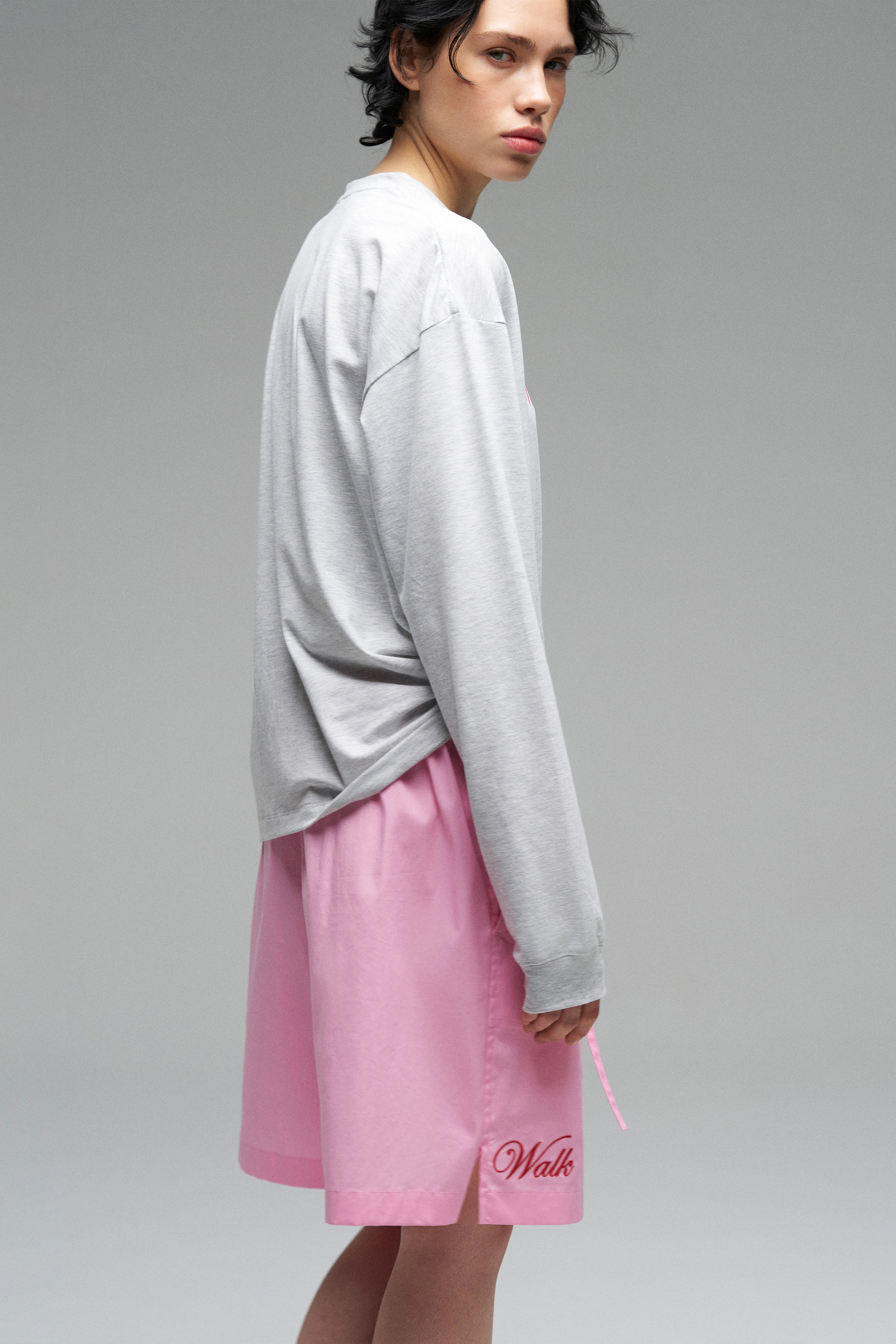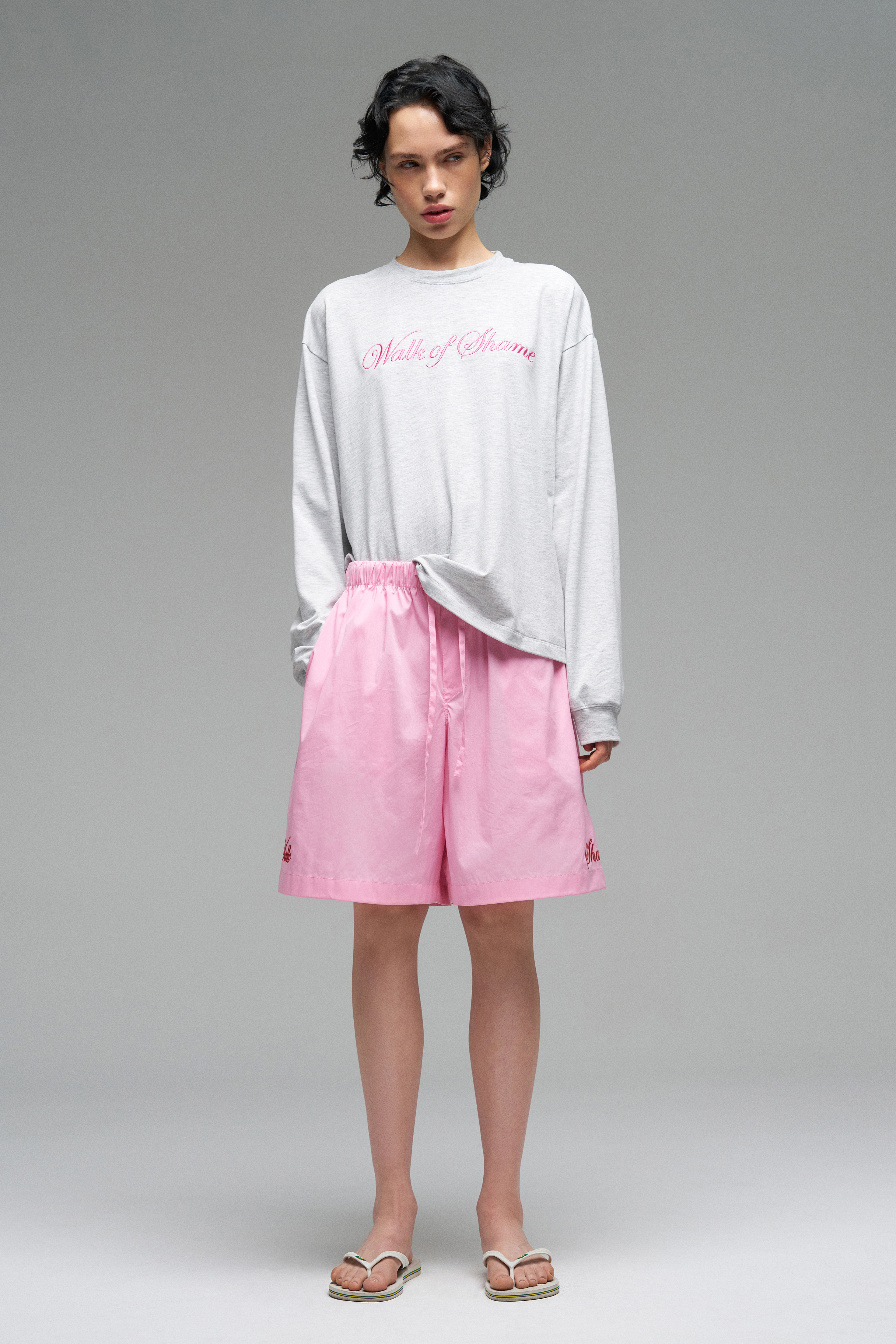 Лонгслив с эластичными манжетами на рукавах и горловине. Модель с контрастной вышивкой розового цвета «Walk of Shame». Лонгслив прямого кроя со спущенной линией плеч.