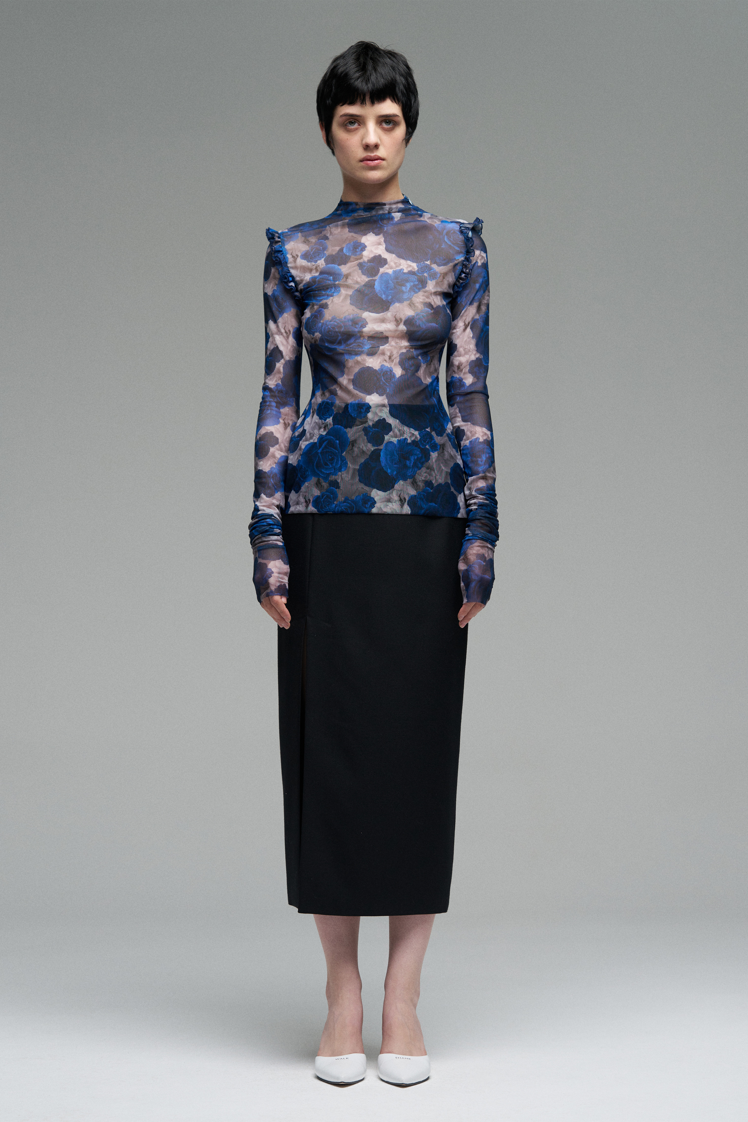 Эластичный топ из полупрозрачной ткани с принтом роз. Рюши проходят по линии плеч. Длинные рукава плотно прилегают за счёт эластичности материала. Ткань комфортно тянется и адаптируется к фигуре.