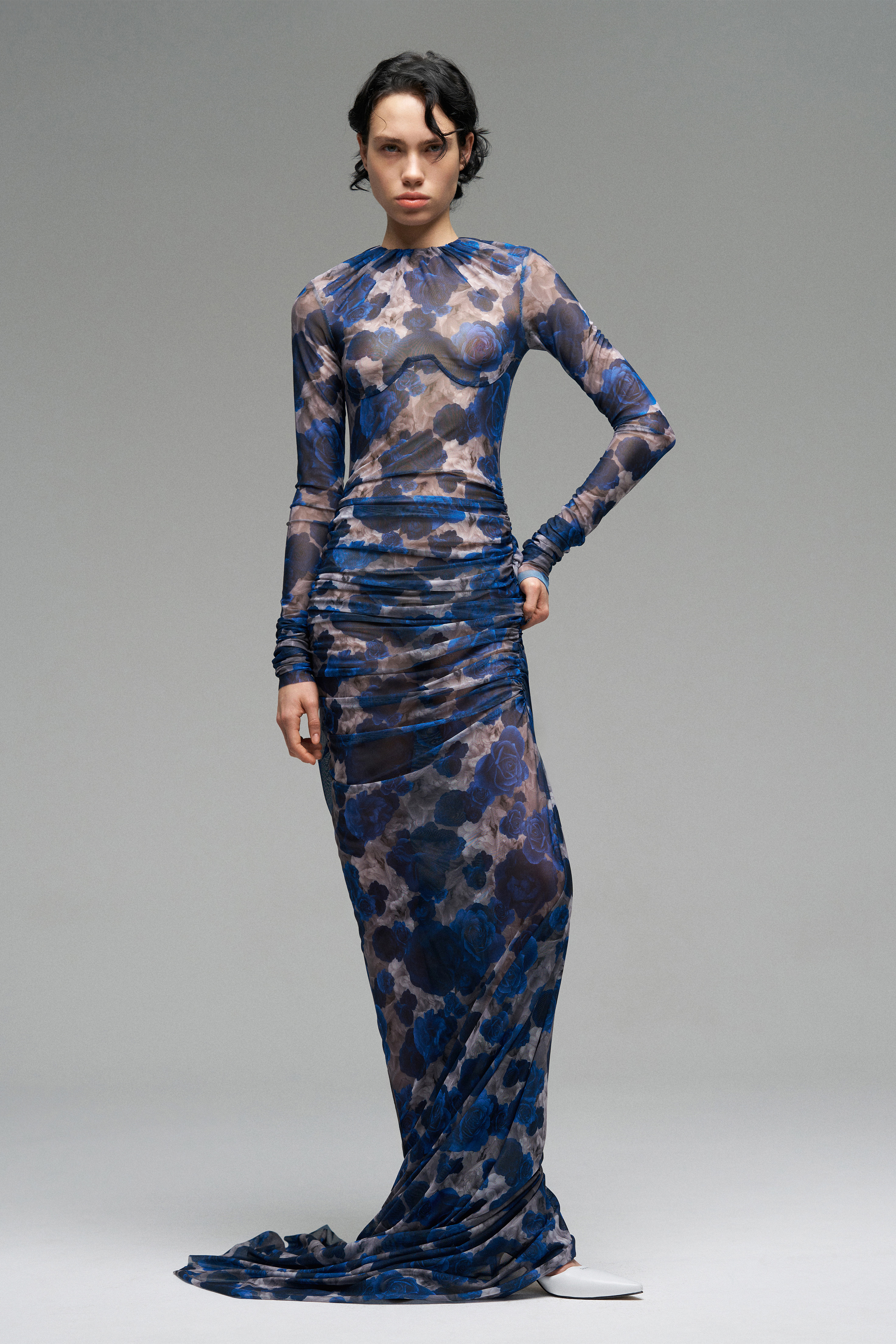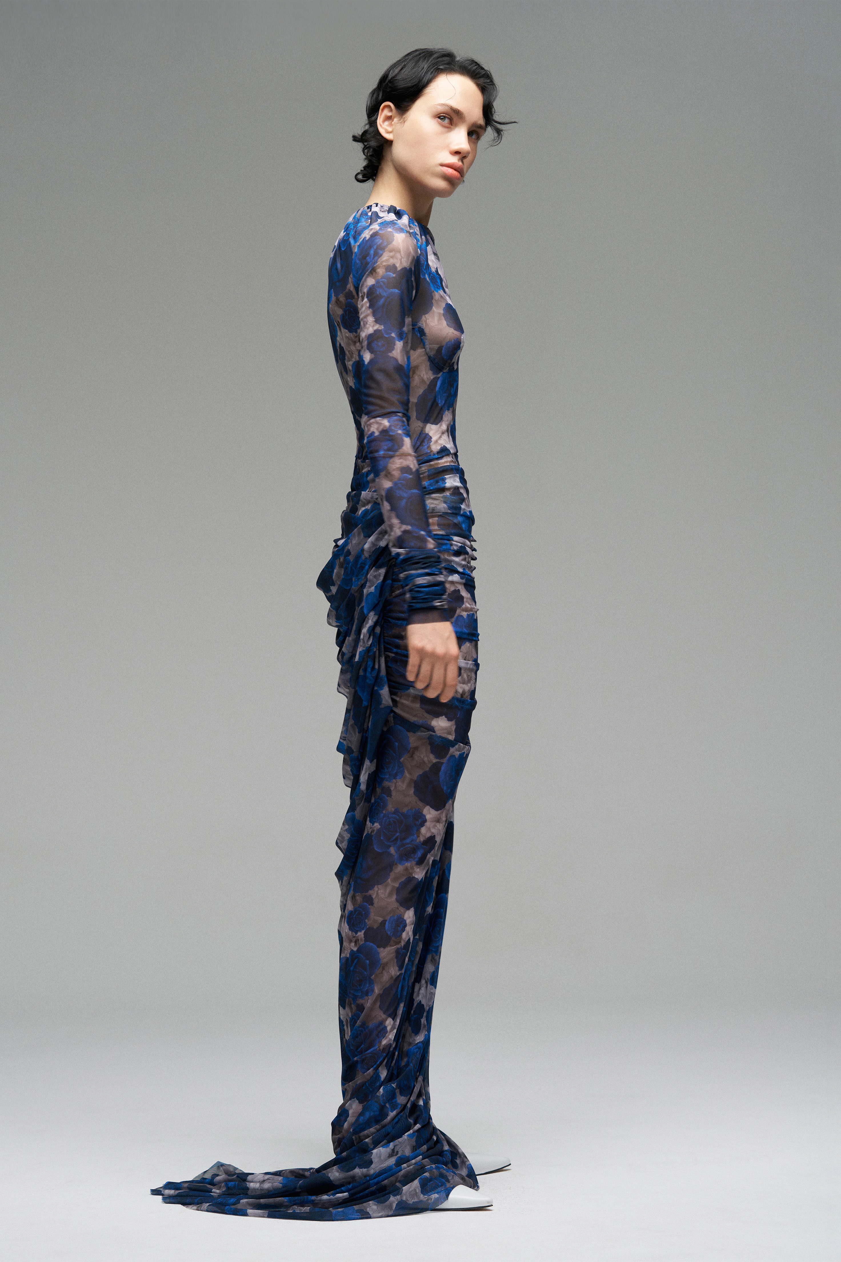 Платье из эластичной сетки с принтом роз. Полупрозрачная ткань мягко драпируется по телу, создавая акцент на силуэте. В конструкции — имитация косточек под грудью. Сзади — турнюр и удлинённый шлейф, придающие объём и движение.