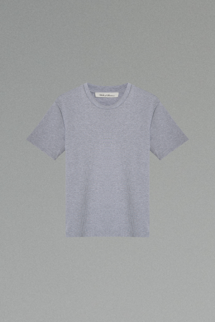 Футболка серого цвета с отделкой из рифлёного канта Ribbed по вороту и рукавам. Прямой силуэт, классическая посадка. Сзади нашивка с логотипом бренда.