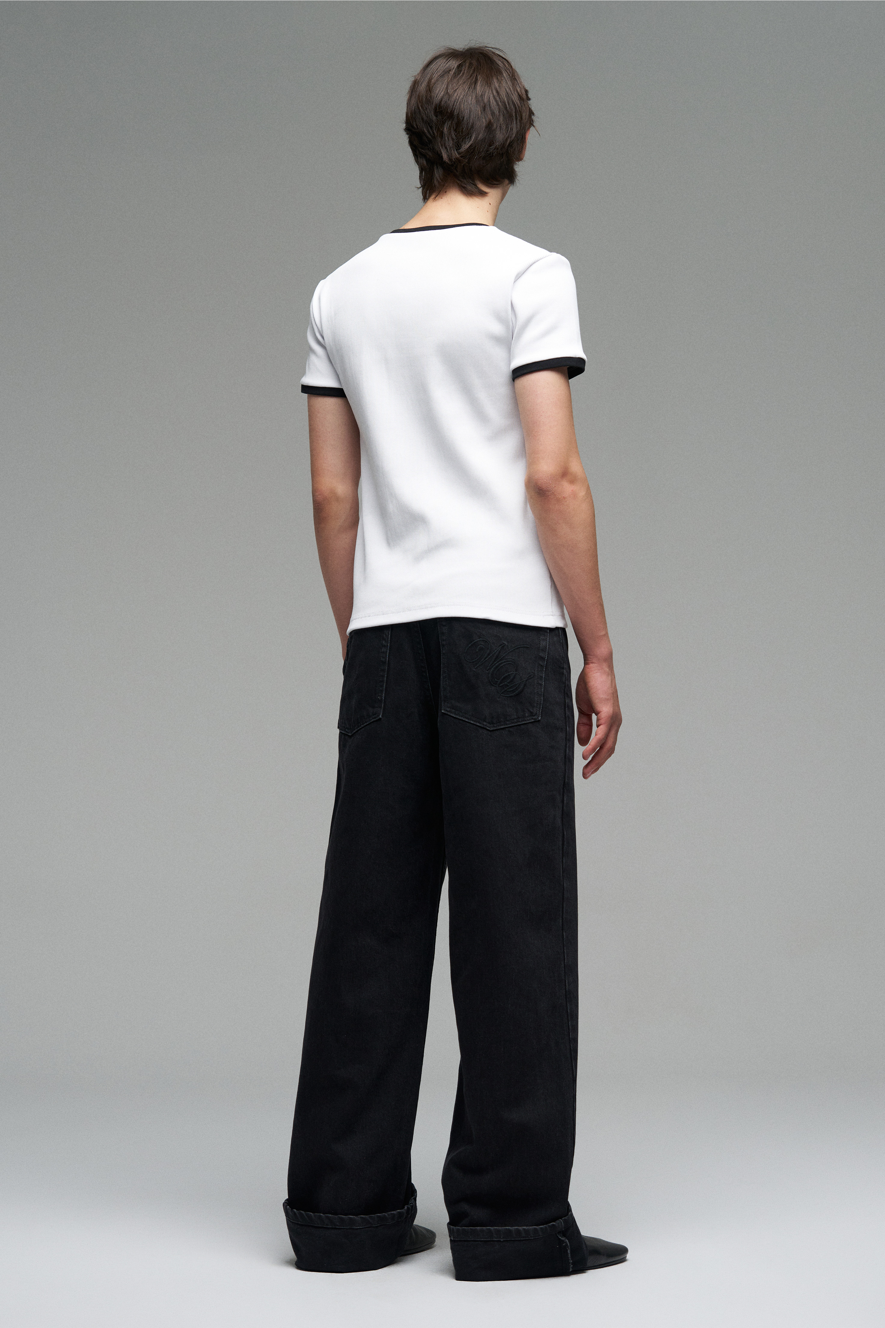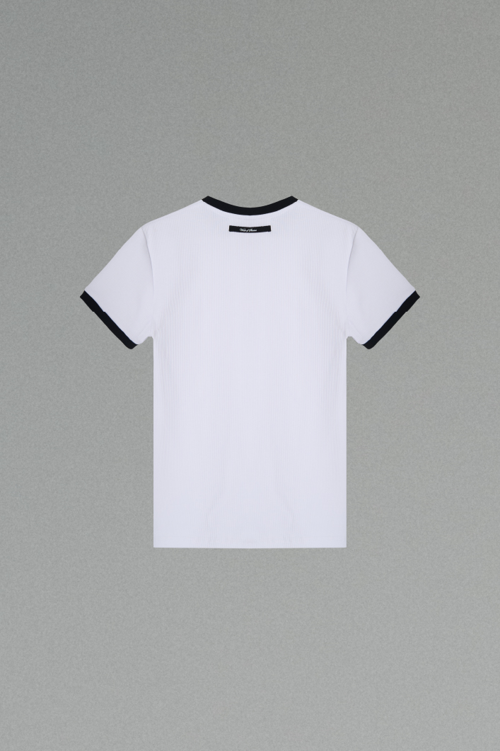 Футболка белого цвета с контрастной отделкой из черного рифлёного канта Ribbed по вороту и рукавам. Прямой силуэт, классическая посадка.