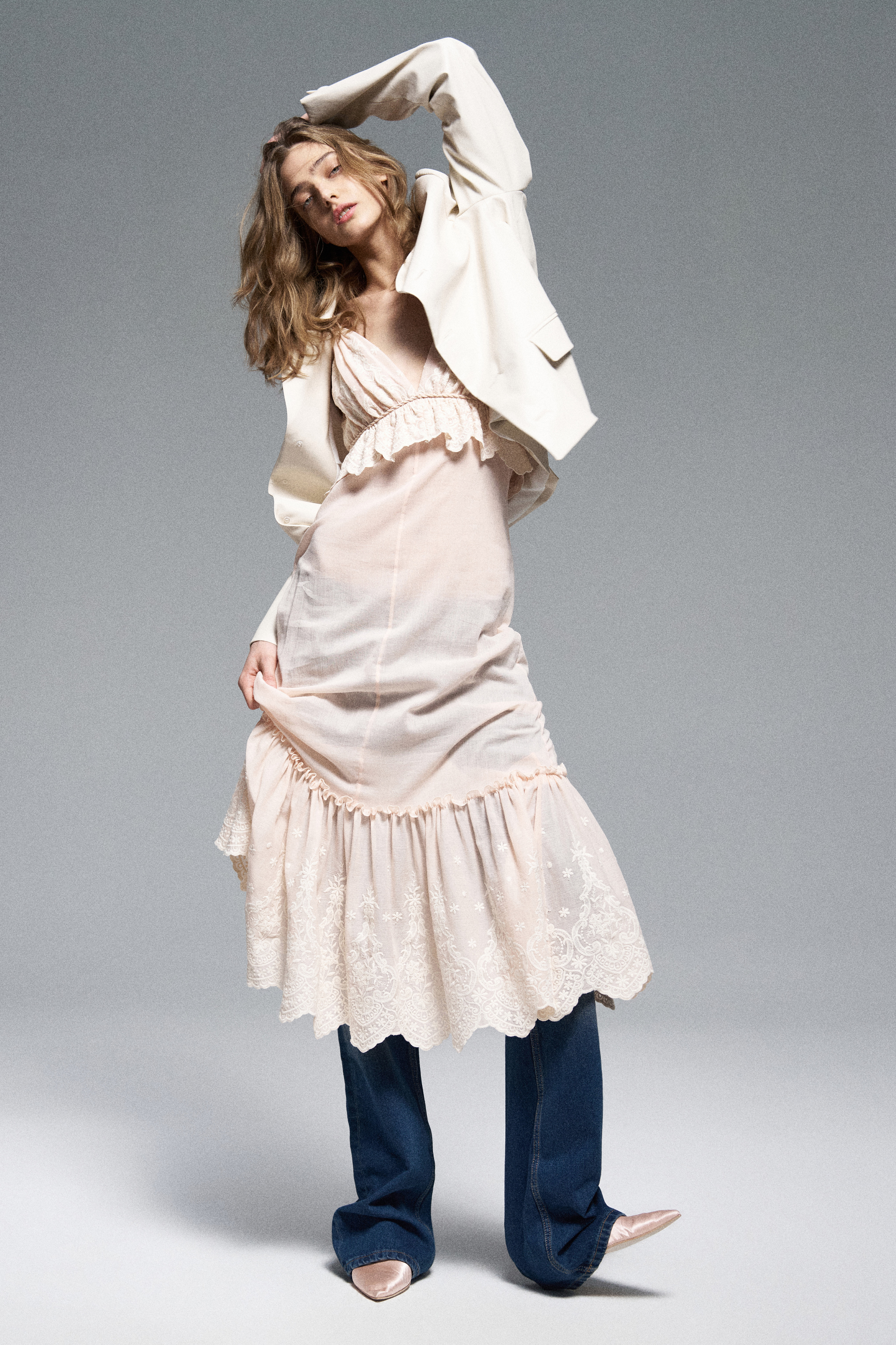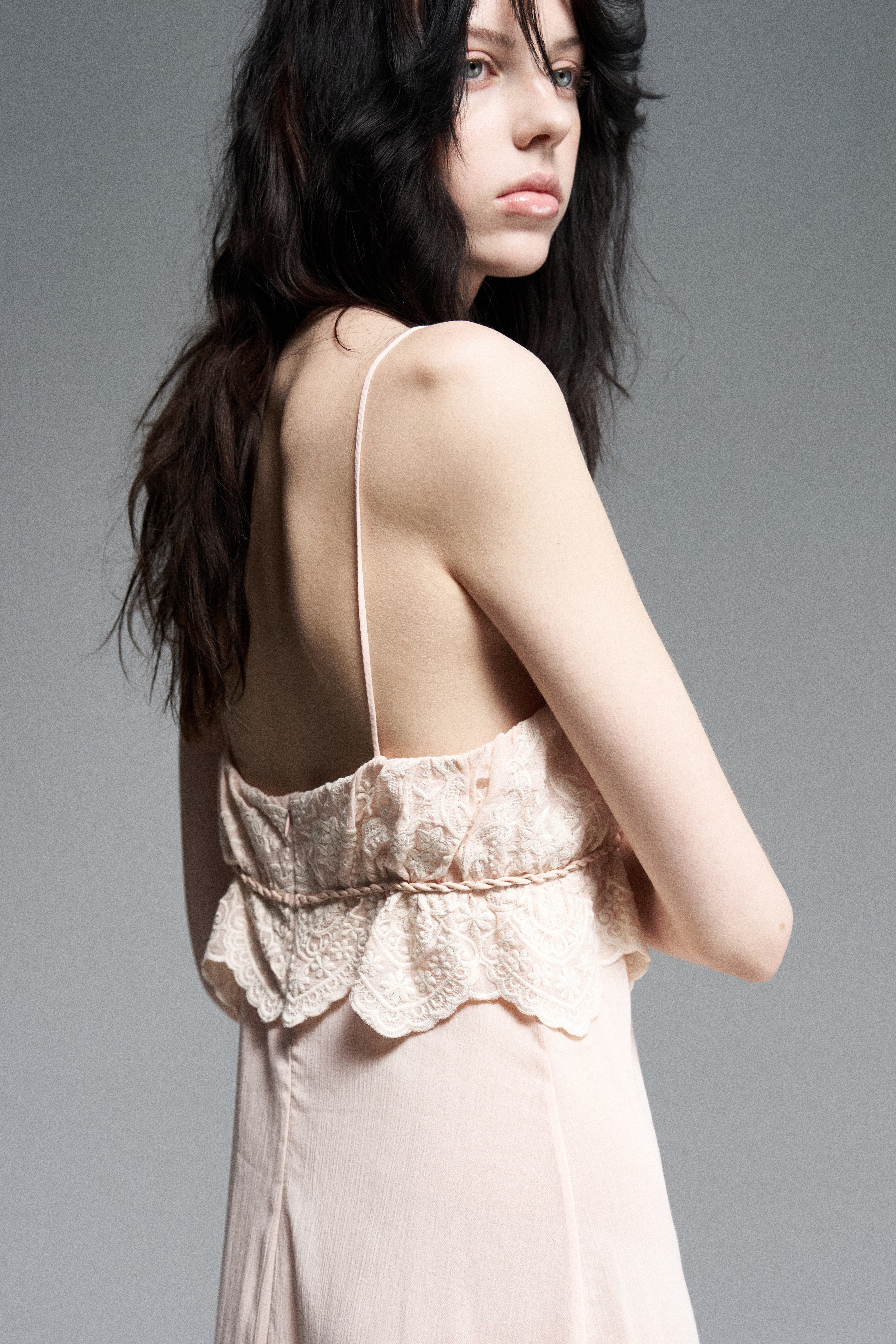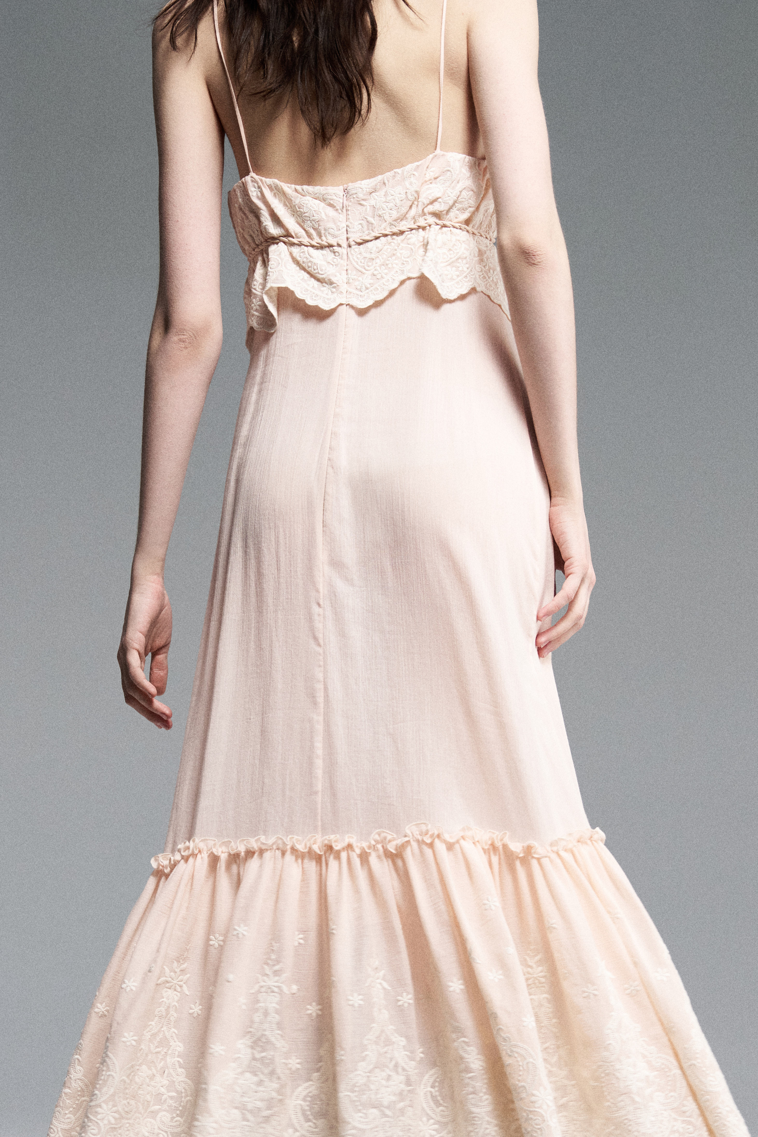 Платье из хлопкового батиста с вышивкой ришелье на тонких бретелях. Модель с подрезной чашечкой под грудью. По лифу выложена мягкая драпировка, дополненная фестоном, направленным вниз и затягивающимся на шелковые ленты, сплетенные в косичку. По низу платье оформлено высоким притачным воланом с фестоном.