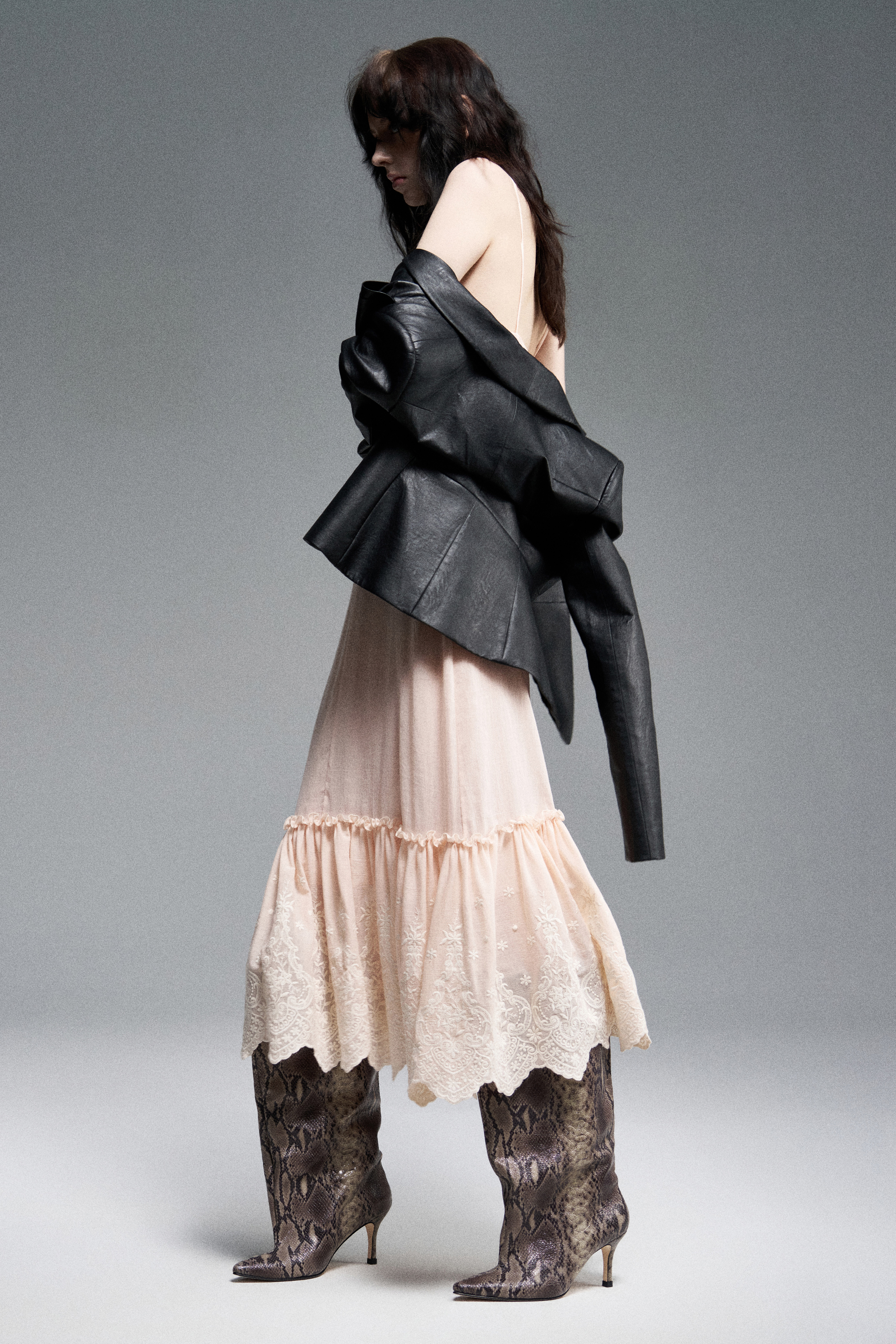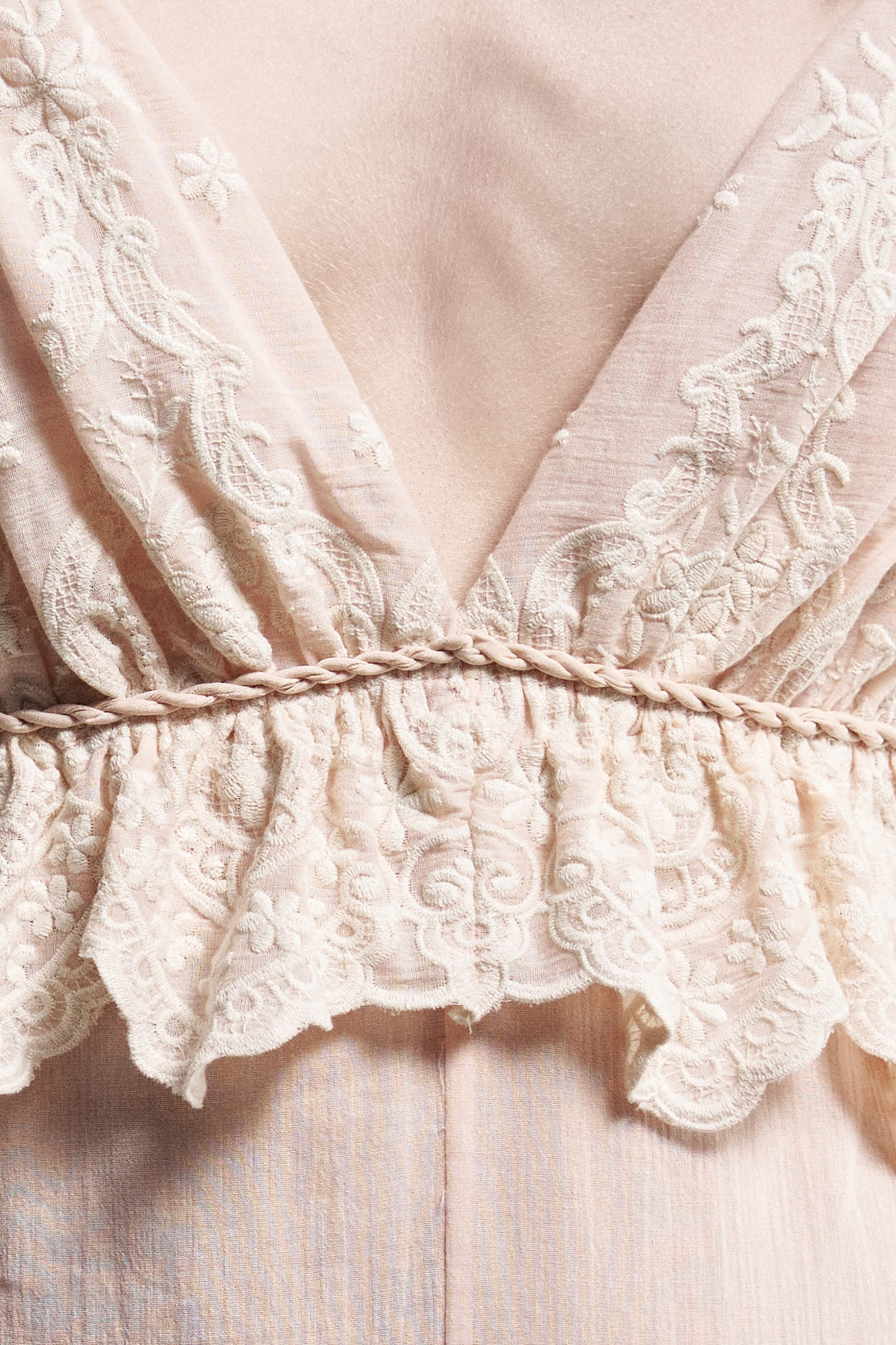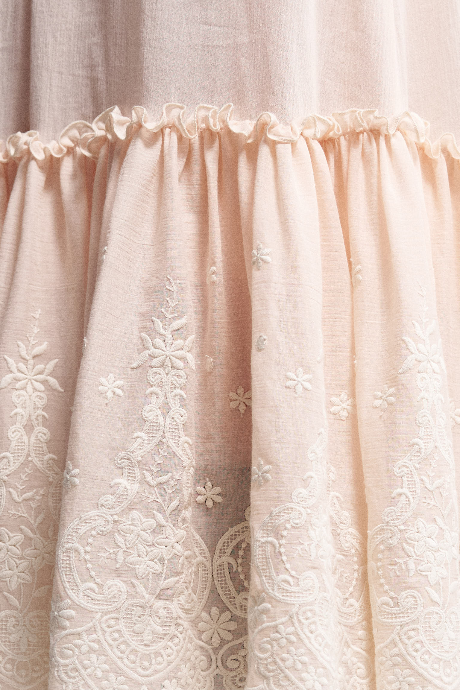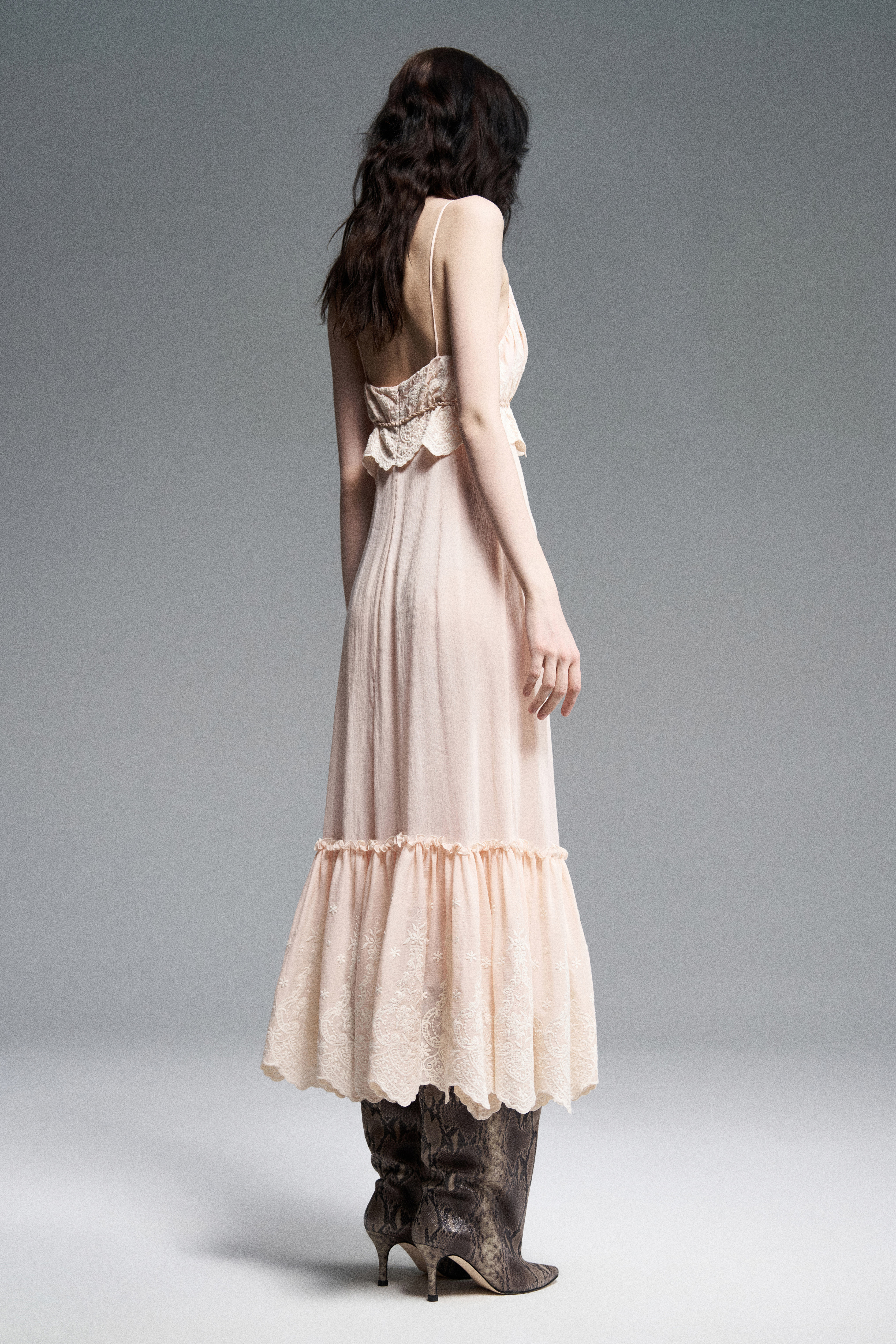 Платье из хлопкового батиста с вышивкой ришелье на тонких бретелях. Модель с подрезной чашечкой под грудью. По лифу выложена мягкая драпировка, дополненная фестоном, направленным вниз и затягивающимся на шелковые ленты, сплетенные в косичку. По низу платье оформлено высоким притачным воланом с фестоном.
