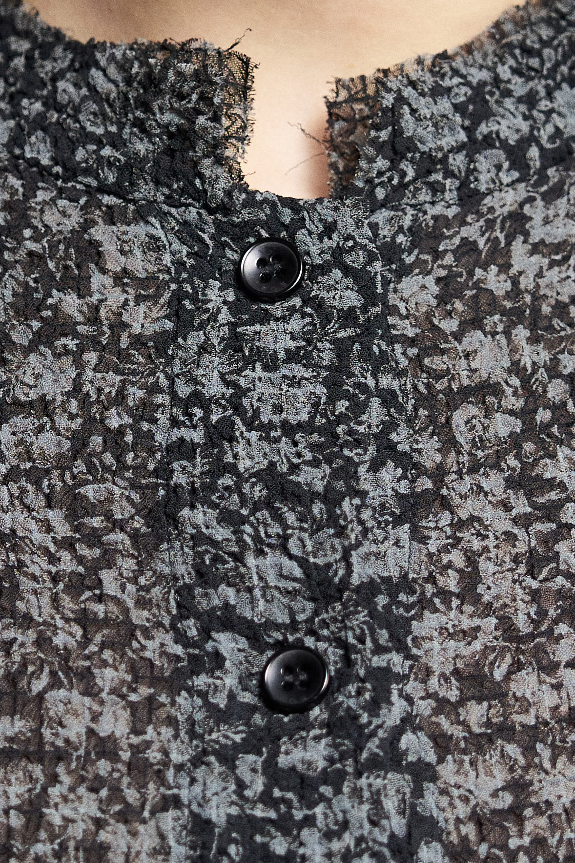 Укороченная рубашка с коротким рукавом из ткани с эффектом жатости. Приталенный силуэт. Воротник-стойка выполнен в технике обработки горловины косой бейкой.