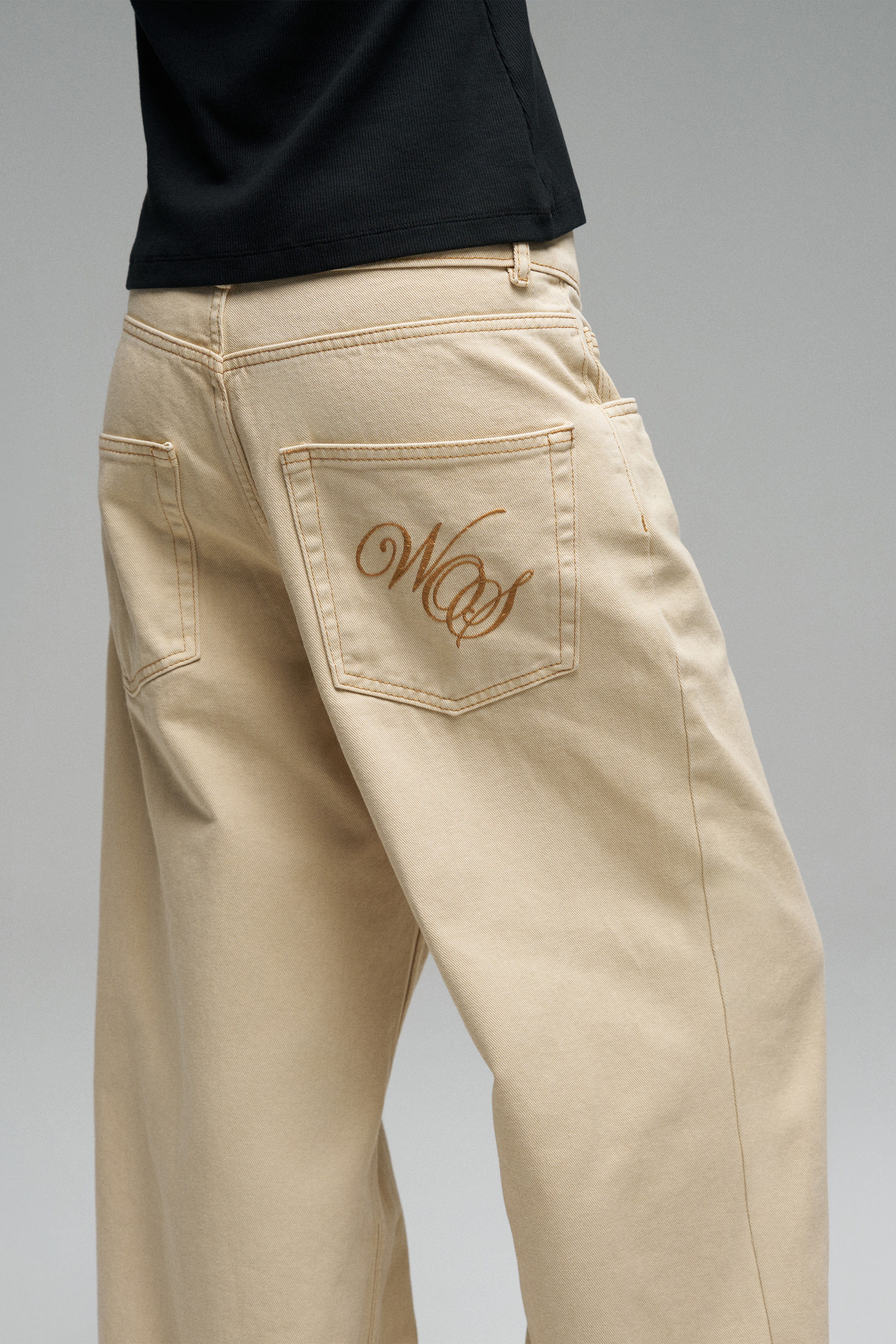Джинсы на низкой посадке изготовлены из плотного денима ручного окрашивания. Декоративная отстрочка выполнена контрастной толстой хлопковой нитью в цвет вензеля украшающего накладной карман изделия.