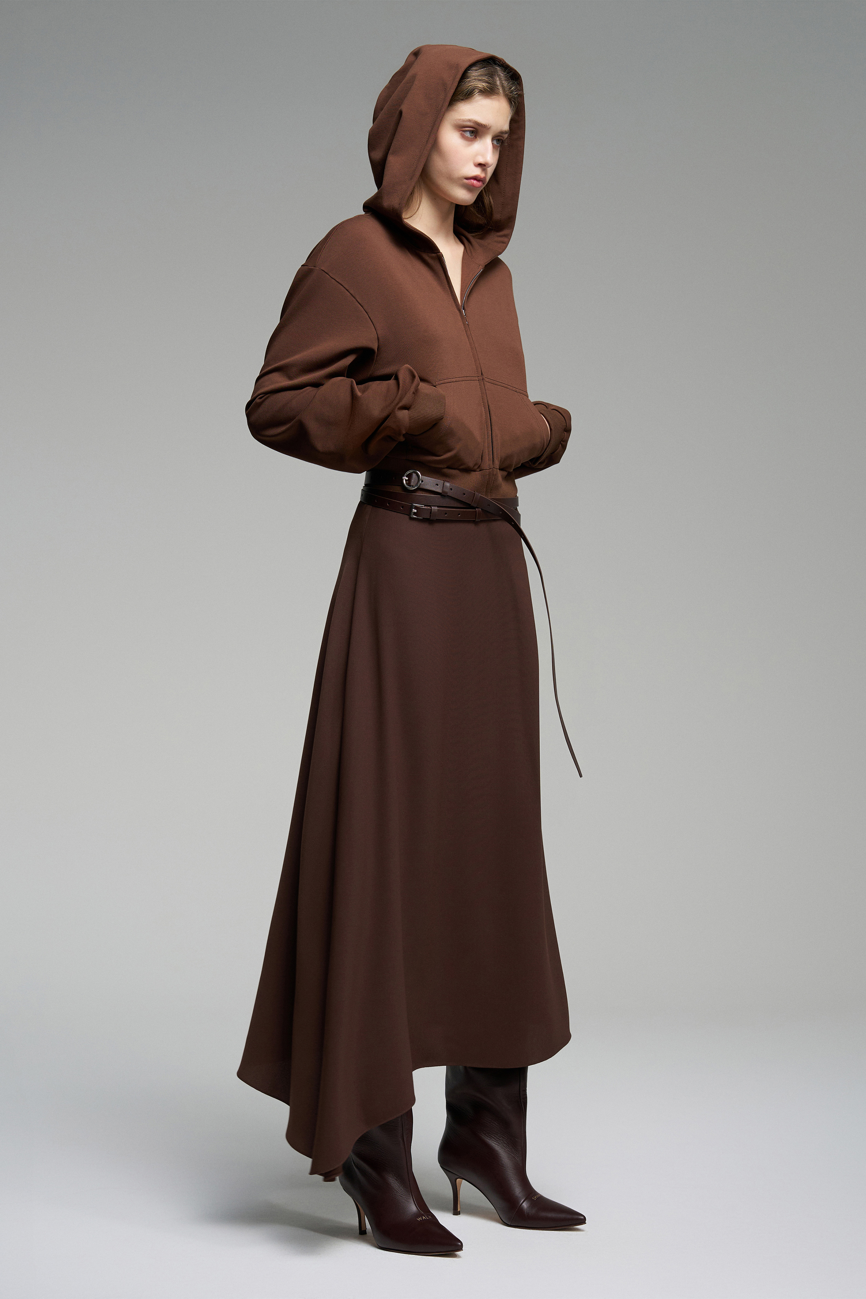 Юбка миди сшита из коричневого крепа. Асимметричный крой придаёт образу динамику, а застёжка на молнию делает посадку удобной и лаконичной. Отсутствие подкладки позволяет ткани идеально повторять силуэт, создавая чистый и графичный образ.