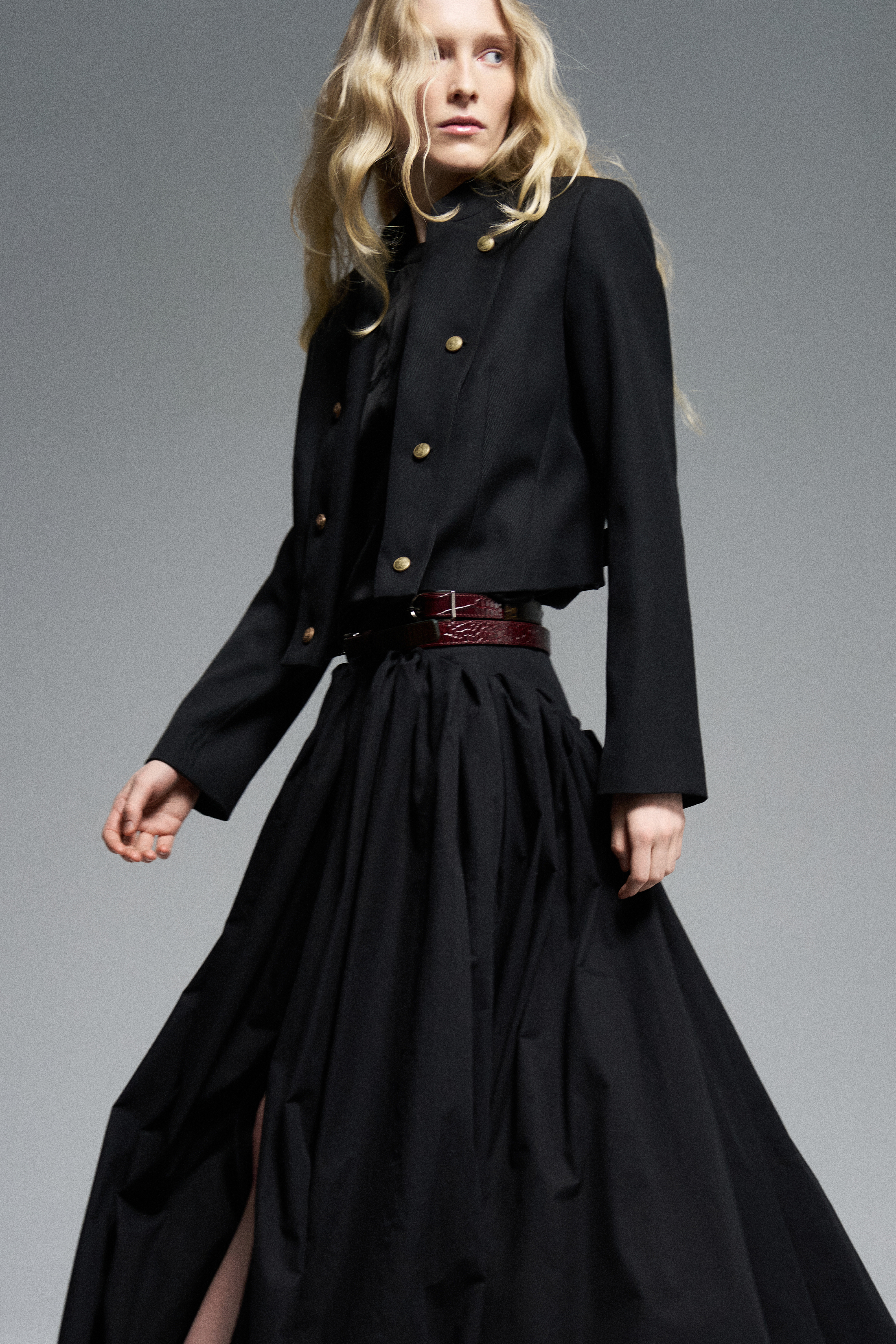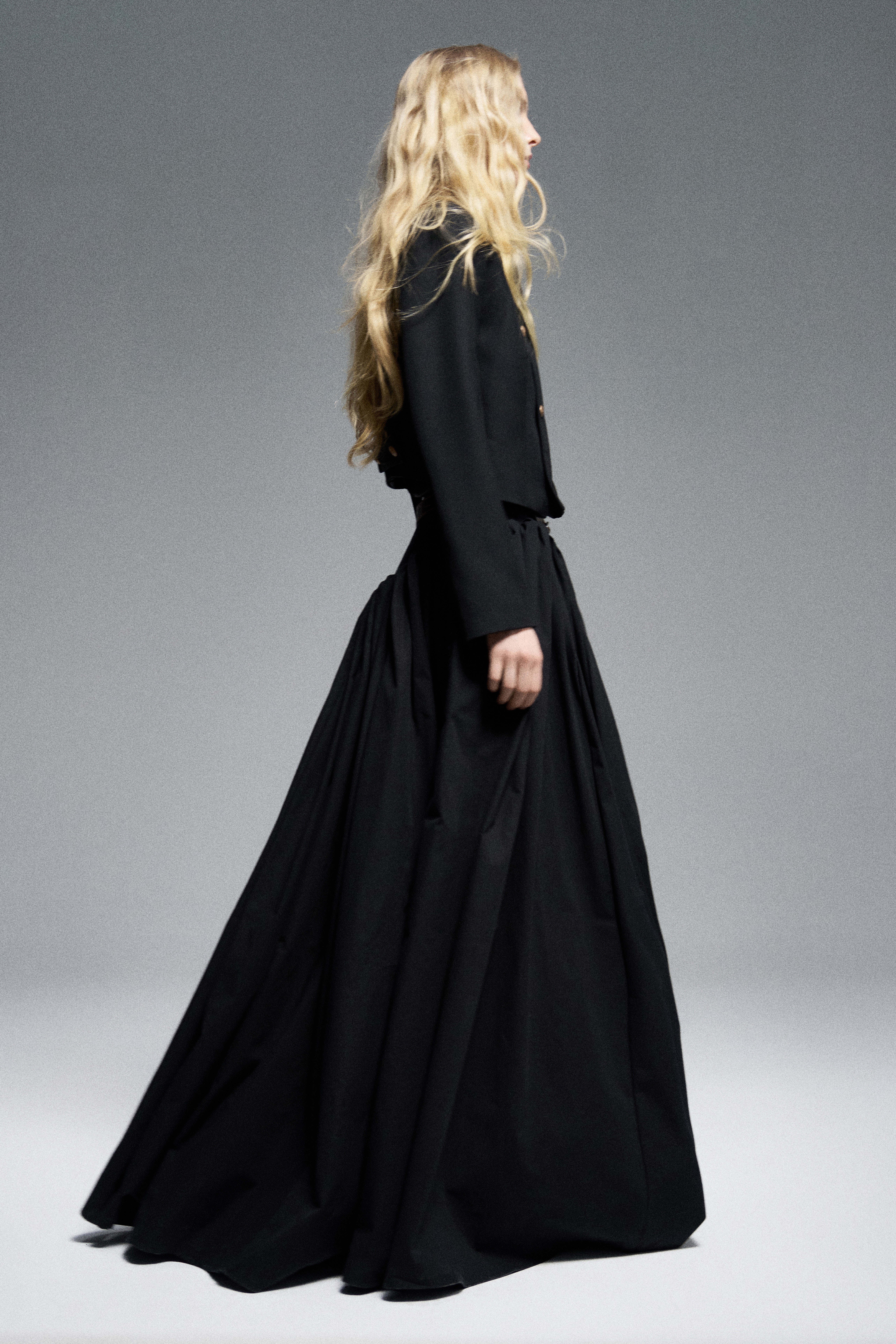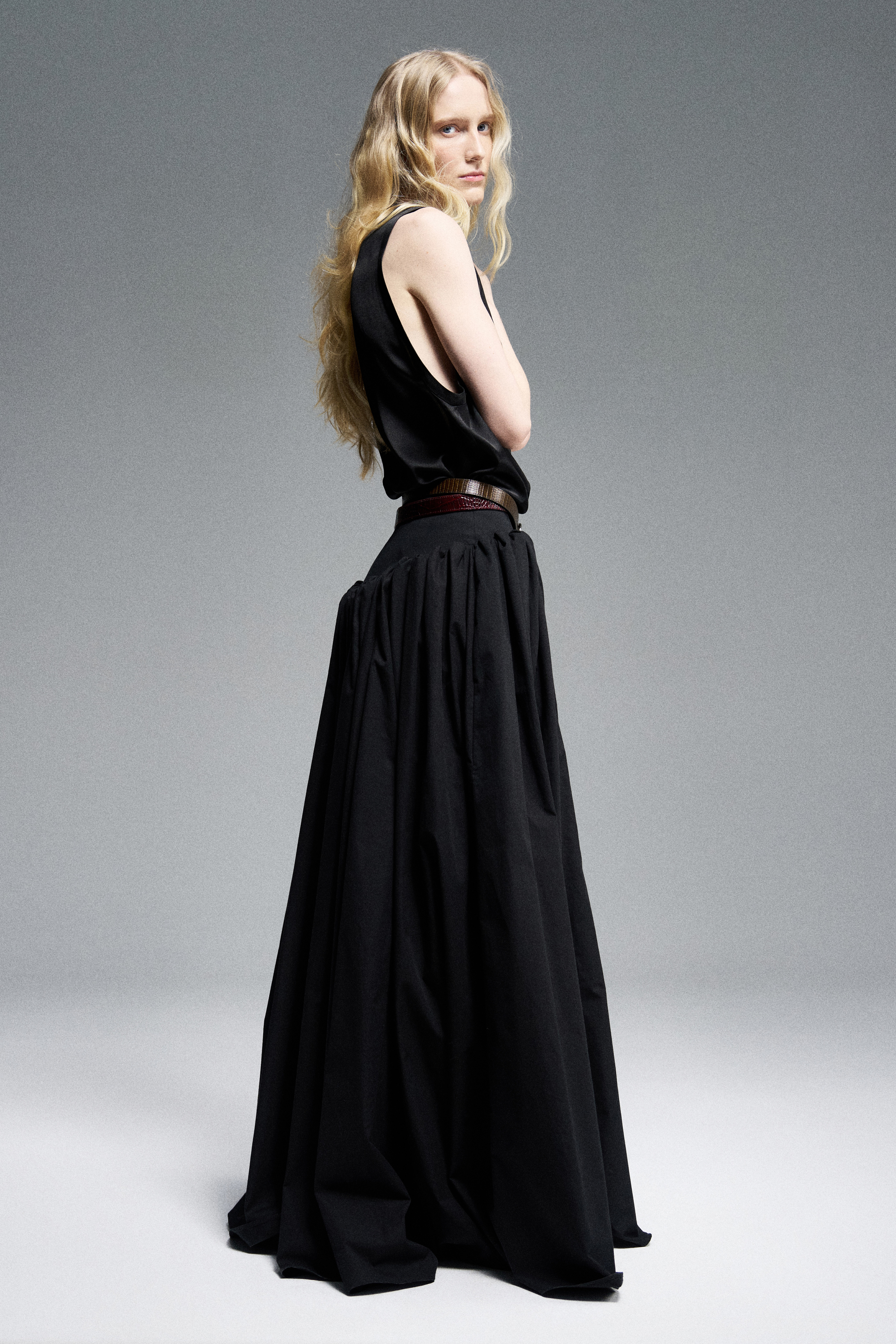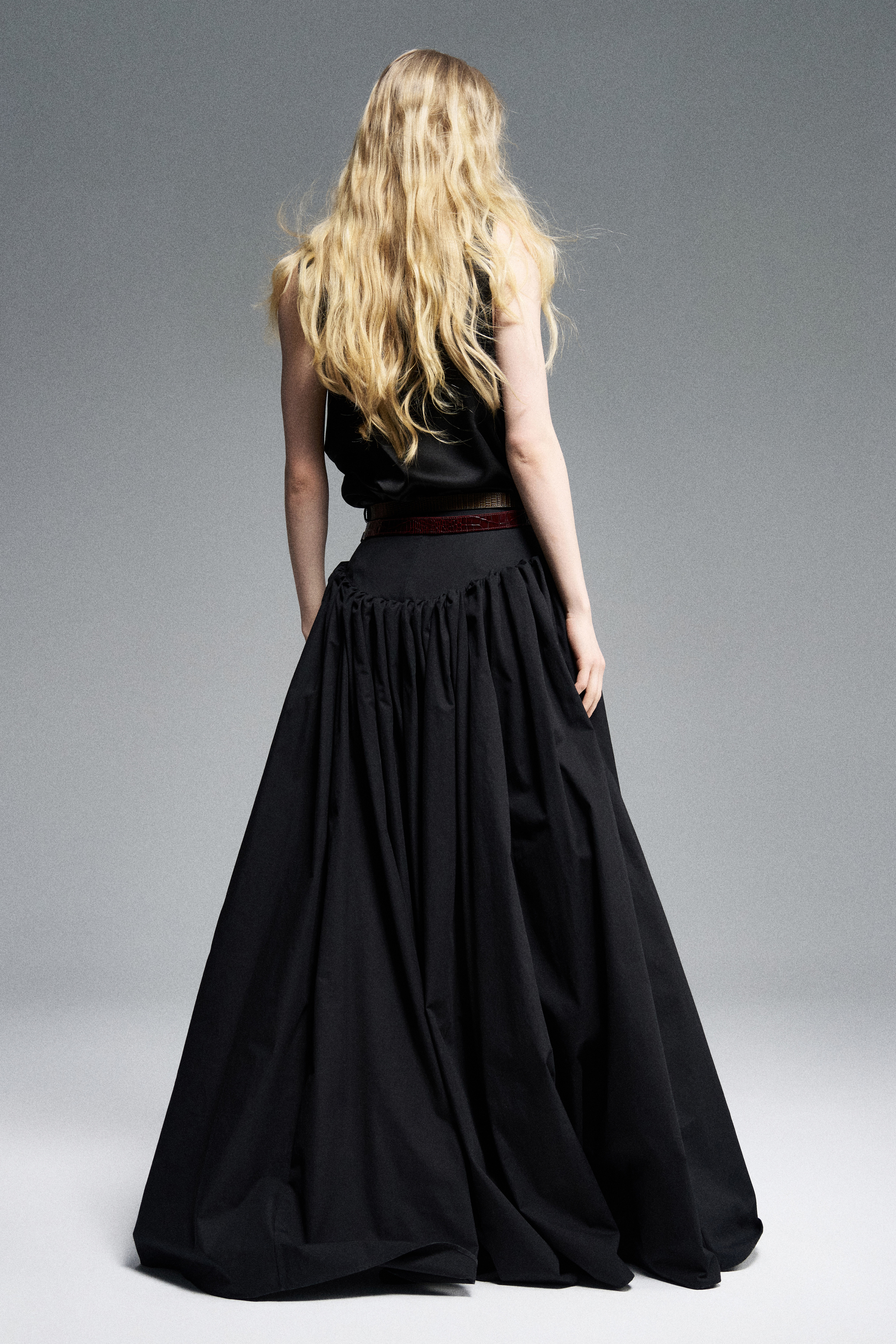 Юбка макси из хлопка. Модель выполнена на удлинённой кокетке, которая подчёркивает линию бёдер и формирует силуэт. От кокетки расходится объёмное полотно, собранное на плотную сборку. Дополнена длинным боковым разрезом.