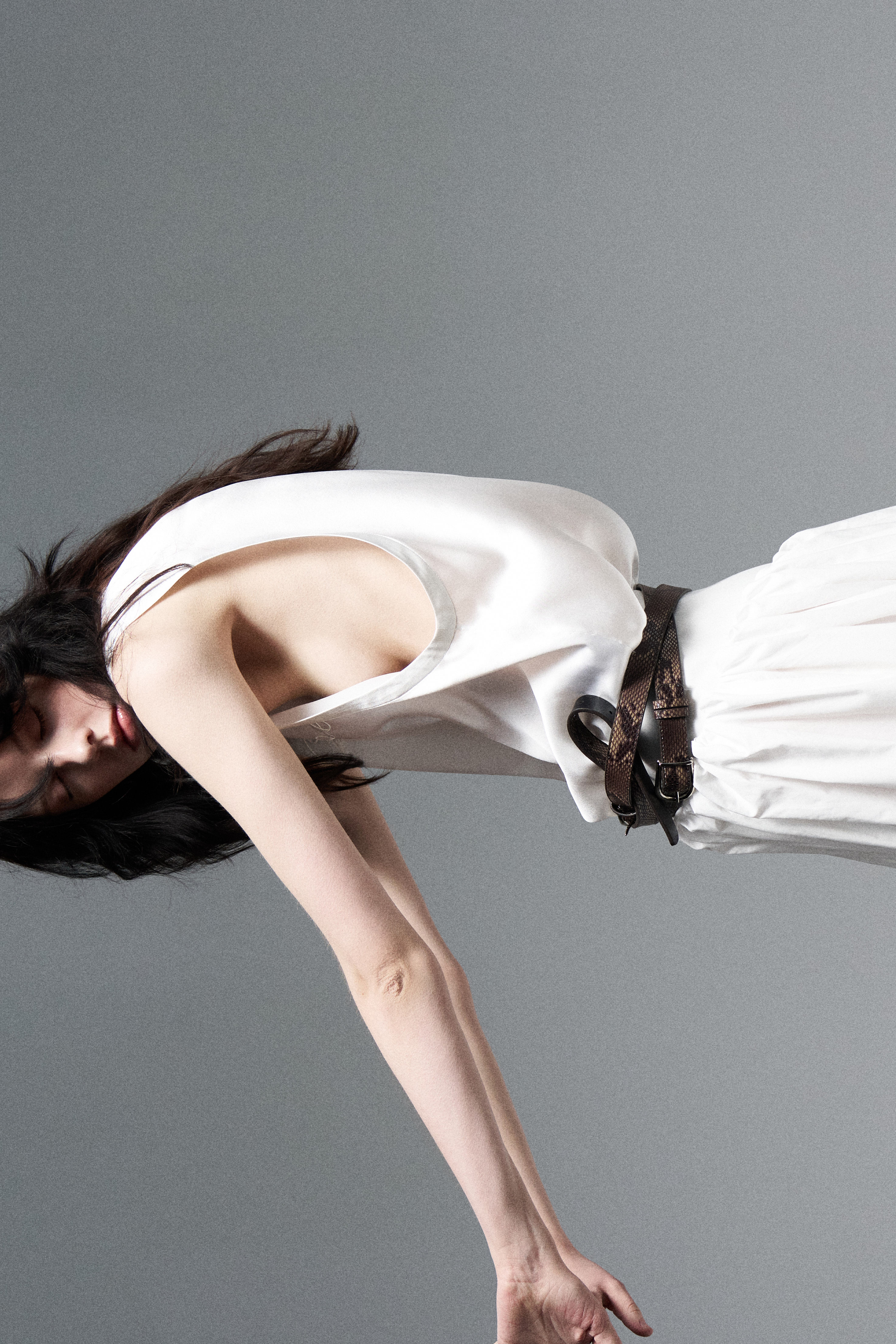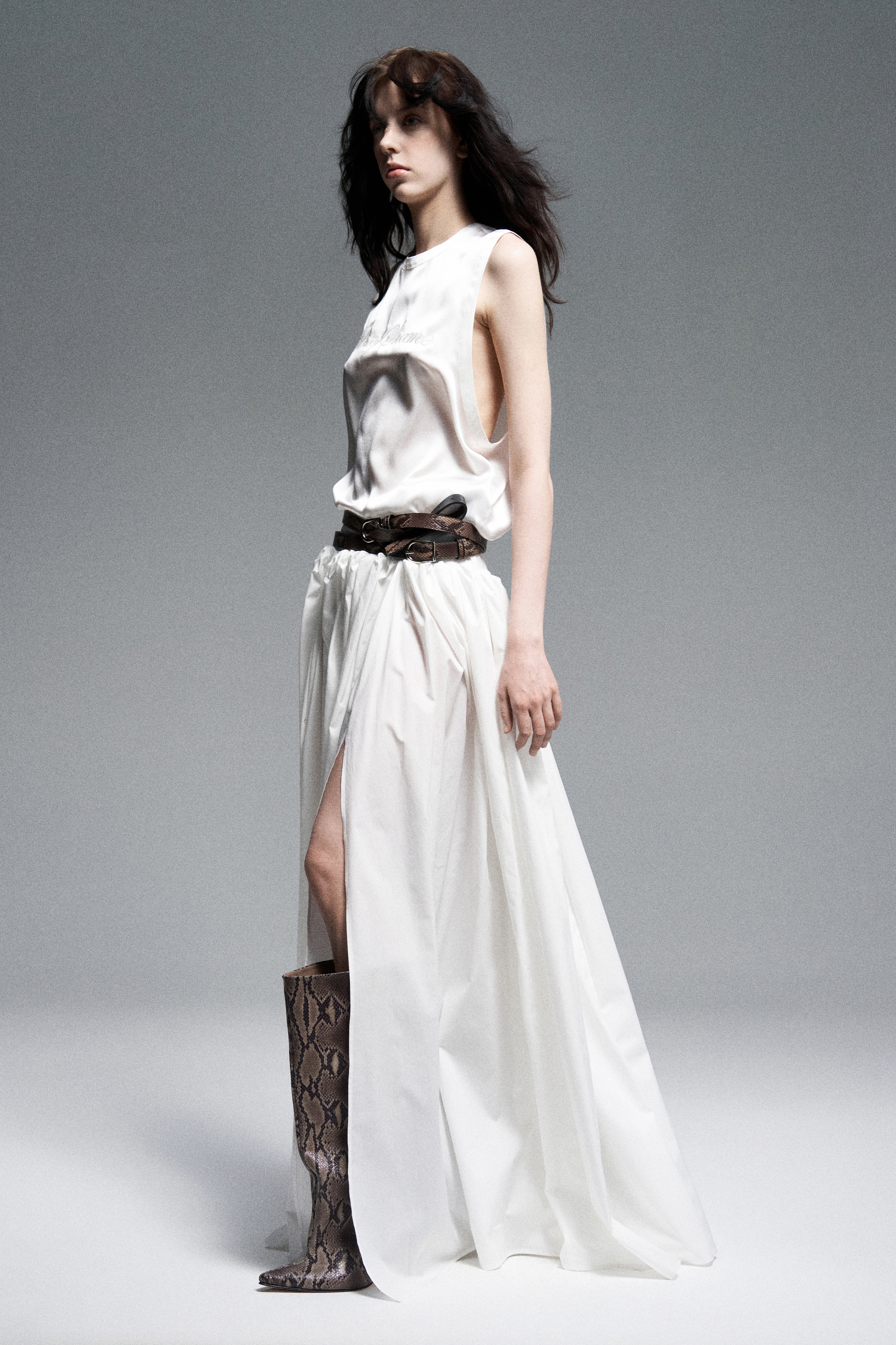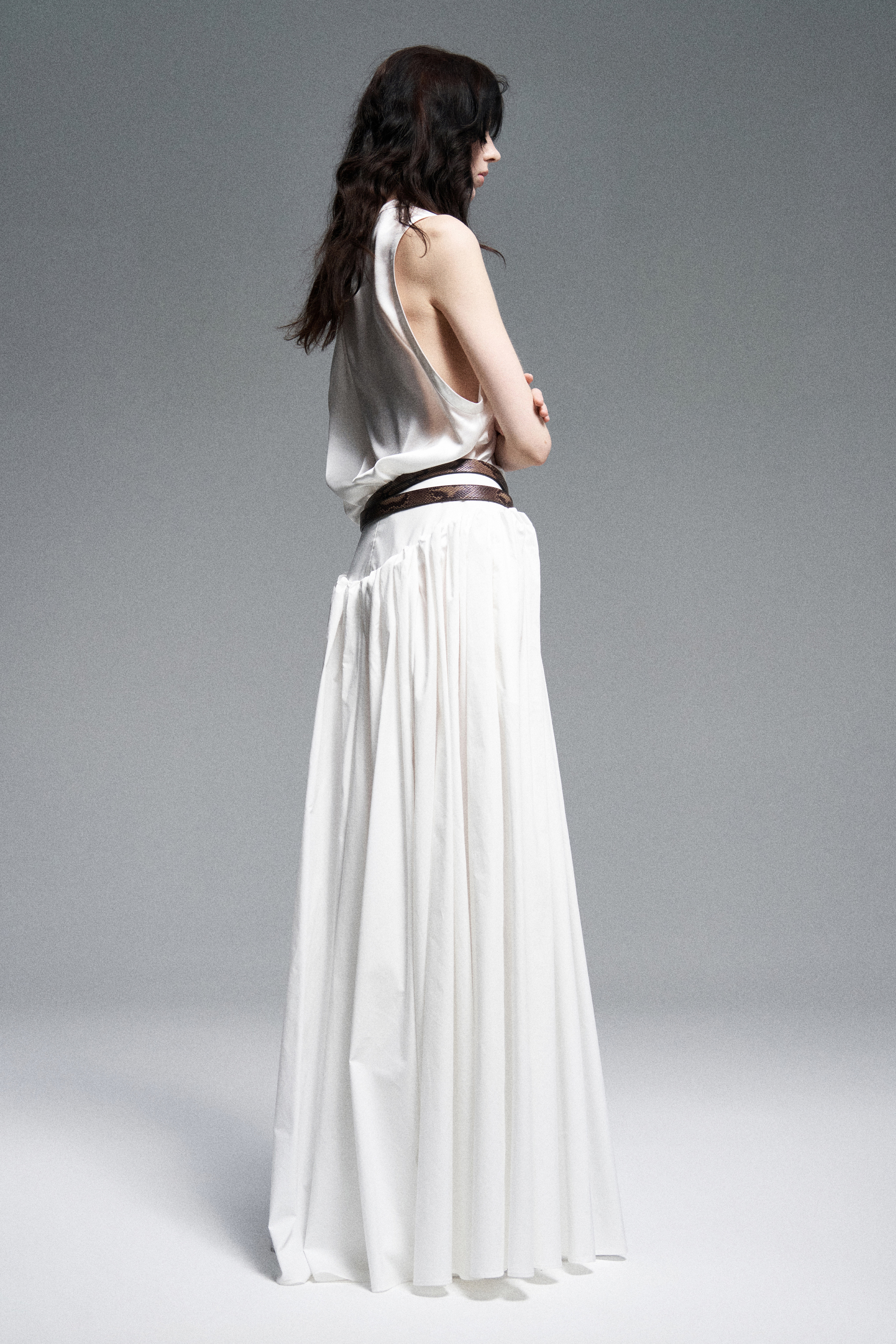 Юбка макси из хлопка. Модель выполнена на удлинённой кокетке, которая подчёркивает линию бёдер и формирует силуэт. От кокетки расходится объёмное полотно, собранное на плотную сборку. Дополнена длинным боковым разрезом.
