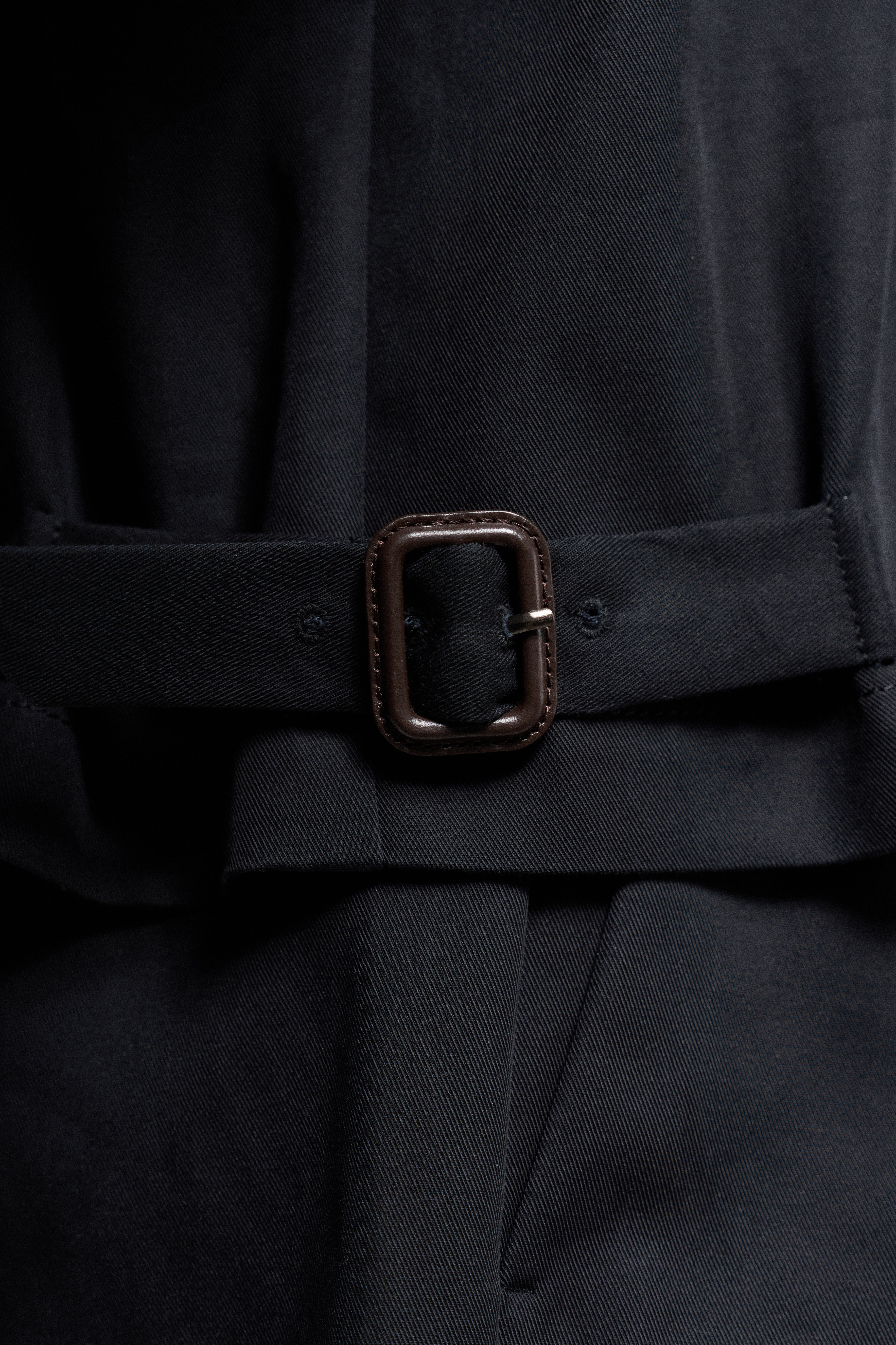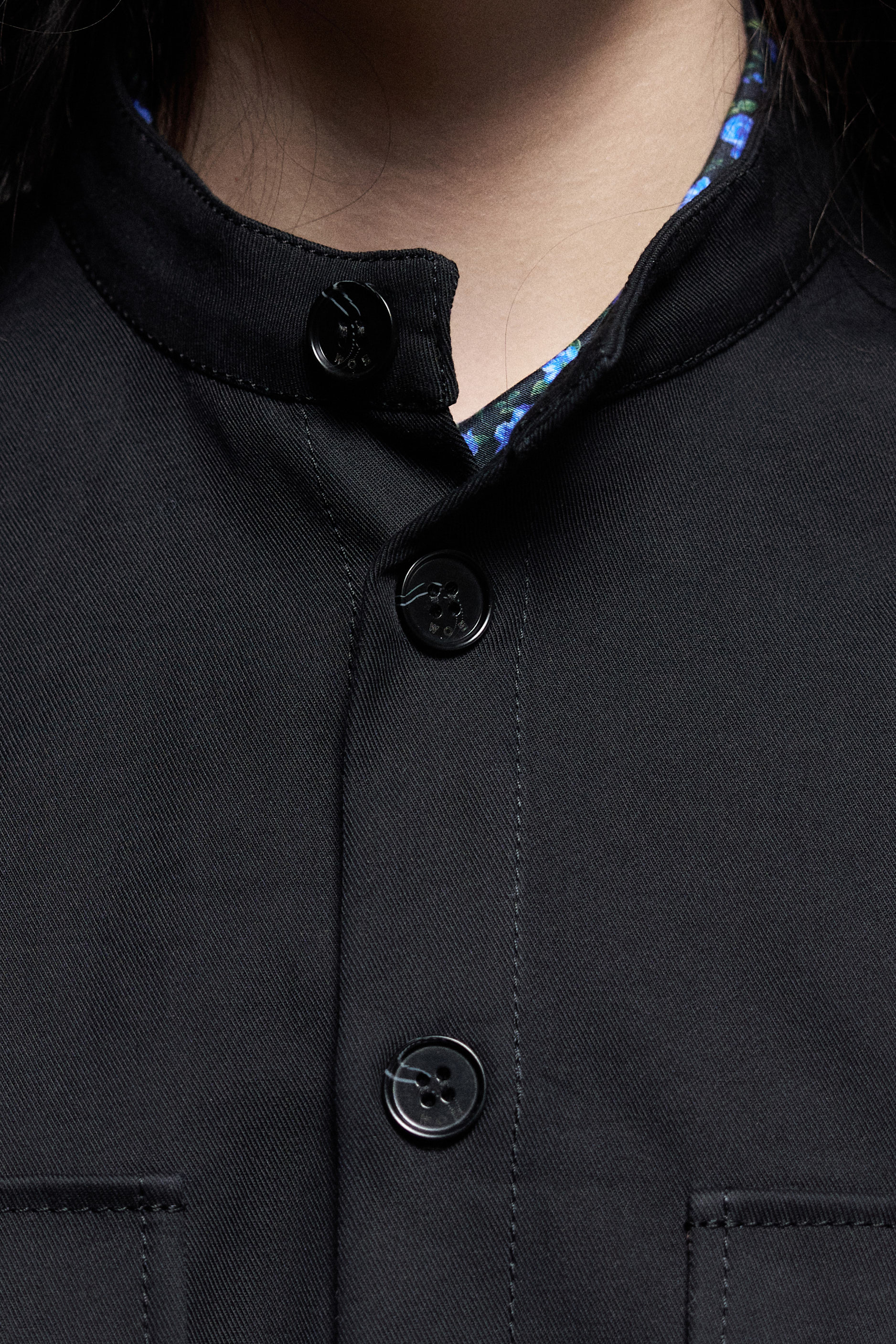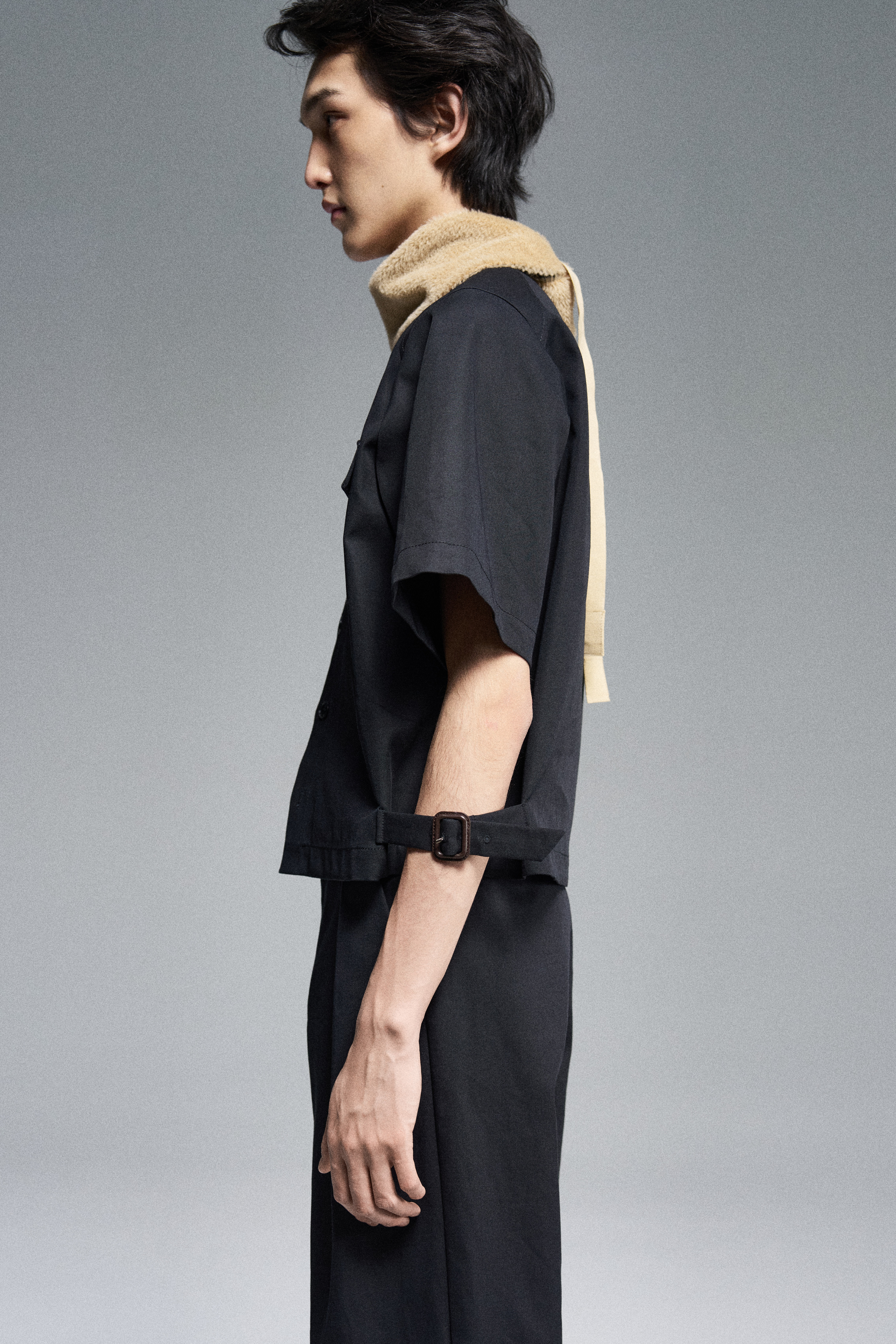 Рубашка прямого кроя из хлопка с пропиткой. Модель с нагрудными карманами и воротником-стойкой, вдохновлённая элементами классического тренча. Застёгивается на пуговицы. Боковые ремешки с кожаными пряжками позволяют регулировать объём и менять силуэт.