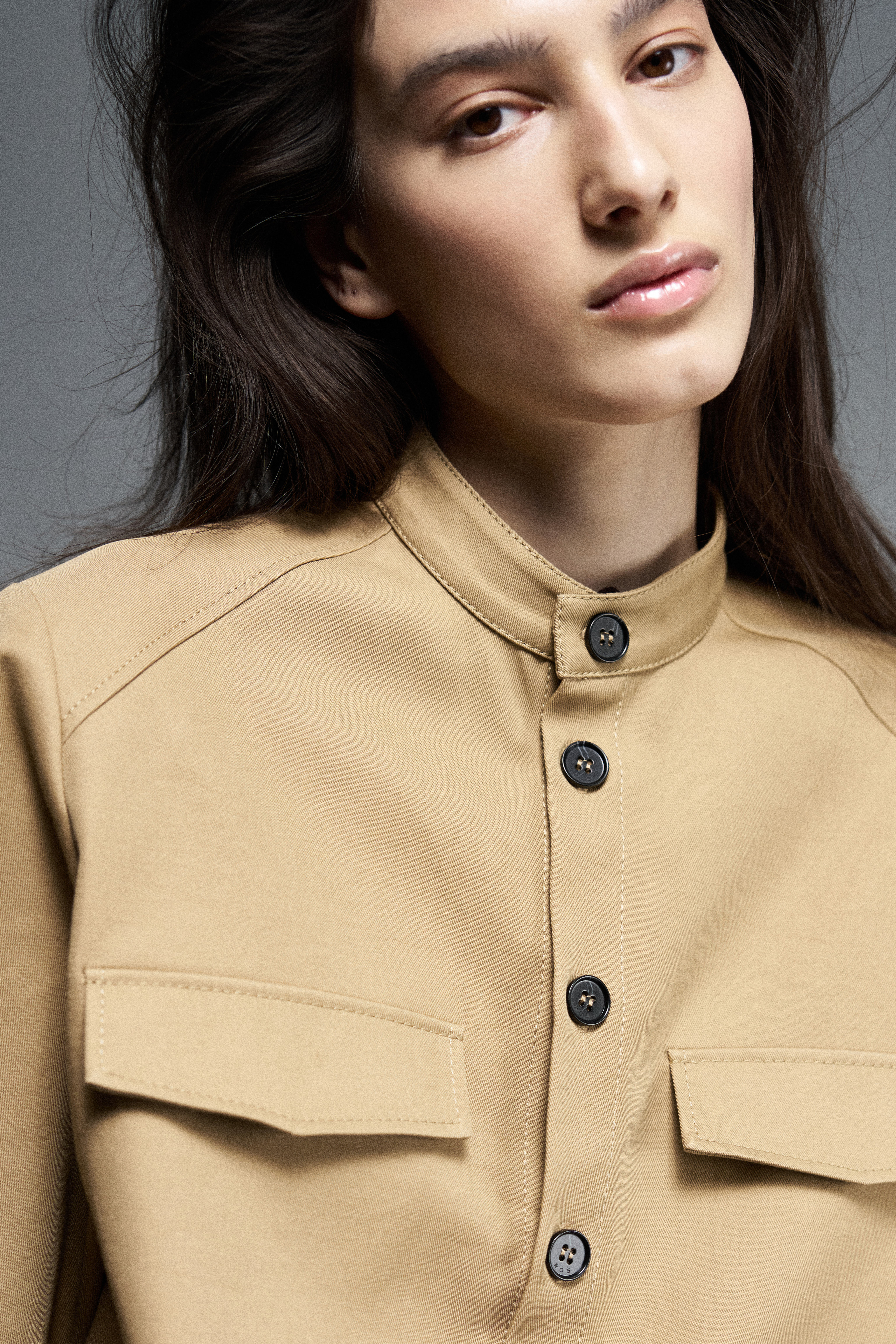 Рубашка прямого кроя из хлопка с пропиткой. Модель с нагрудными карманами и воротником-стойкой, вдохновлённая элементами классического тренча. Застёгивается на пуговицы. Боковые ремешки с кожаными пряжками позволяют регулировать объём и менять силуэт.