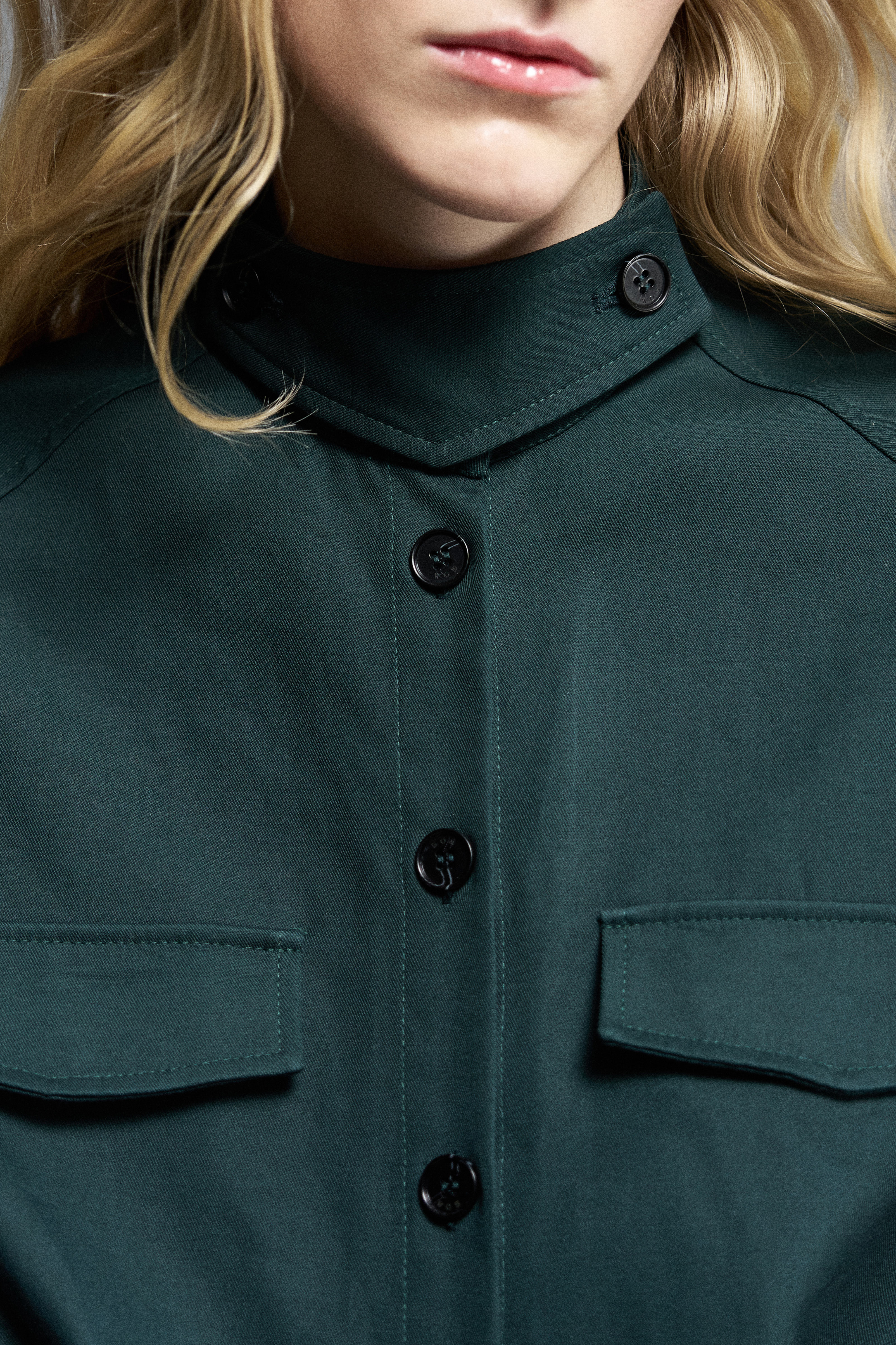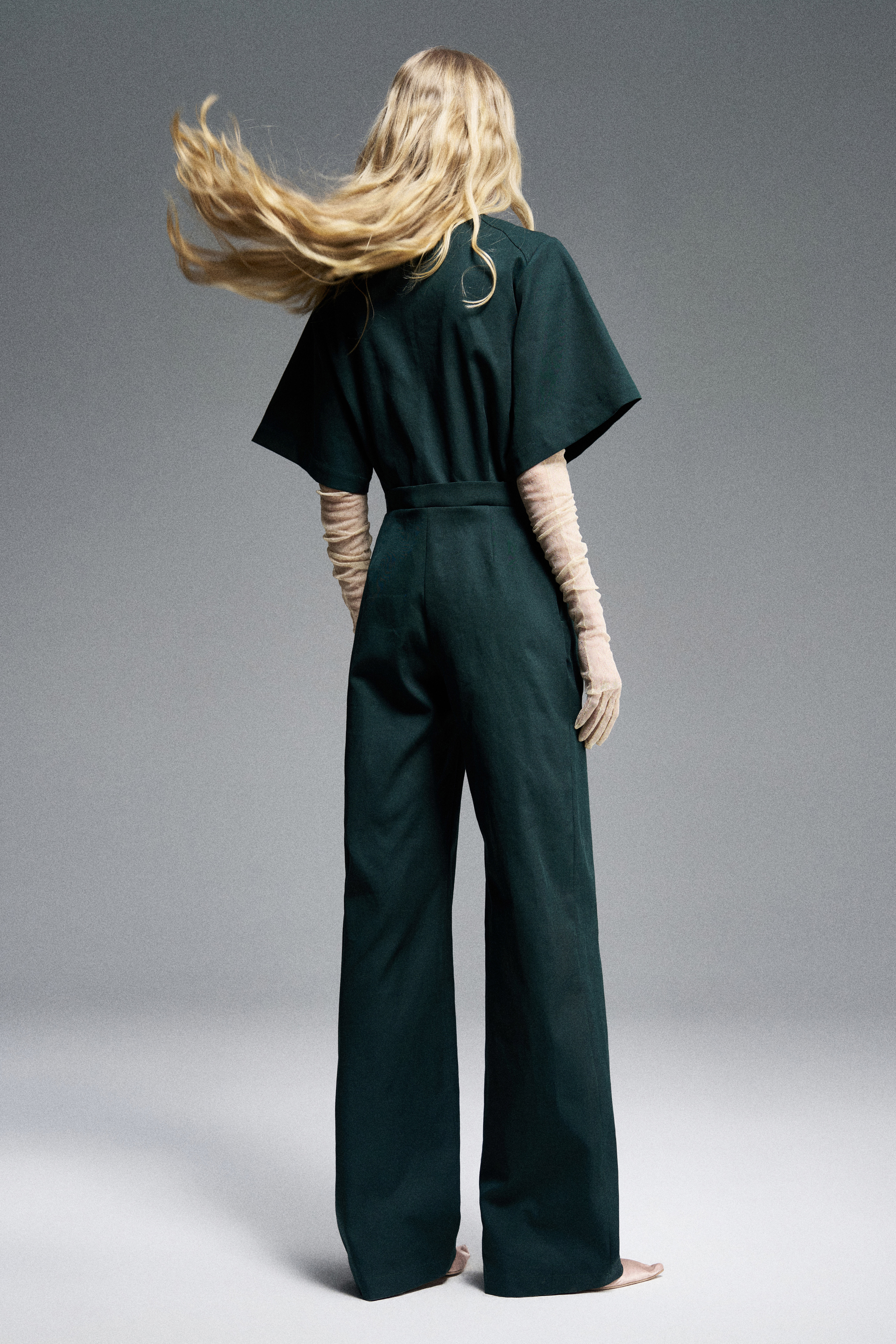 Комбинезон из технологичной ткани с влагозащитной пропиткой, сохраняющей форму изделия. Короткие широкие рукава, планка на пуговицах. Декоративные клапаны на груди и отстегивающийся элемент у горловины отсылают к утилитарной эстетике, а пояс выстраивает силуэт, балансируя объем.