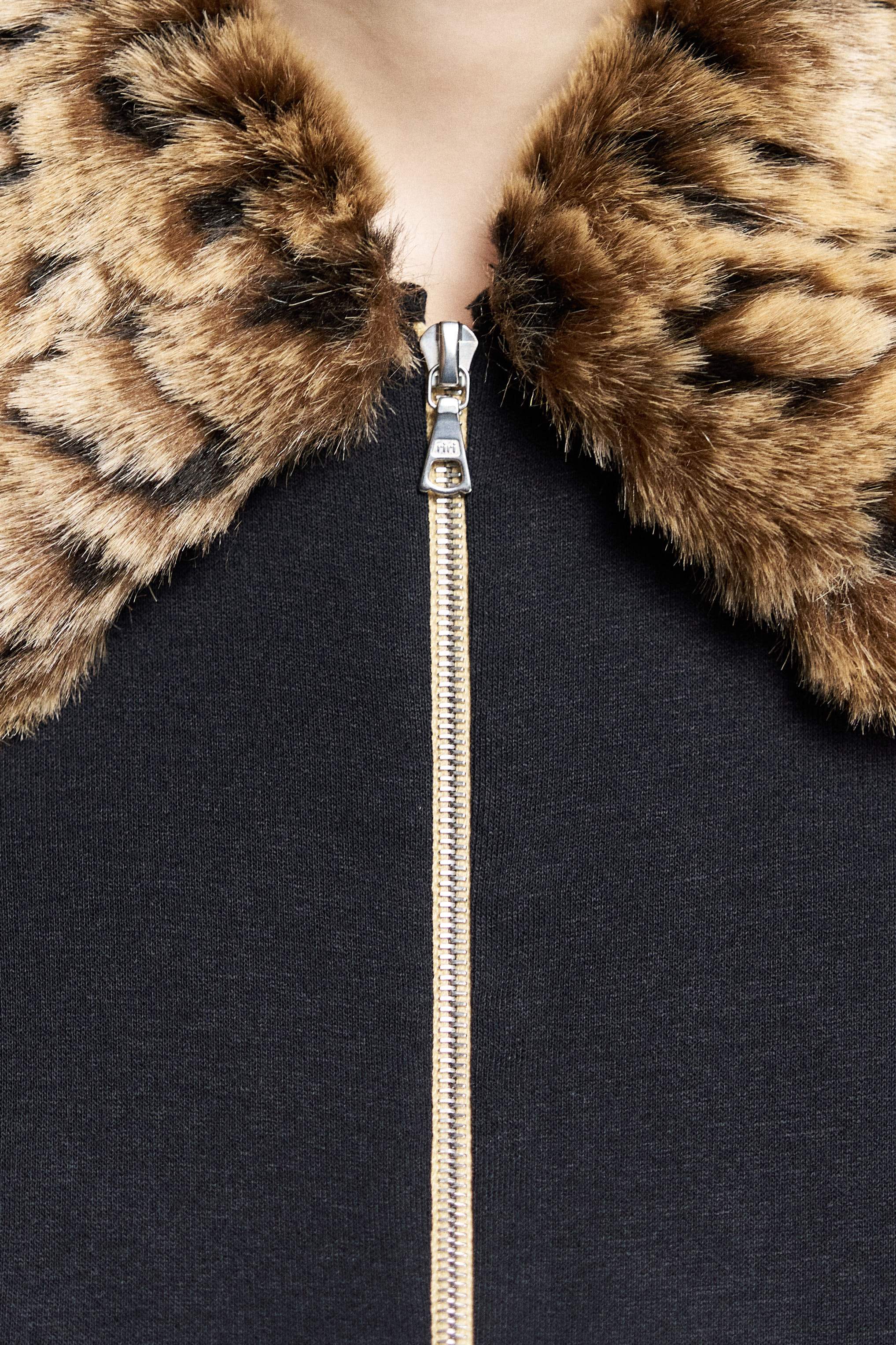 Двухфактурное мини-платье со вставками из кашкорсе и полупрозрачного джерси. Застёгивается на молнию RiRi. Модель дополнена воротником из меха переработанной альпаки.