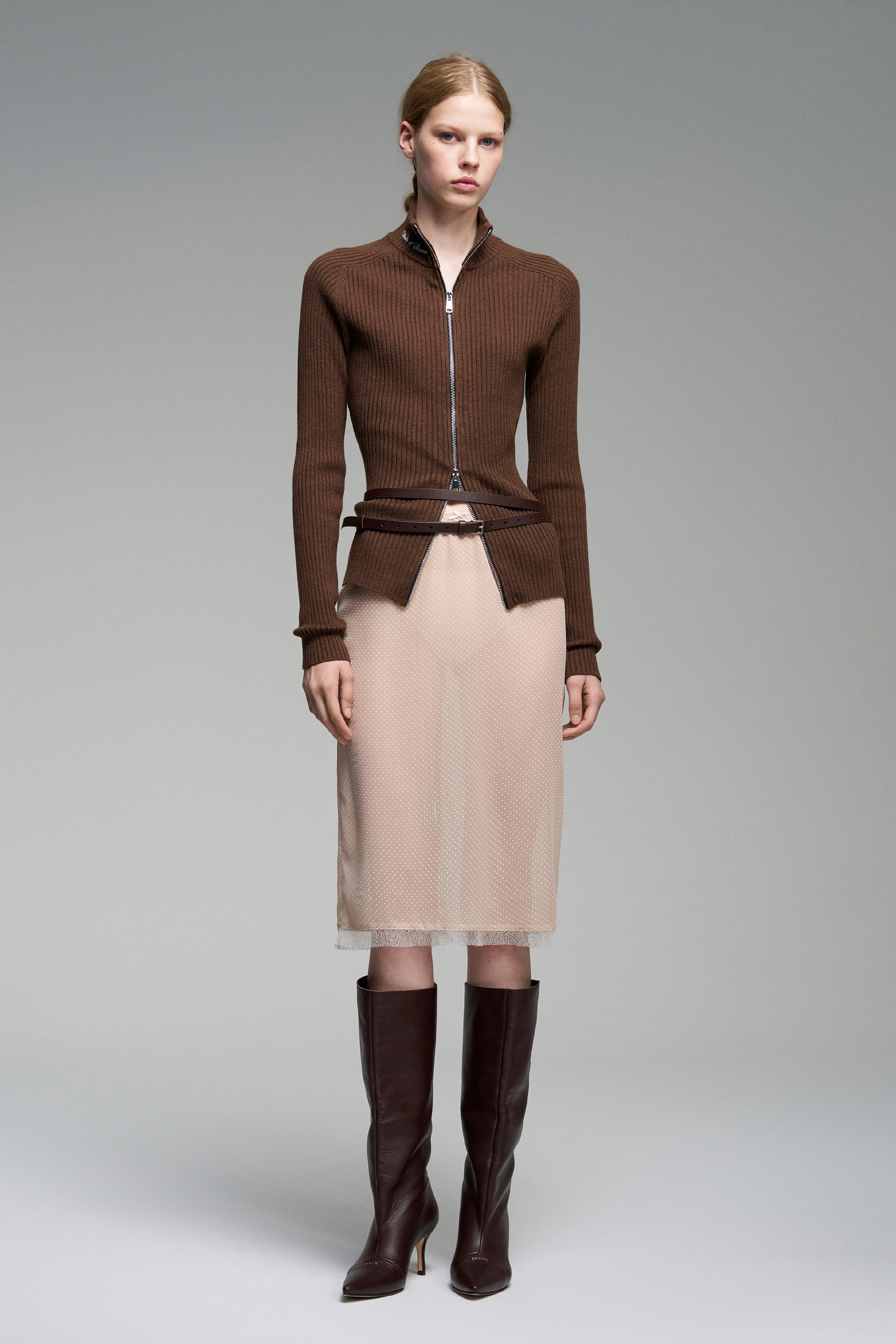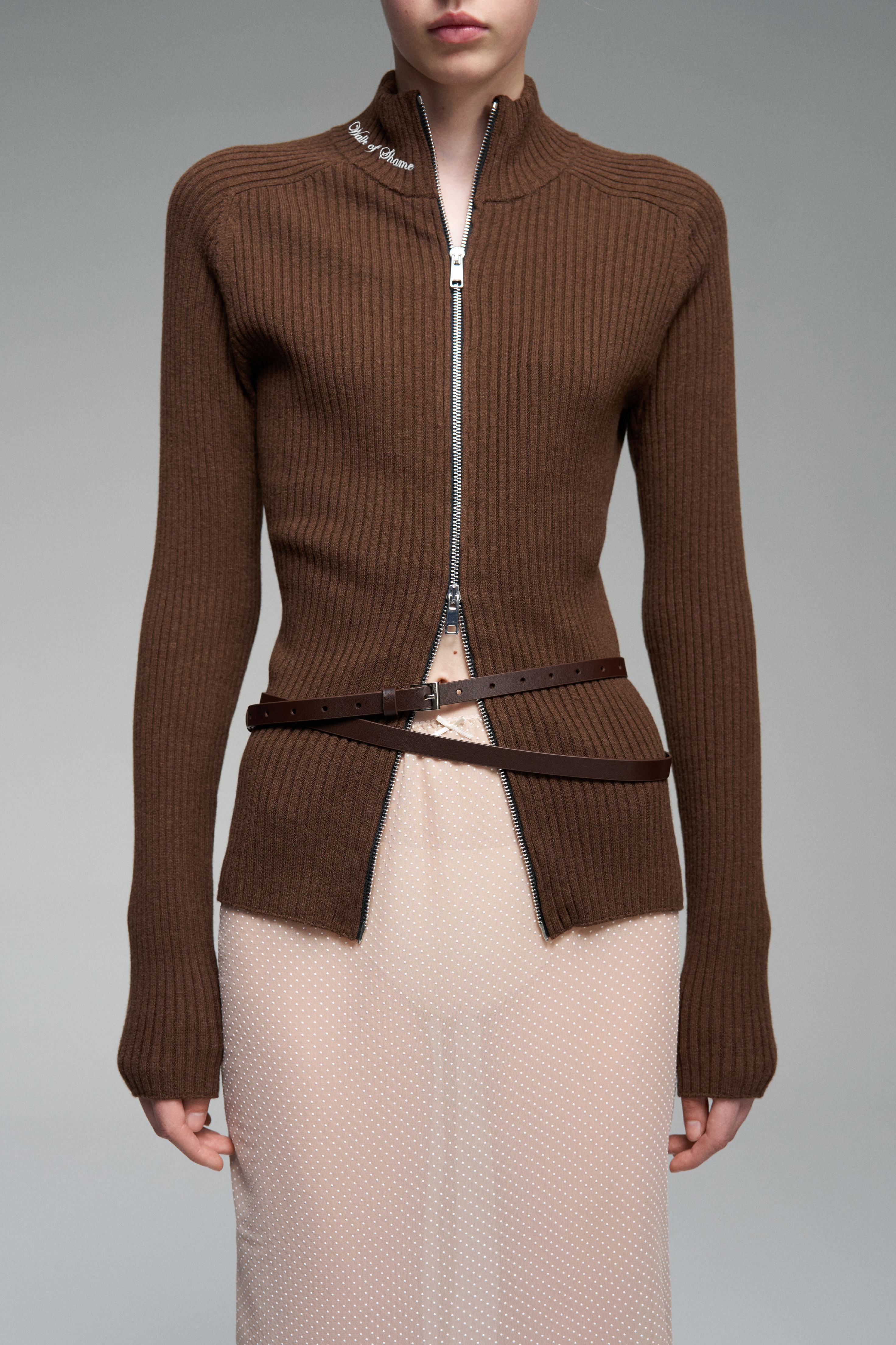 Кардиган коричневого цвета, трикотажный, прилегающего силуэта с молнией, регулируемой сверху и снизу. В качестве декоративного элемента используется репсовая лента с логотипом бренда вместе с традиционной вышивкой. Молнии Riri также украшены логотипом.