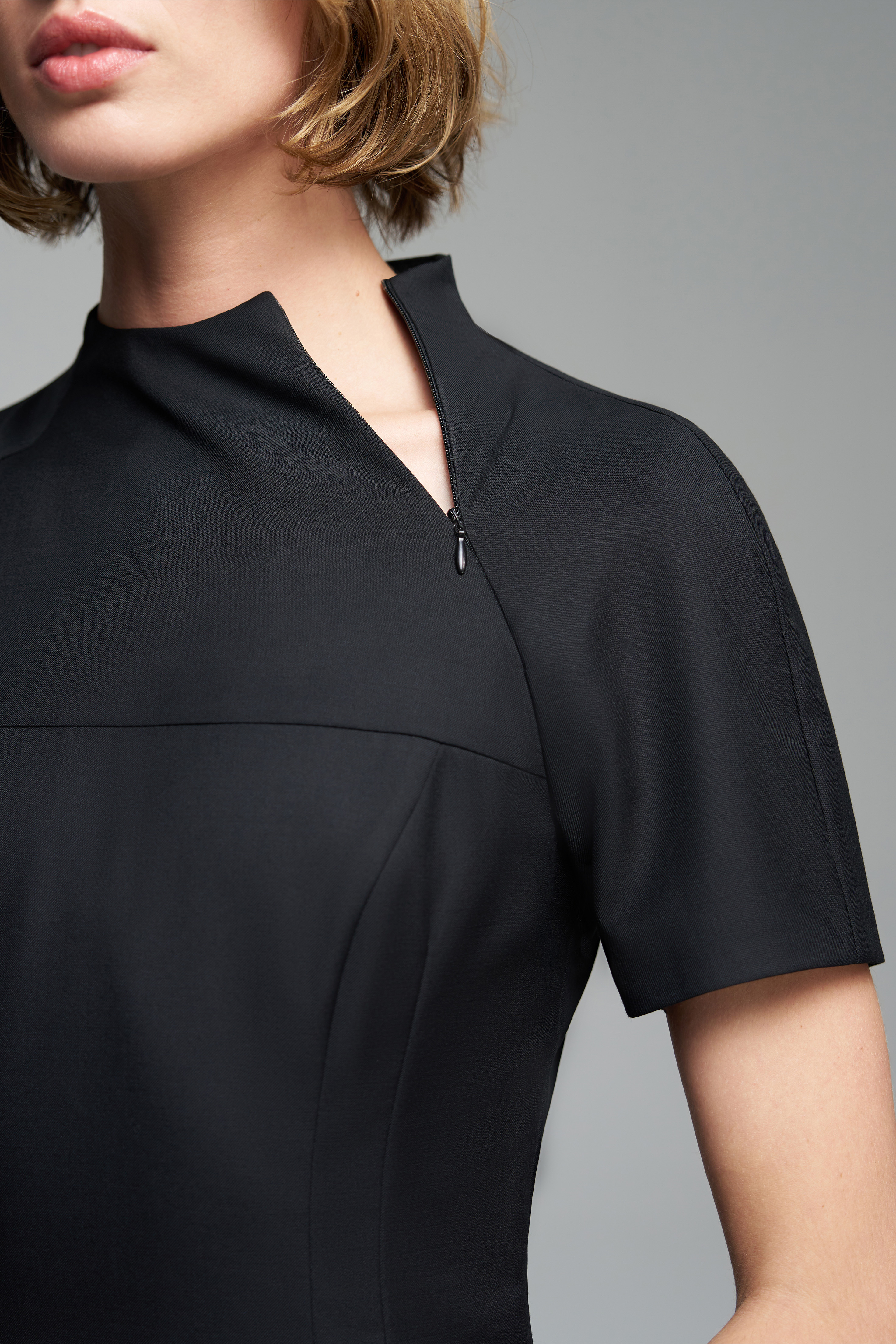 Платье мини из костюмной ткани. Приталенный силуэт, скрытая застёжка сбоку. На верхней части изделия — функциональная молния.
