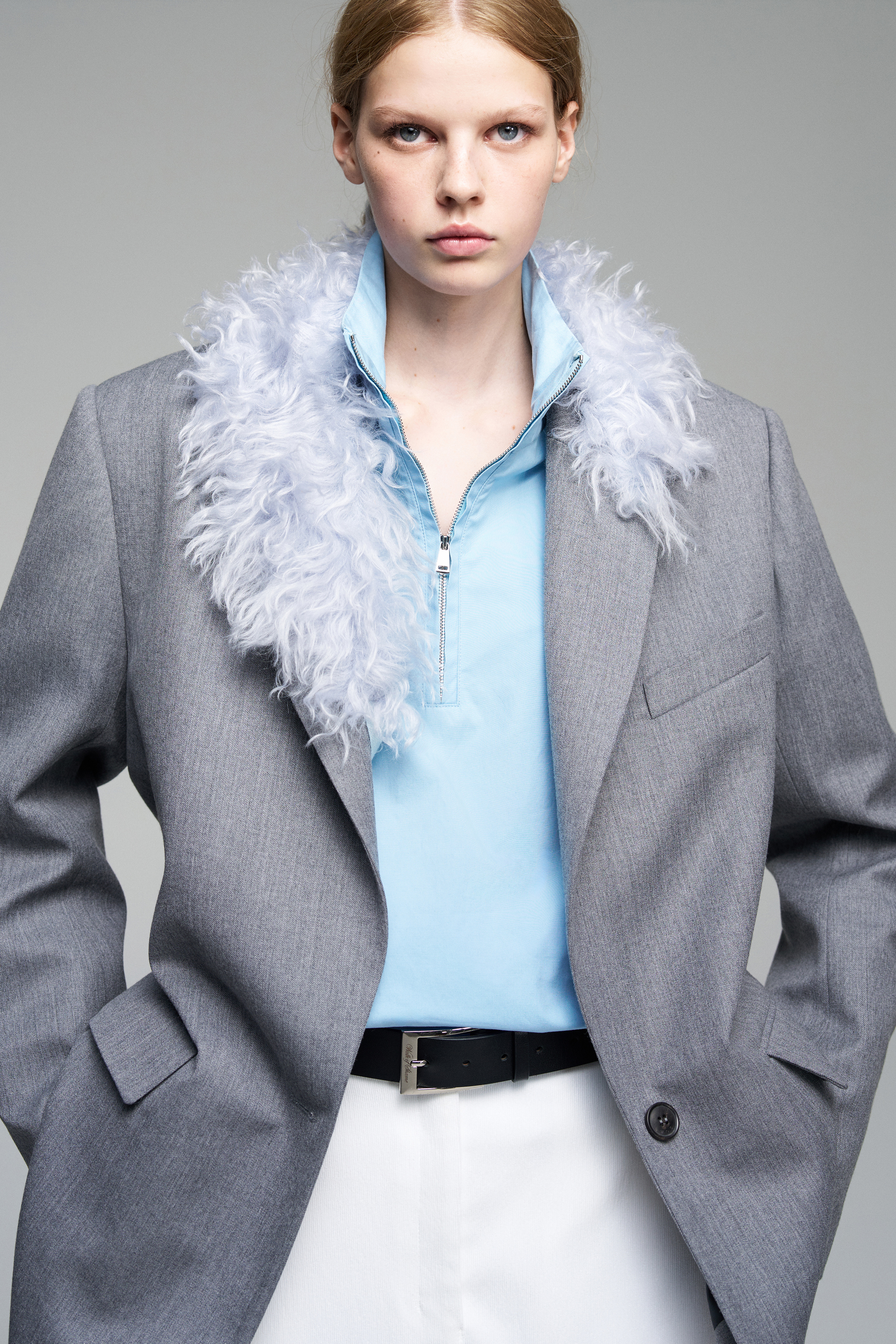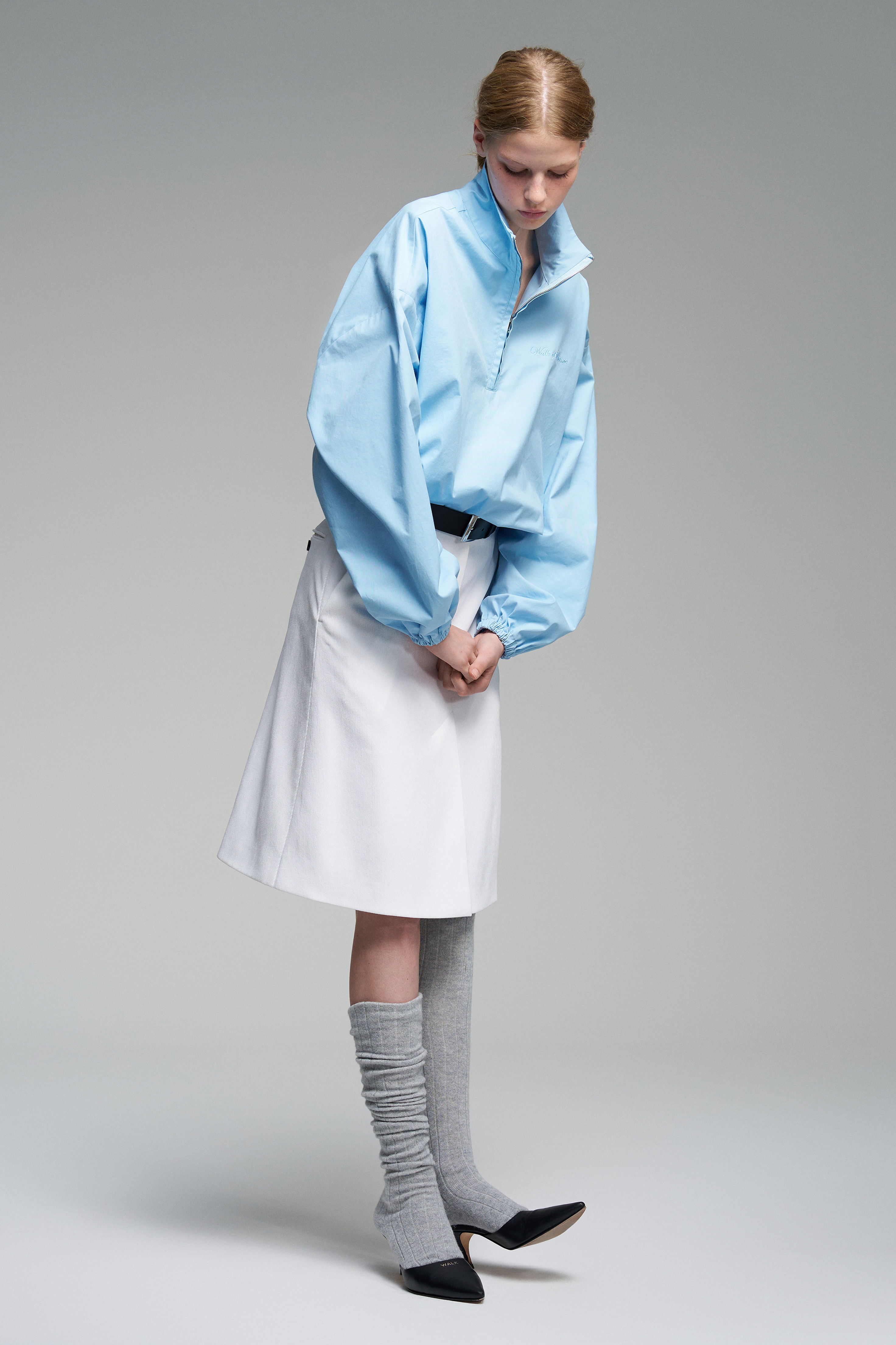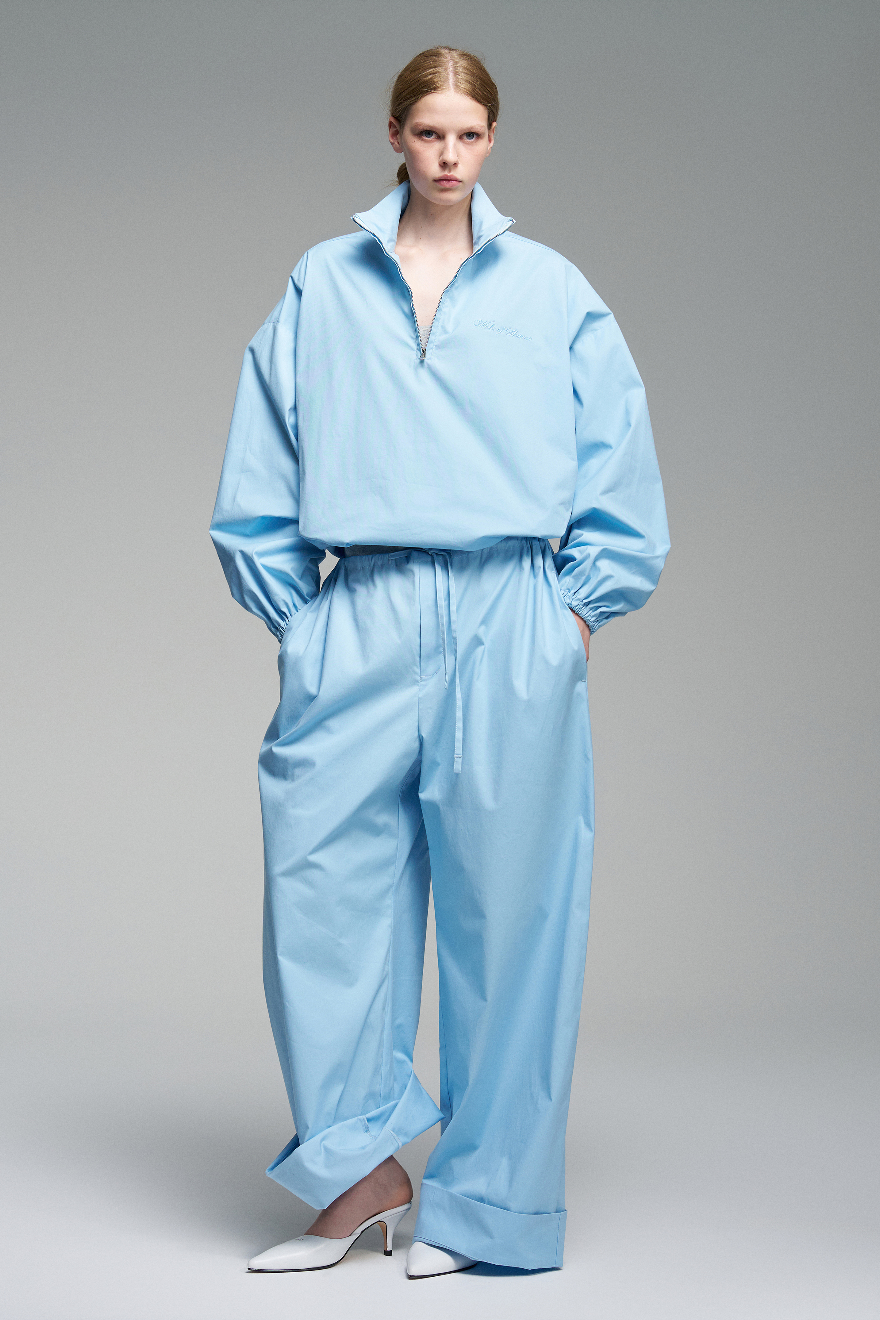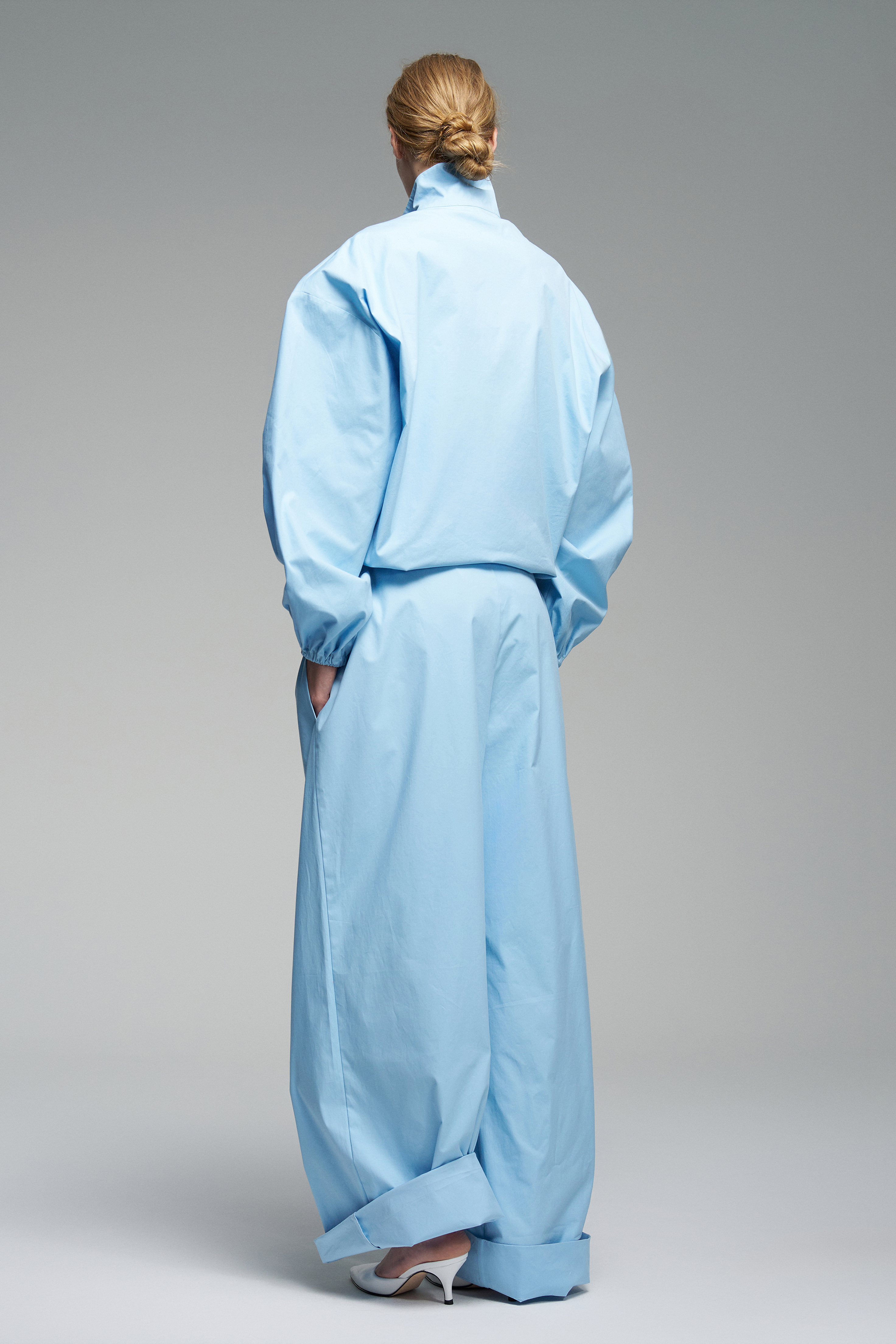 Анорак голубого цвета с воротником-шалькой на молнии. Низ собран на резинку для удобной посадки. Вышивка бренда выполнена в тон изделия.