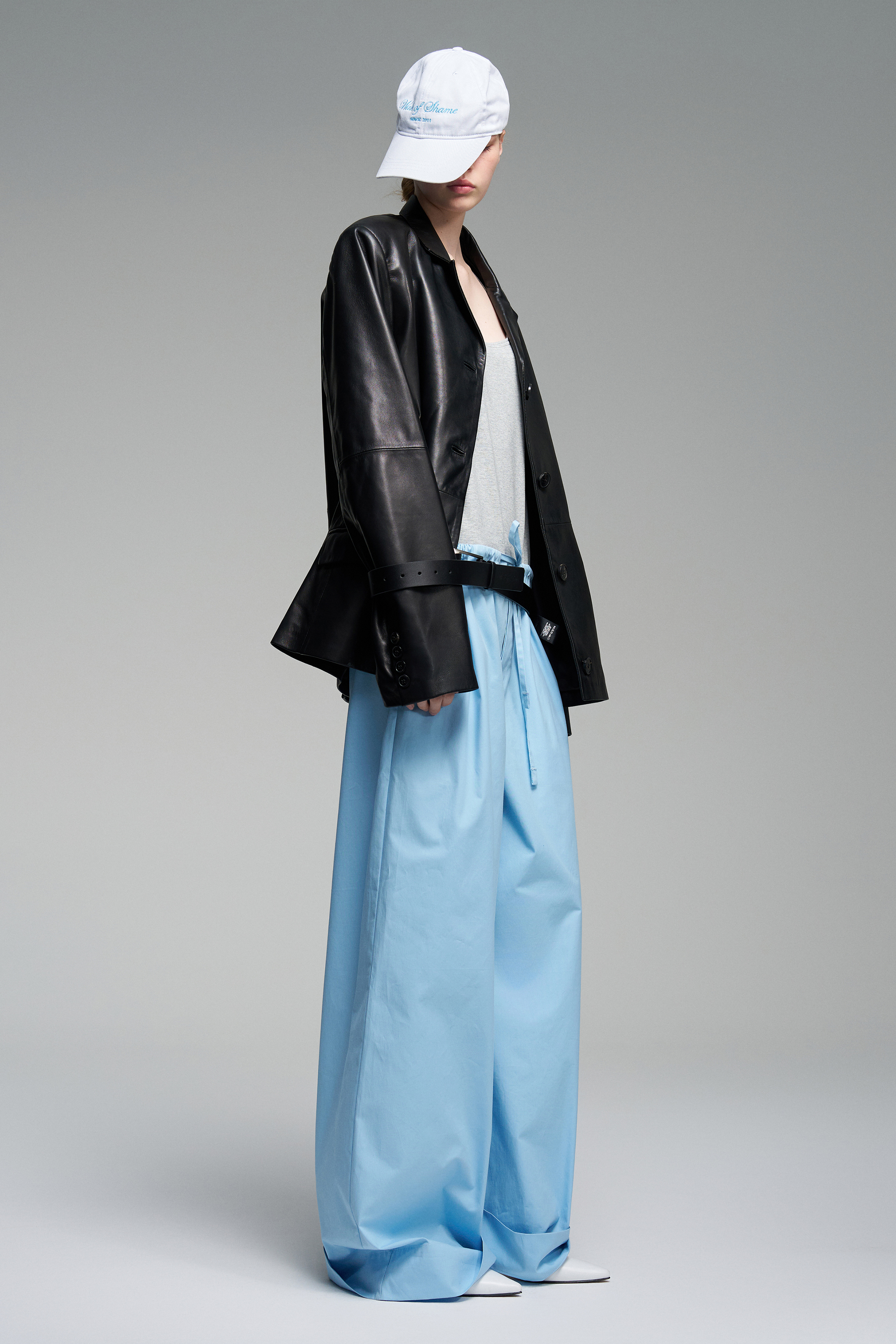 Прямые хлопковые брюки с поясом на резинке. По бокам — врезные карманы.