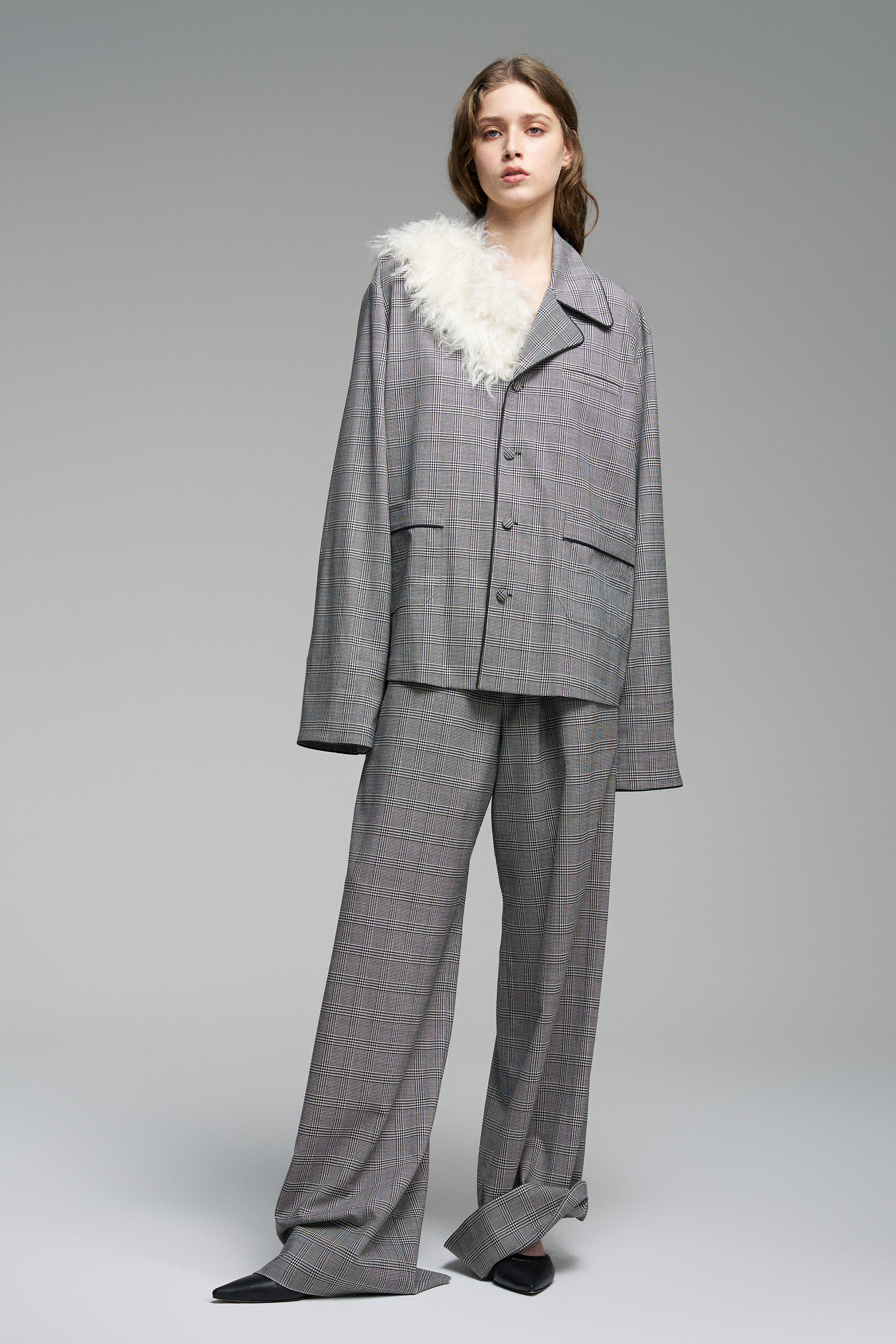 Пижамные брюки из тонкой шерсти в клетку. Пояс на шнурке позволяет регулировать посадку. По бокам расположены карманы.
