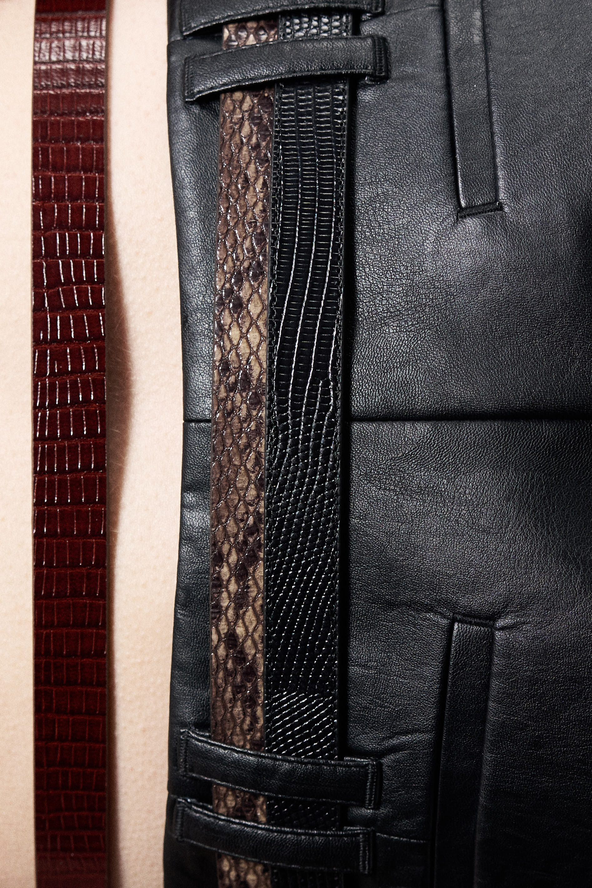 Короткие шорты из экокожи. Широкие шлевки для ремня. Передние карманы и декоративные листочки сзади. Застежка на скрытые молнию, пуговицу и крючок.